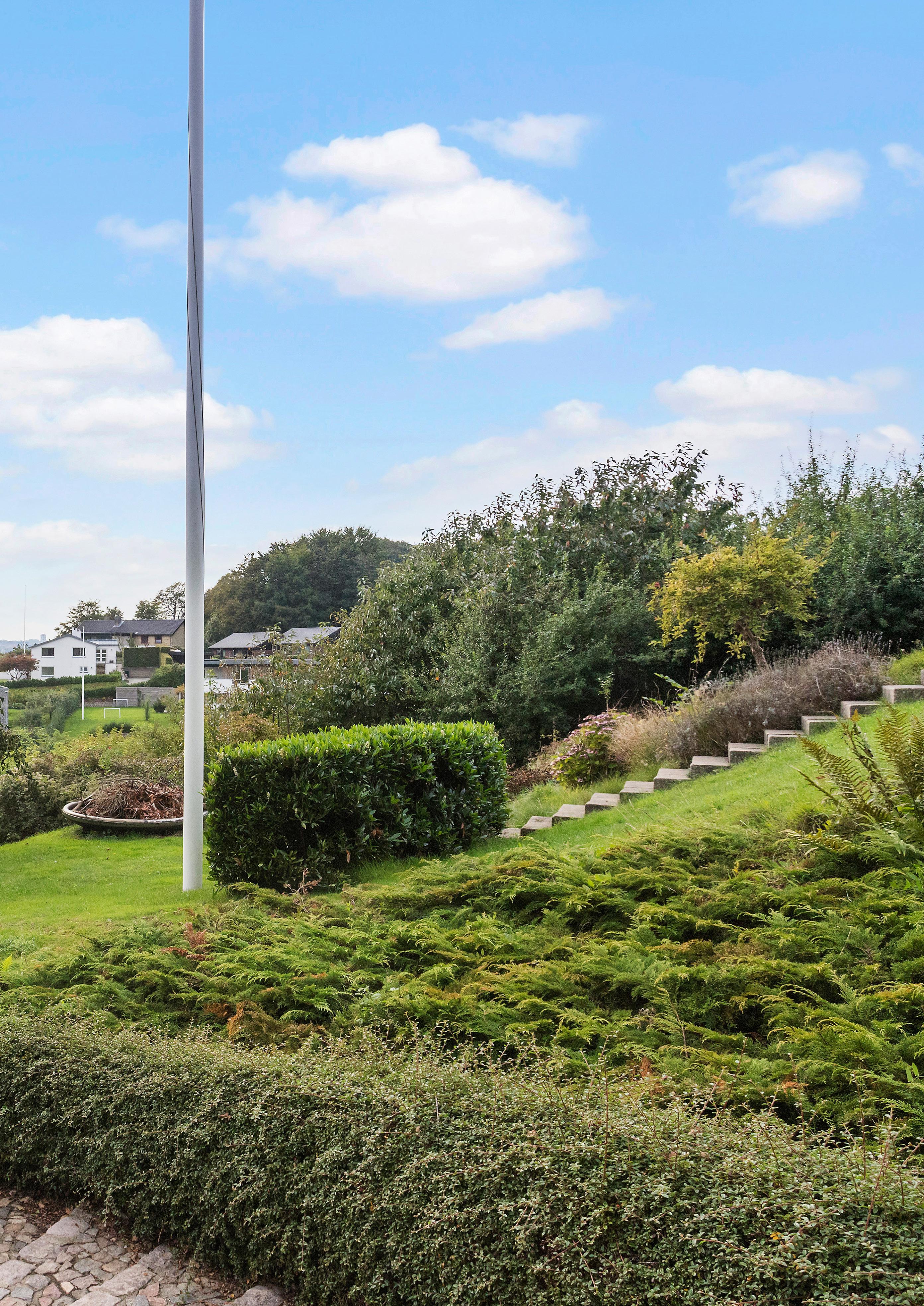 Når du ankommer til villaen, fører den smukke, stenbelagte trappe dig op til hovedindgangen, hvor du straks må stoppe op og nyde den betagende udsigt over Kolding Fjord. Allerede fra denne position på toppen af skråningen fornemmer du, hvordan fjorden strækker sig foran dig, og skoven giver en rolig baggrund – en smuk kombination, der indrammer huset.