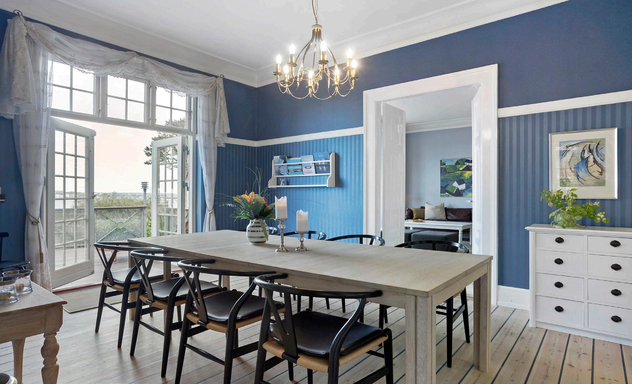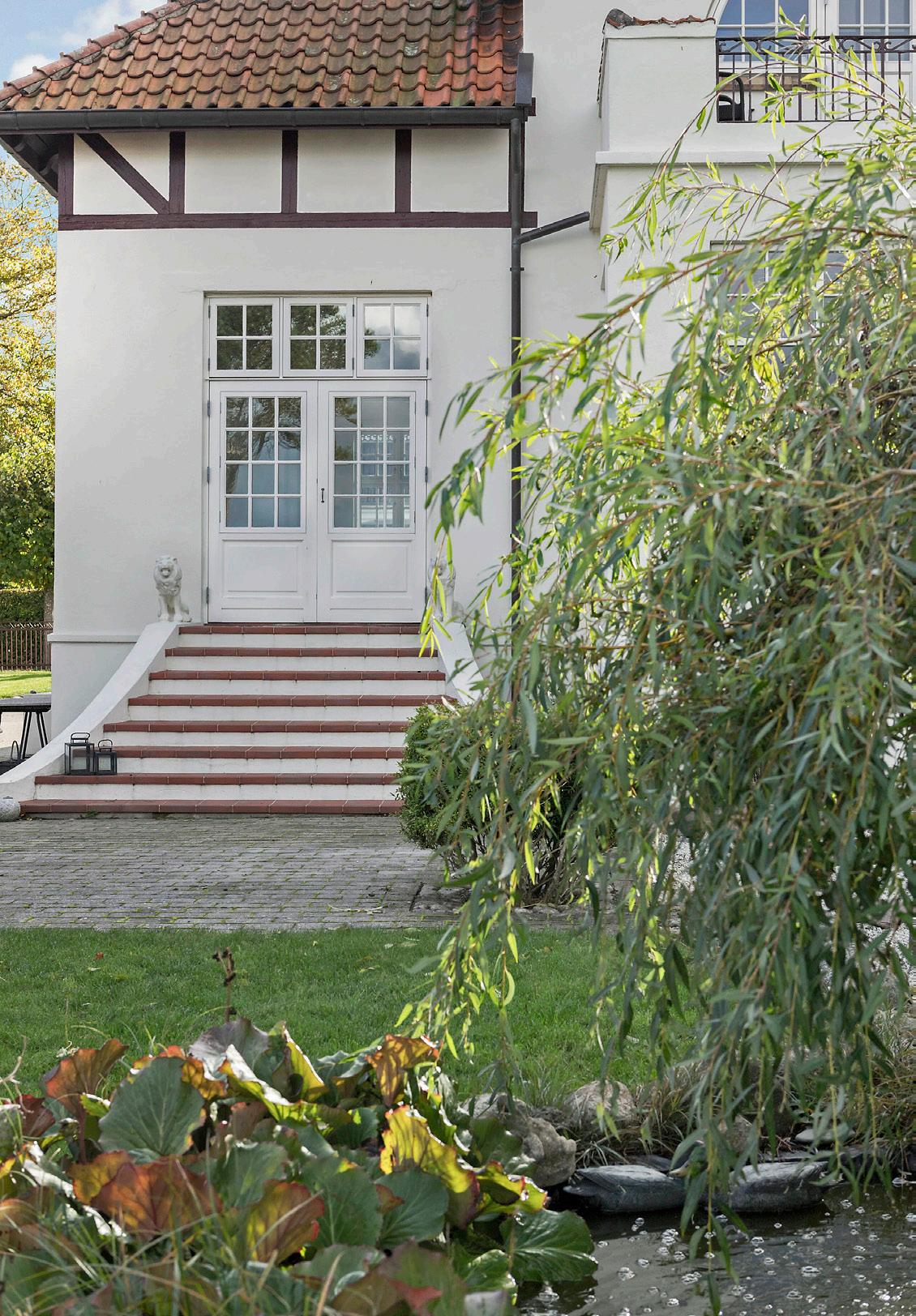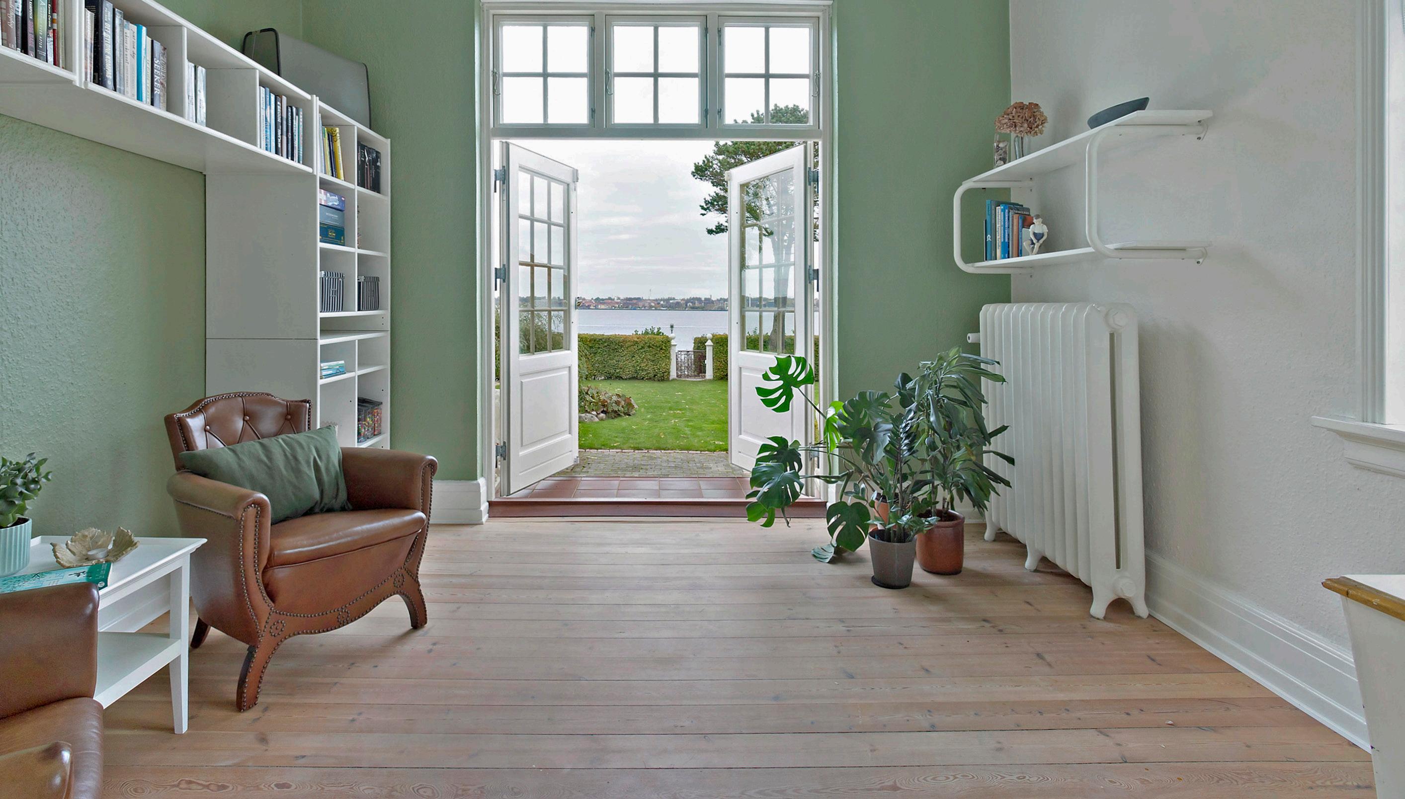 Med karakteristiske plankegulve, småsprossede vinduespartier og en loftshøjde på mere end tre meter er der en uforlignelig atmosfære. Skønne dobbeltdøre forbinder de fleste rum i stueplan, hvilket giver et lyst og rummeligt indtryk.
