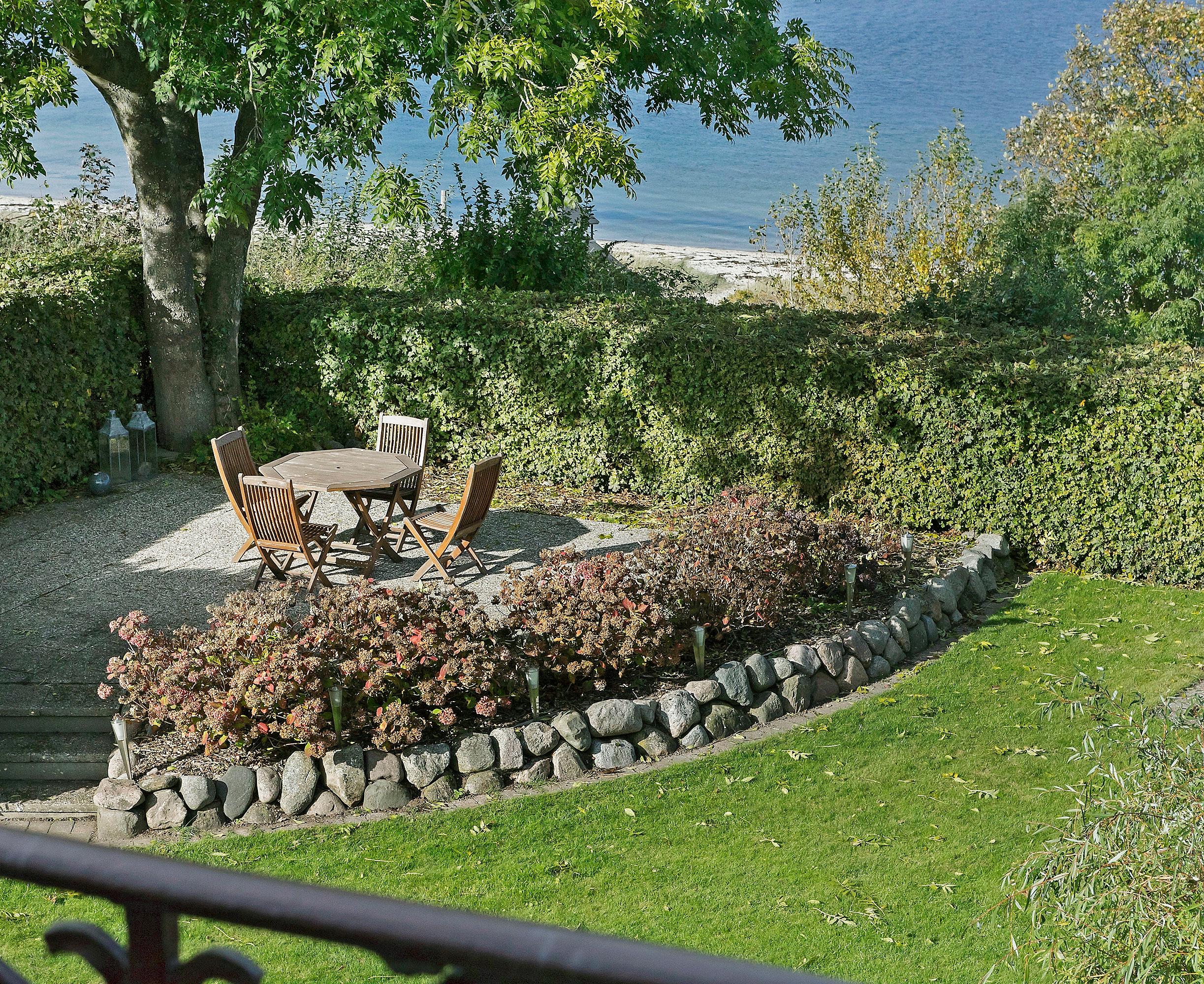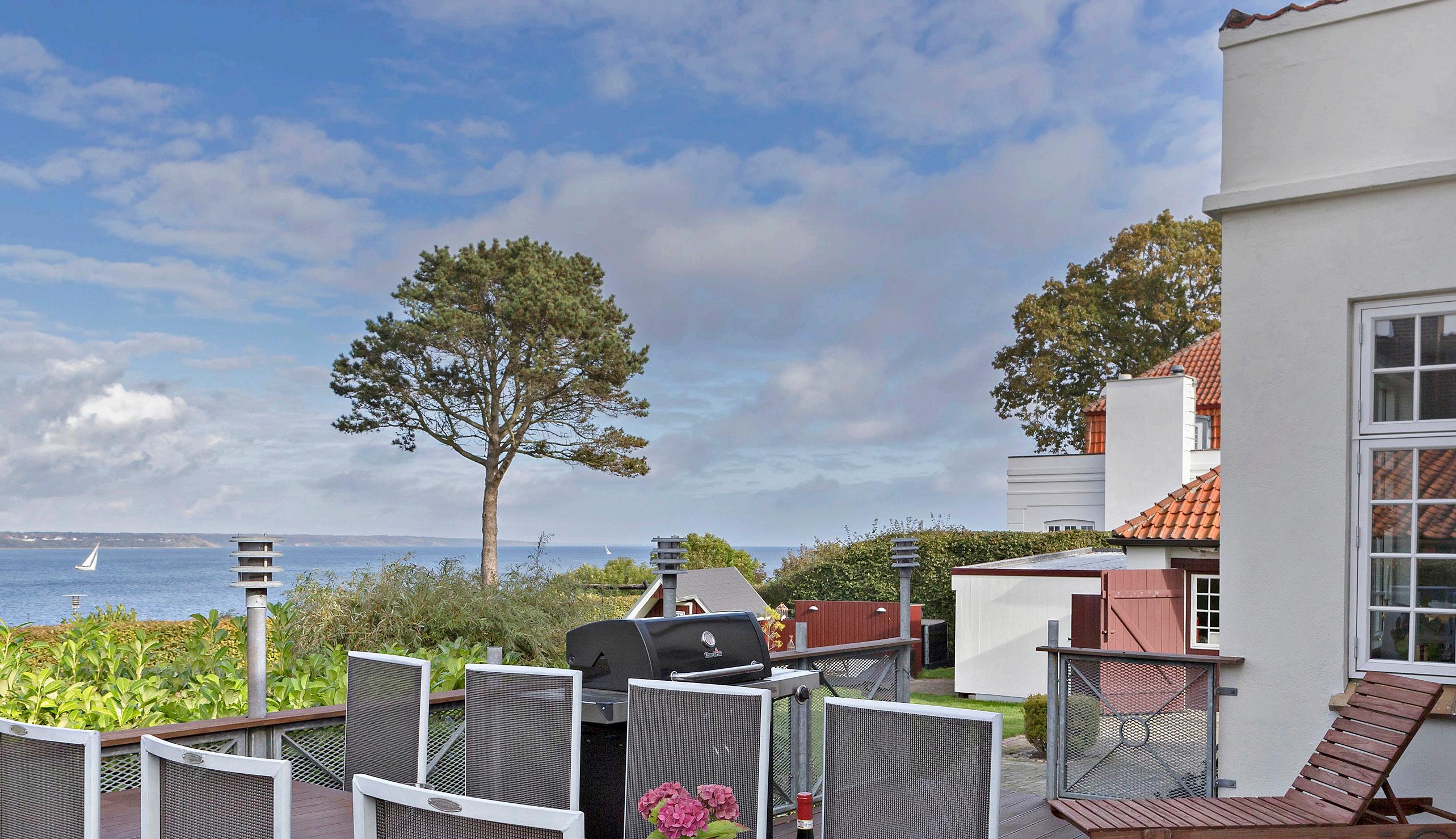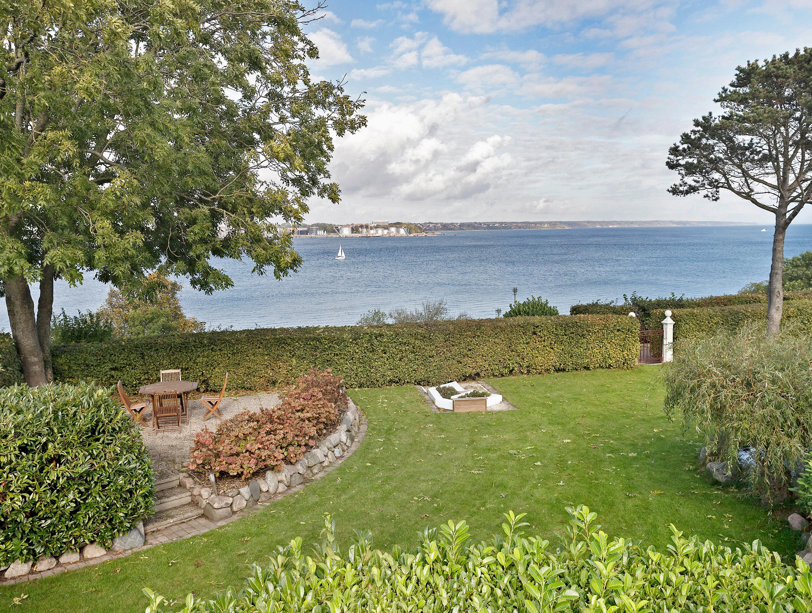 Tillige får man her fornøjelsen af en omfangsrig have, samt strandgrunden der breder sig over det kuperede terræn i retning af vandet, og ligeledes ses en hævet terrasse med tilsvarende perfekt placering i henhold til sol og udsigt.