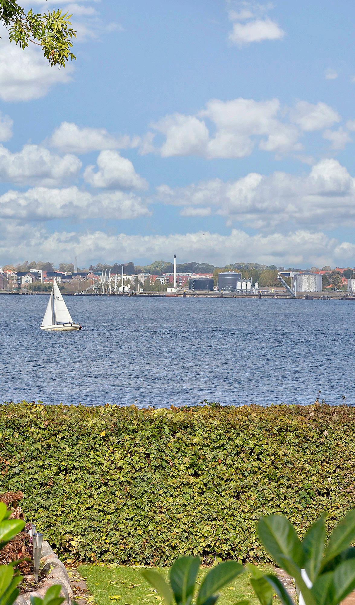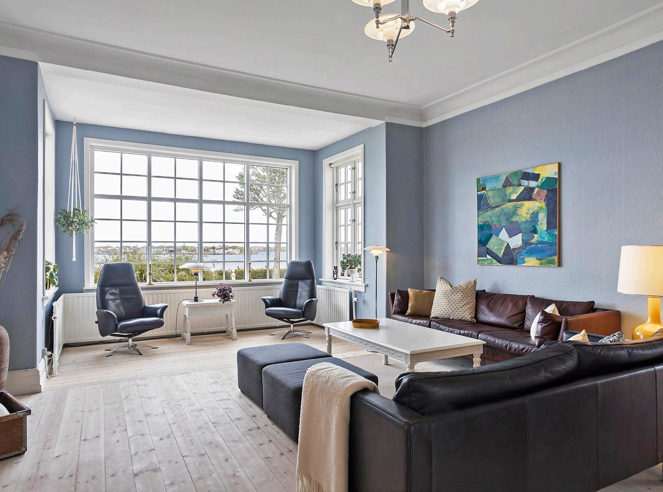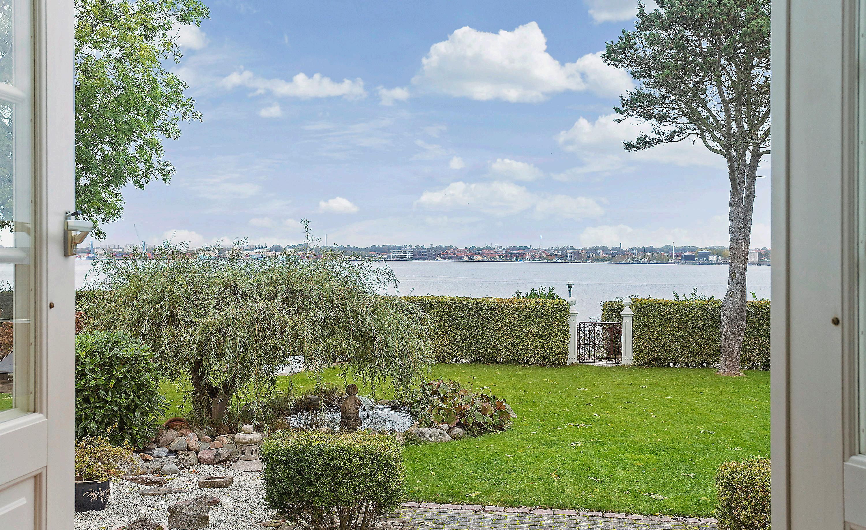 Også indenfor sætter udsigten sit umisforståelige aftryk på stemningen. Villaen ligger højt, så det imponerende vue over vandet er intakt både fra stueplan og fra første sal. Efter solnedgang skaber lyset fra Fredericia en smuk baggrundskulisse, ligesom agterlanterne på de langsommelige fragtskibe vugger roligt i mørket. Man bydes velkommen i en hall, hvor der er lagt nye klinker i samme farve som bindingsværket udenfor. Herfra samles man helt naturligt i de store stuer en suite der vender mod vandet, og stuer er der flere af. Sælger har dermed også valgt at indrette nogle af dem til soveværelser. I den midterste udsigtsstue er der en skøn brændeovn, mens der fra biblioteket, køkkenet og spisestuen er direkte udgang til terrassen.