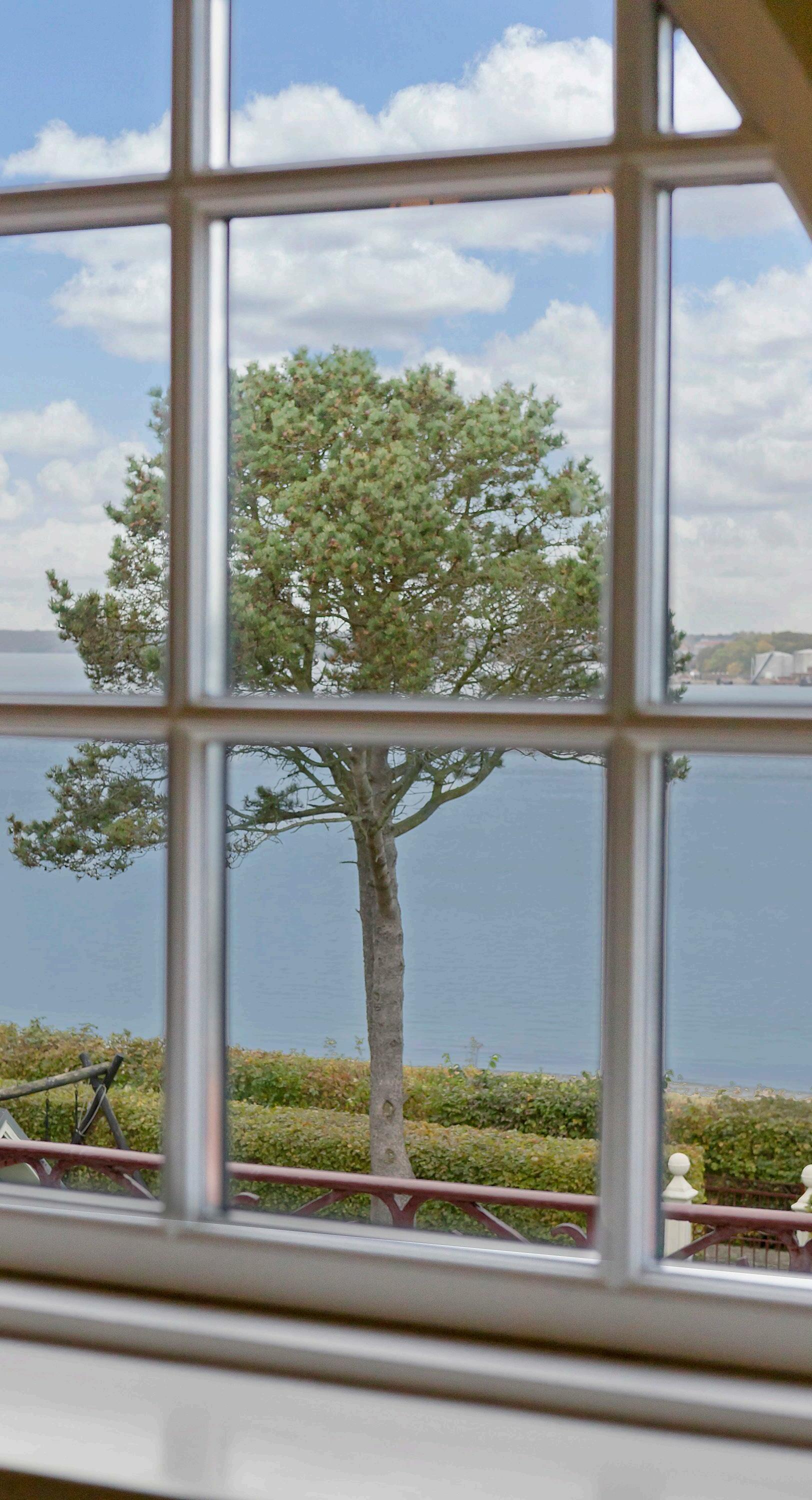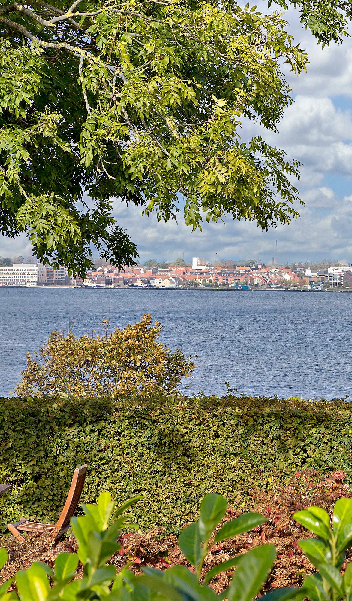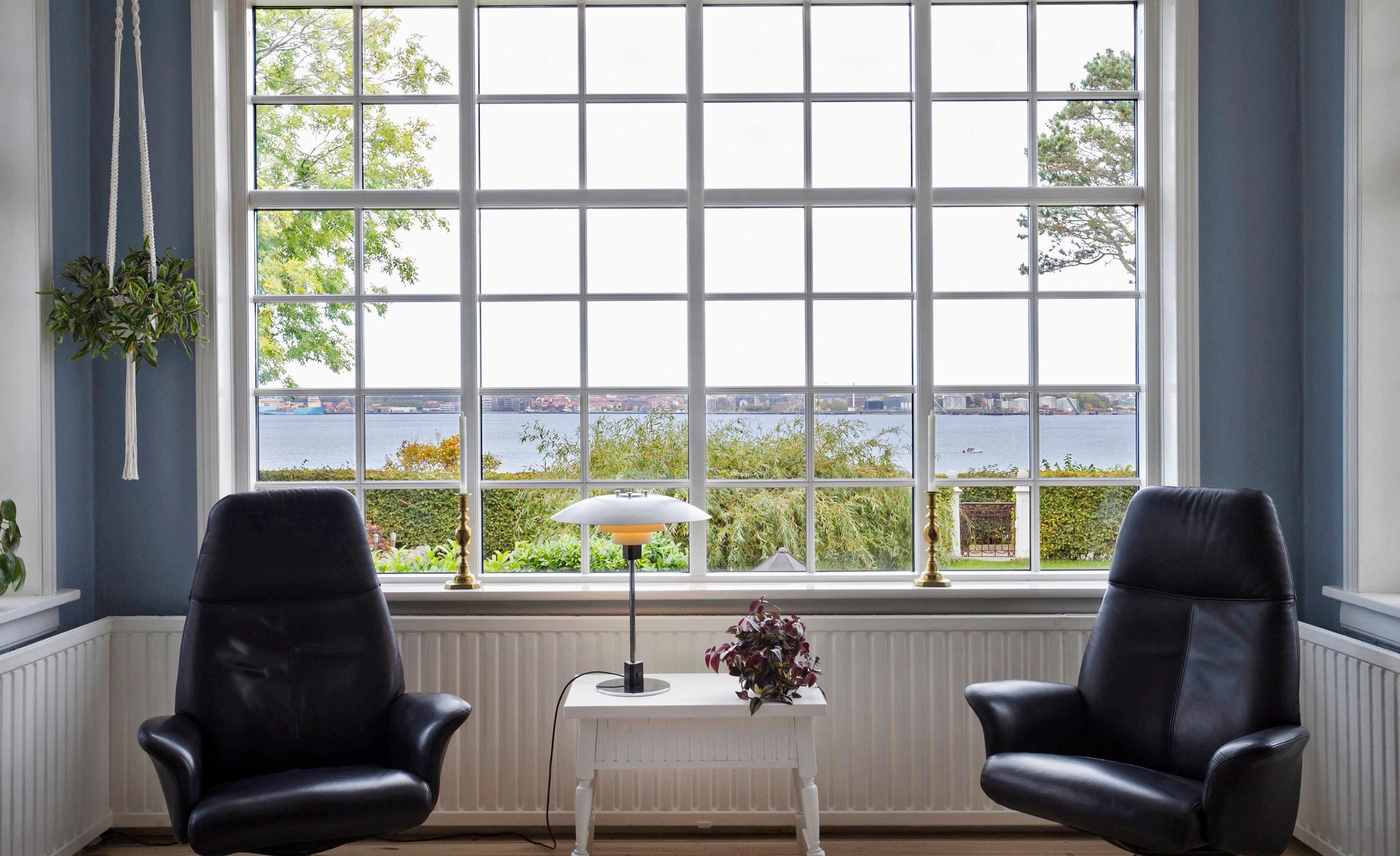 Også indenfor sætter udsigten sit umisforståelige aftryk på stemningen. Villaen ligger højt, så det imponerende vue over vandet er intakt både fra stueplan og fra første sal. Efter solnedgang skaber lyset fra Fredericia en smuk baggrundskulisse, ligesom agterlanterne på de langsommelige fragtskibe vugger roligt i mørket. Man bydes velkommen i en hall, hvor der er lagt nye klinker i samme farve som bindingsværket udenfor. Herfra samles man helt naturligt i de store stuer en suite der vender mod vandet, og stuer er der flere af. Sælger har dermed også valgt at indrette nogle af dem til soveværelser. I den midterste udsigtsstue er der en skøn brændeovn, mens der fra biblioteket, køkkenet og spisestuen er direkte udgang til terrassen.