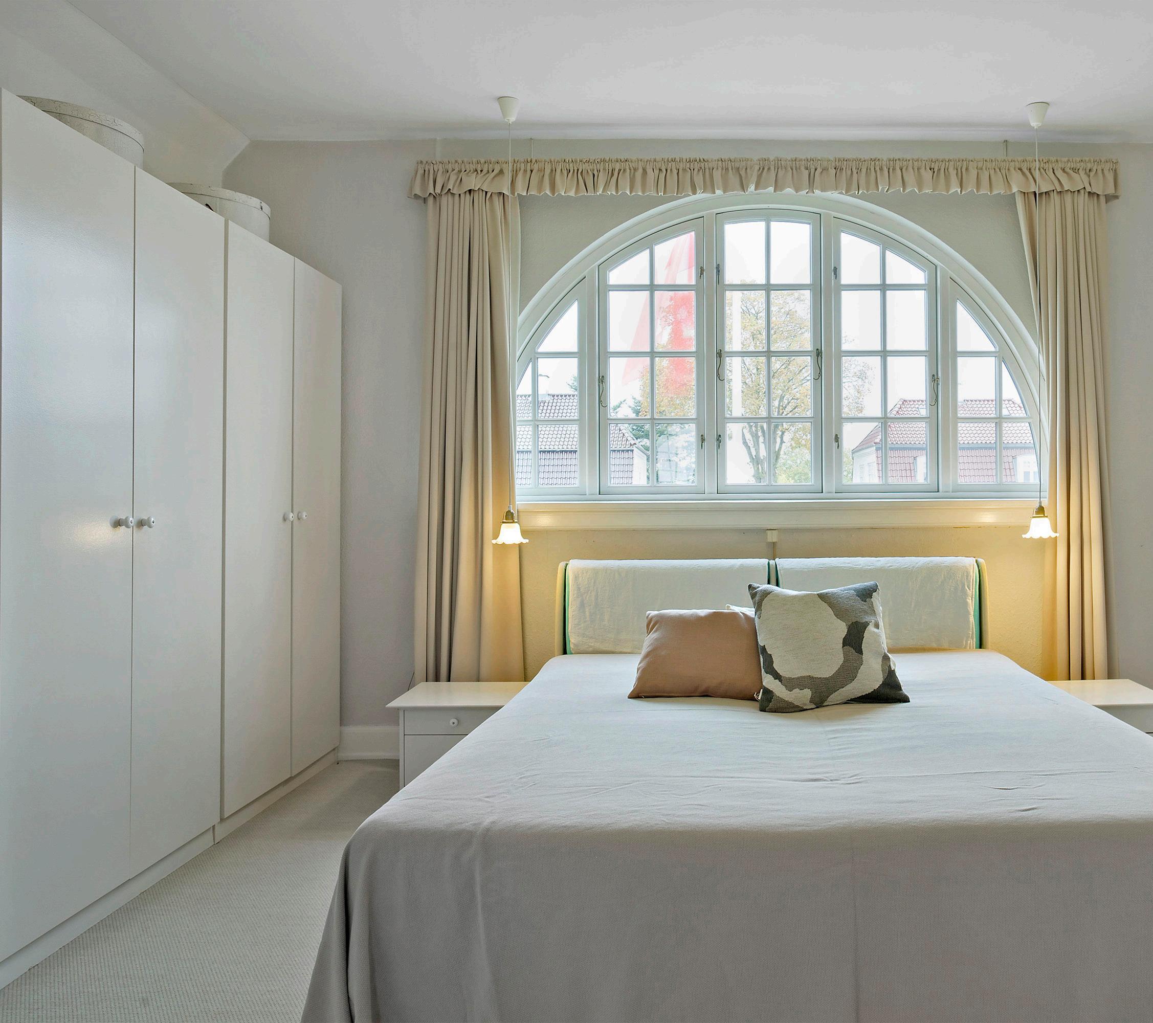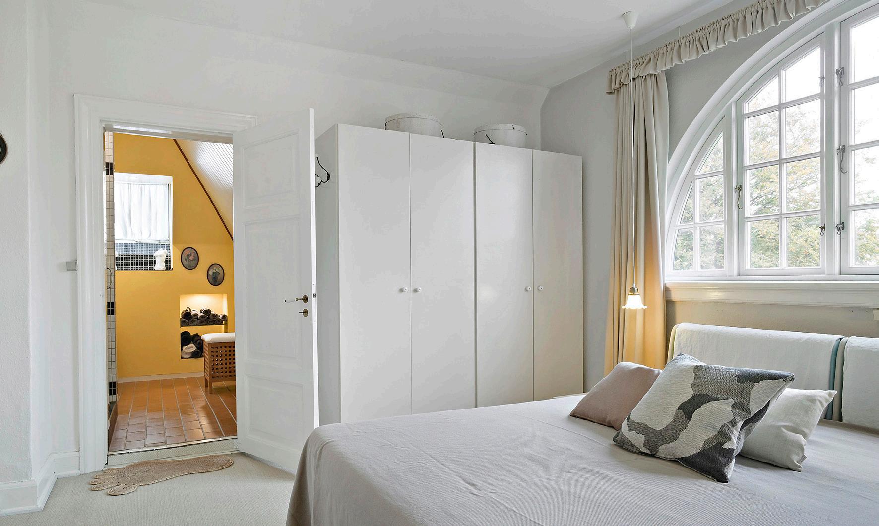 Den skønne master suite har rigelig af skabsplads samt ensuite badeværelse med brus. Fra alle rum er der en skøn udsigt henholdsvis over Lillebælt og Stribs smukke landskab. Bemærk hvordan det buede vinduesparti danner et smukt sengegærde. Her kan man vågne op og nyde morgenkaffen med morgensolens stråler der falder blidt på dynen.
