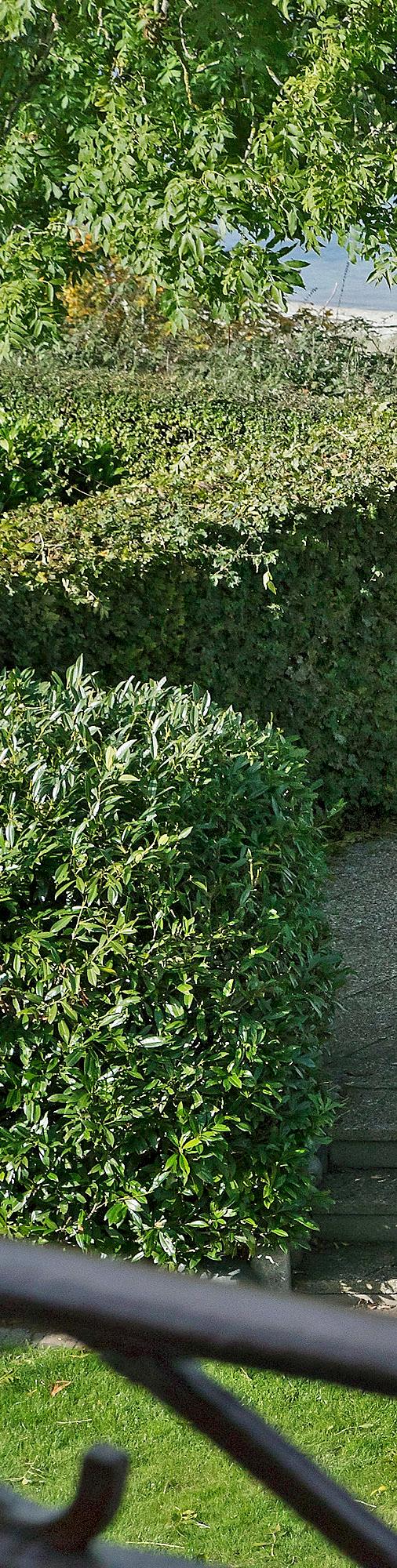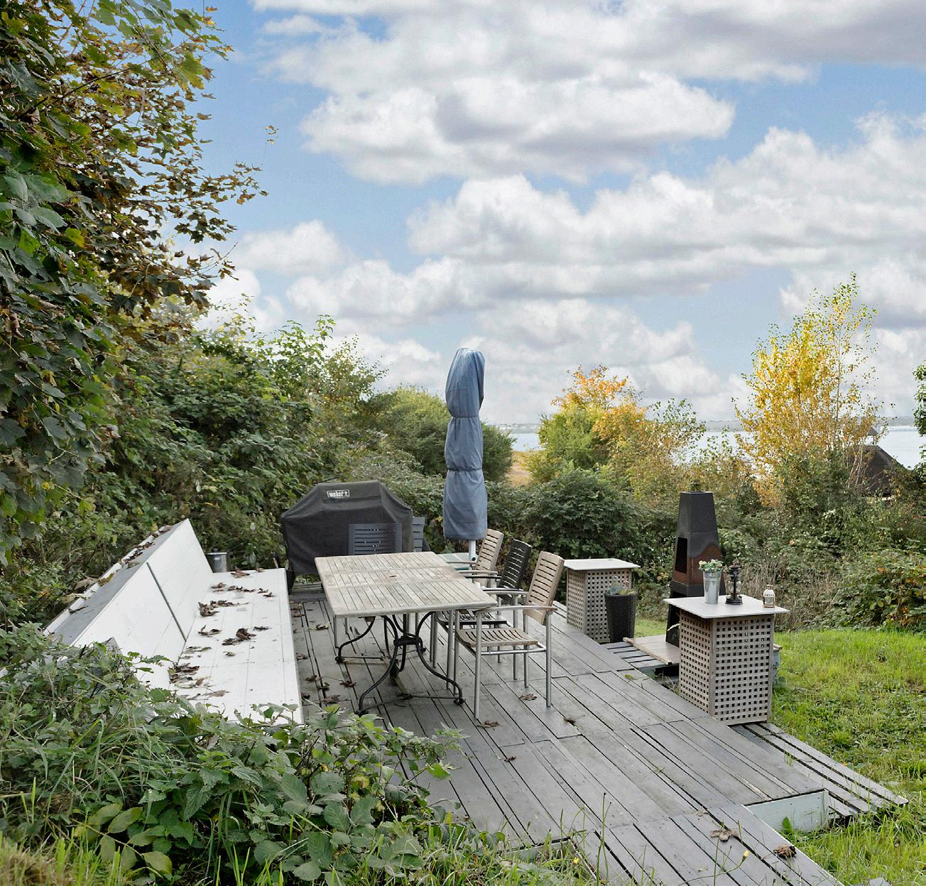 Haven består af mange dejlige terrasser og opholds miljøer, blandet andet børnenes hjørne med legehus samt den ophøjede terrasse fra køkkenet ideel til sommeraftner med grill mad. Ønsker man at drage på sommerferie i egen have kan man nyde det på strandgrunden, enten fra terrassen på toppen eller nede ved vandkanten på den private strandgrund.