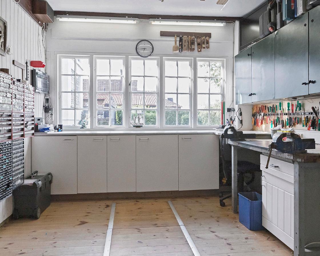 Direktør Nielsen der opførte villaen oprindeligt, var blandt de første i landet til at eje en Ford A, og til så kostbar en investering var det naturligvis på sin plads med en garage. Denne bygning er i dag konverteret til blandt andet at rumme et lyst værksted, med udsigt til vandet gennem de originale vinduespartier, der også gør rummet velegnet som atelier. I får dertil en dobbelt carport, og på taget har man diskret valgt at placere solpaneler, som dermed ikke spolerer husets flotte udtryk.