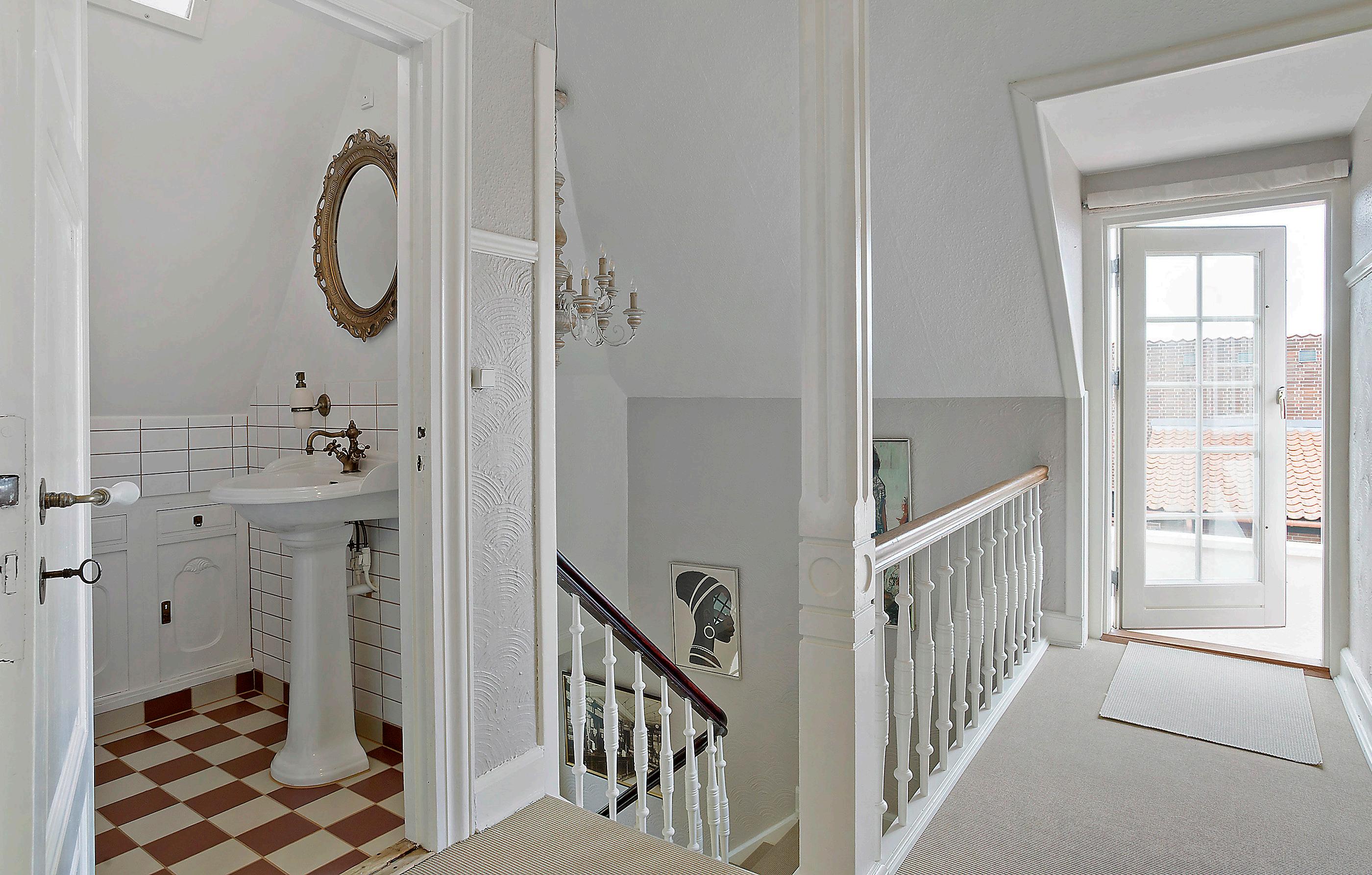 Herudover et gæste toilet med klinker der matcher bindingsværket, samt importeret Heritage sanitet fra England såvel som et 1900 tals skab indmuret i skunken. Hele førstesalen har intakte plankegulve under gulvtæppet.