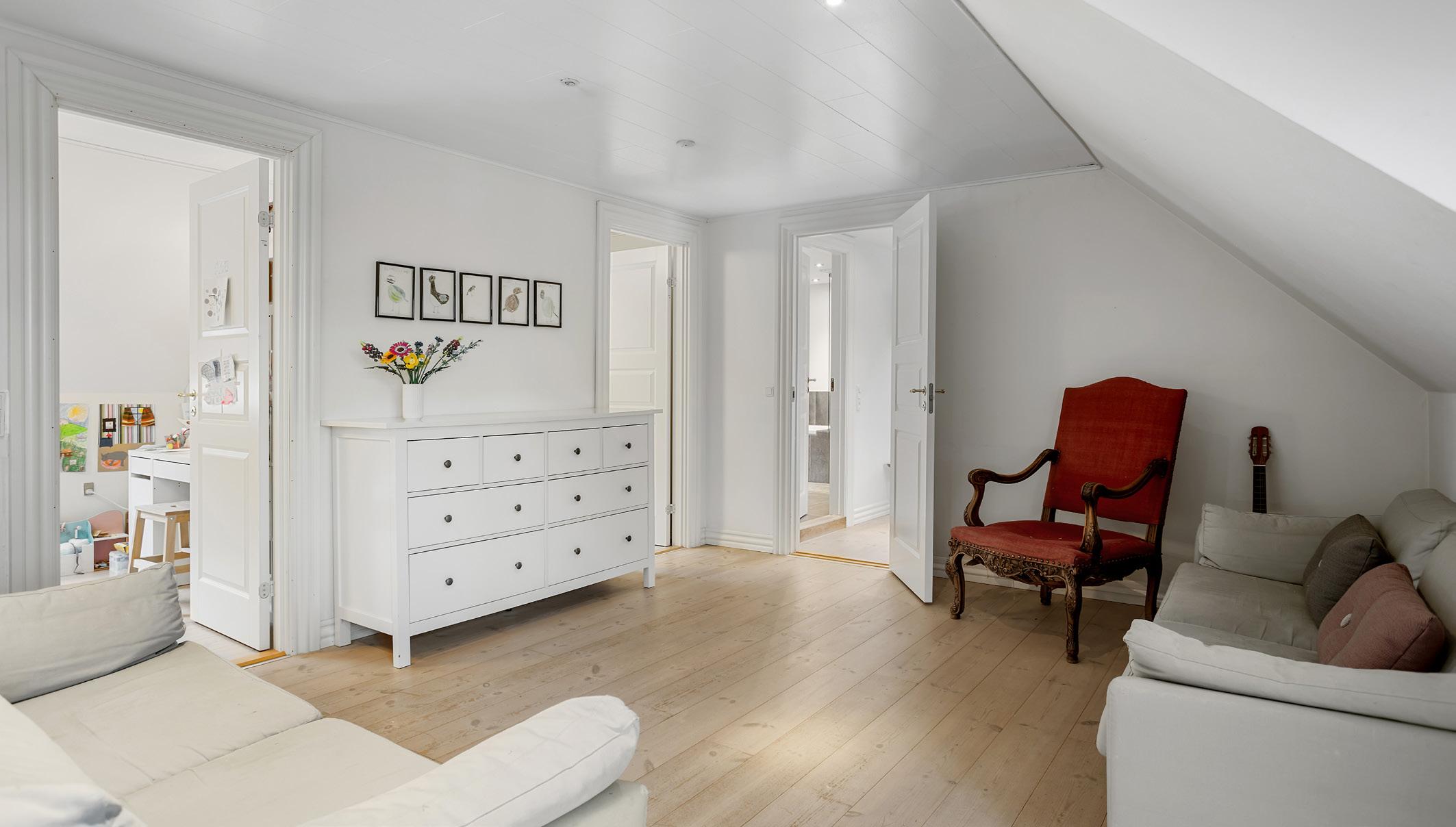 På førstesalen findes en usædvanligt stor repos, der ikke bare er en fordelergang, men et reelt opholdsareal med plads til sofa, skriveplads eller et stille hjørne til læsning. Det gør etagen fleksibel og særlig velegnet til familieliv, fordi man kan trække sig op, uden at være helt væk fra resten af huset, og samtidig har man udsyn til de omkringliggende marker og træer.