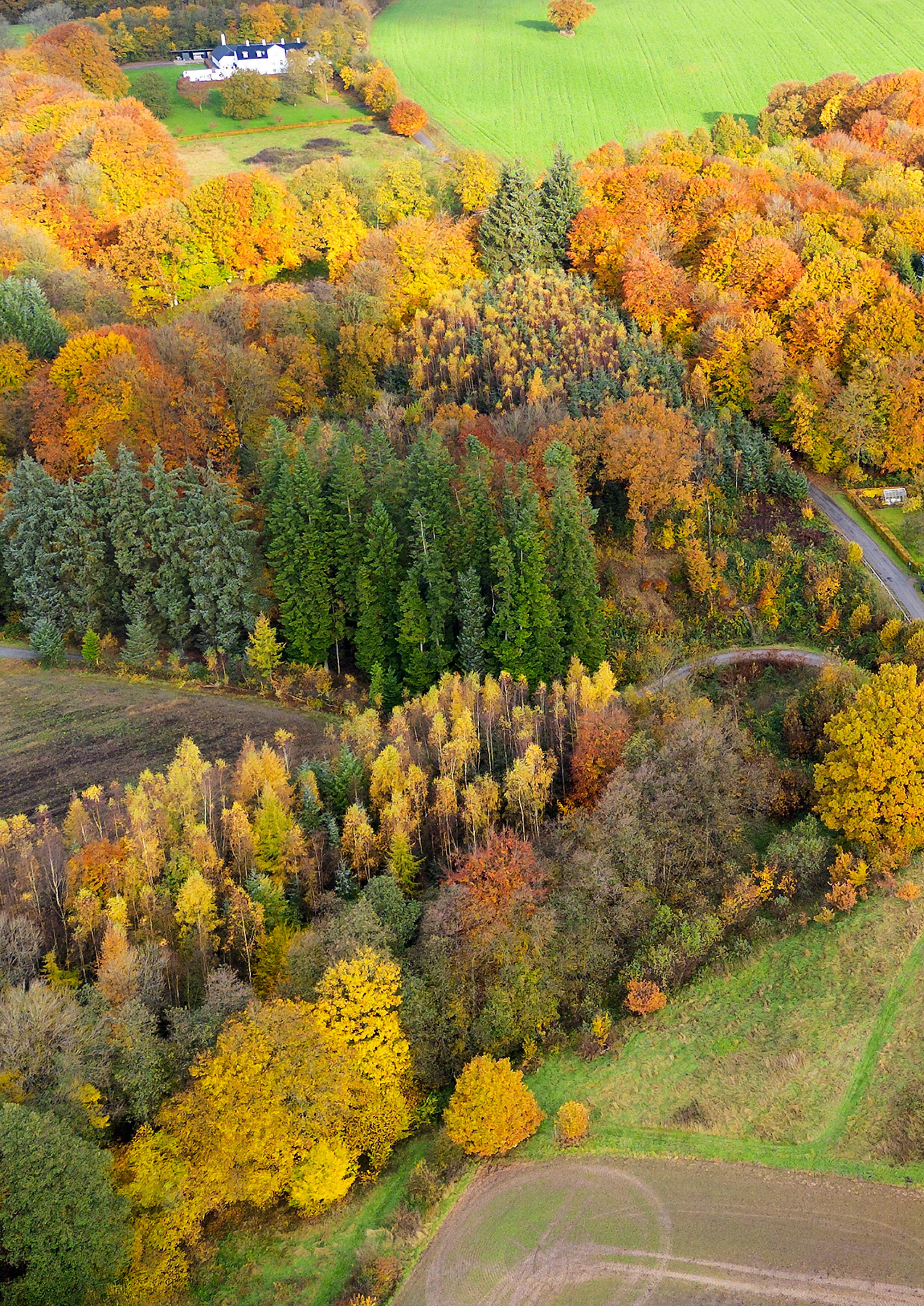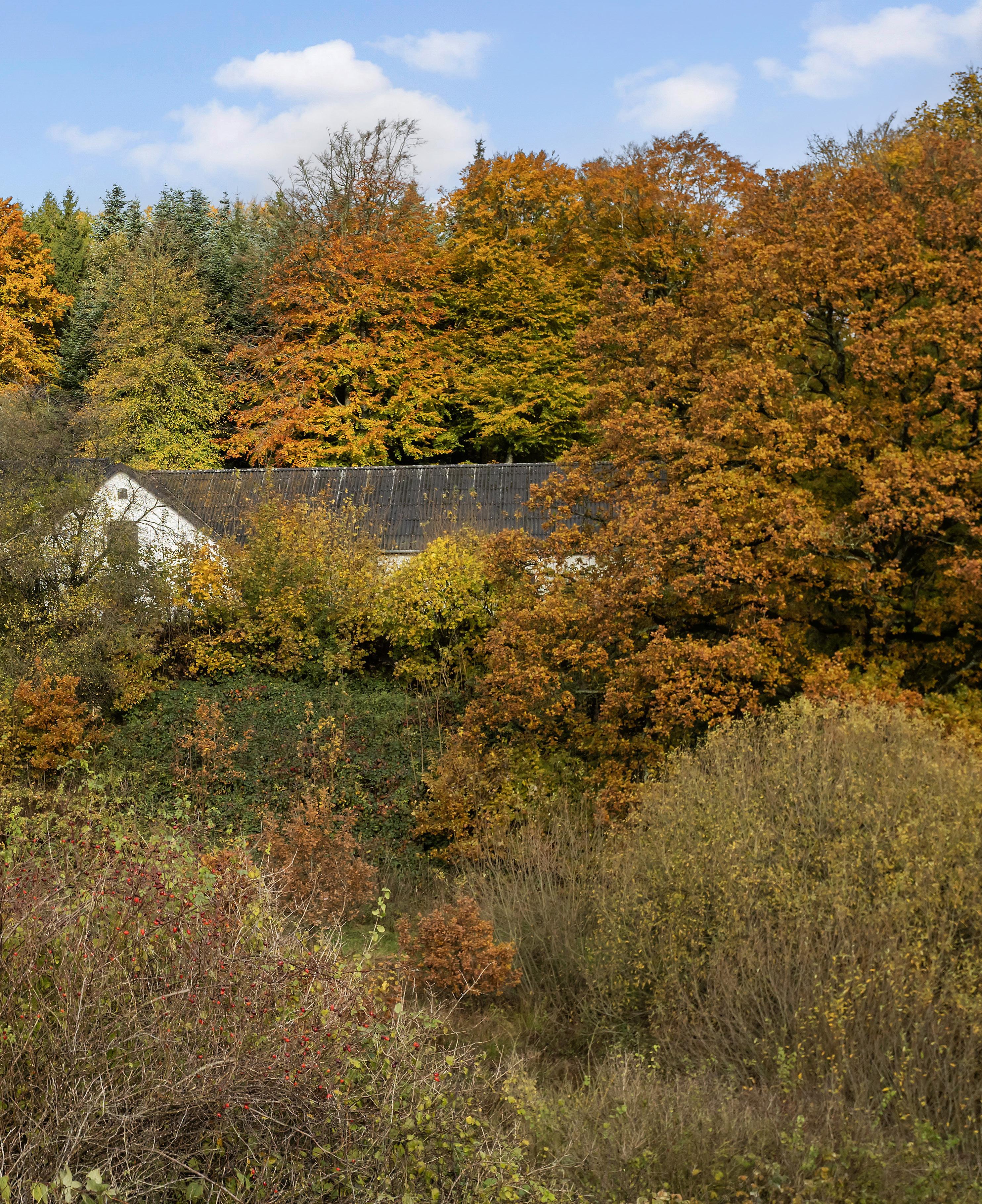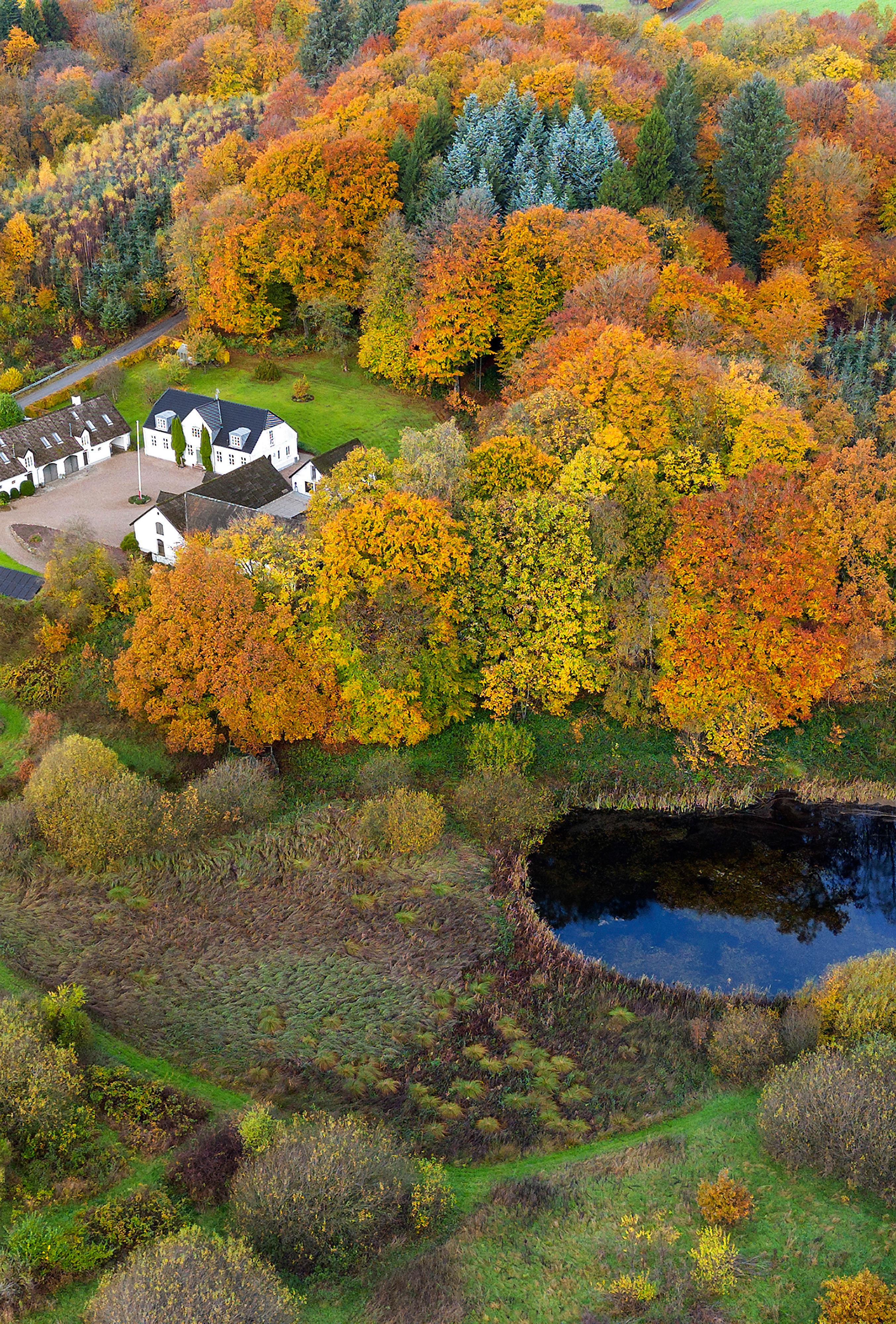 Her – blot få minutter fra Jelling og ti minutter fra Vejle – mødes det bedste fra to verdener. Den levende historie og naturens nærvær på den ene side, og nærheden til byens liv, skole og dagligdagens rytme på den anden. Landskabet omkring ejendommen er formet af fortidens kræfter. Floder, gletsjere og smeltevand har efterladt det bølgende terræn, som i dag danner rammen om et stykke sjældent smuk natur. Over otte hektar jord med skov, eng, sø og en lille å skaber et landskab, hvor årstiderne spiller hovedrollen, og hvor hver dag bringer et nyt udtryk af lys, farver og ro.