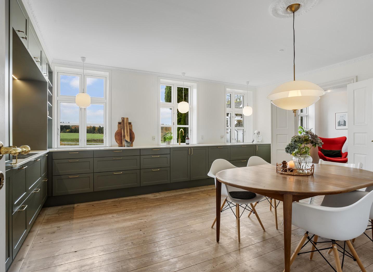 Køkkenet udgør husets naturlige samlingspunkt, et rummeligt og veldisponeret rum, hvor æstetik og funktion smelter sammen. De mørkegrønne skabe står i smuk kontrast til de lyse vægge og messingdetaljerne, samt egetræsskufferne, der fanger lyset og giver et strejf af varme. Dekton-bordpladerne i sten er robuste, elegante og enkle, og der er tænkt i alt udstyr til den krævende hverdag – her er dobbeltovn, kogeplade med integreret sug og quooker i messing. Fra køkkenet er der udsigt til den grusbelagte gårdsplads, og gennem to gange dobbelte franske døre ligger spisestuen – et virkelig stort og præsentabelt rum med udsigt til haven og naturen, hvor man kan sidde længe og lade blikket glide ud over landskabet, mens man nyder et godt glas vi fra vinskabene.