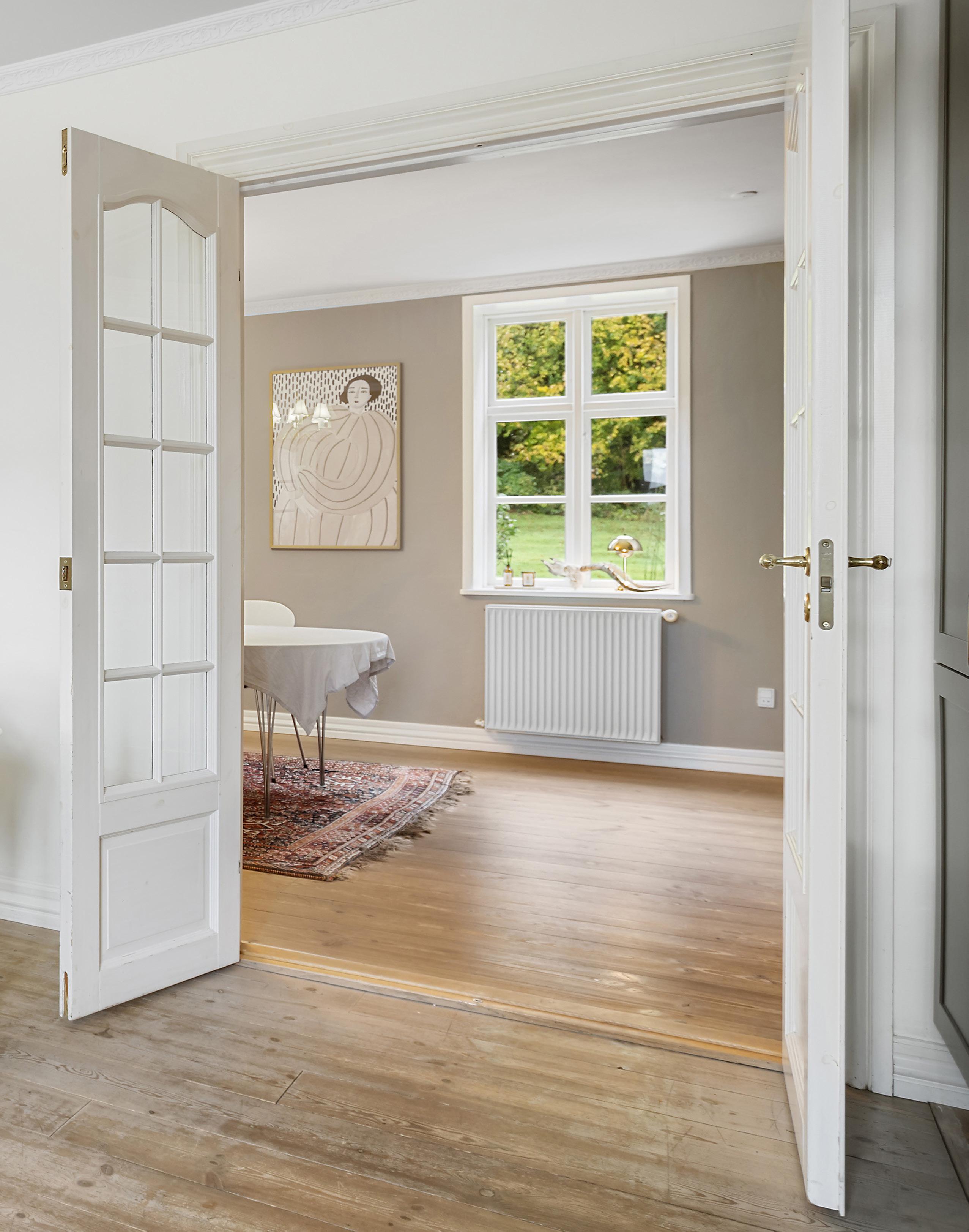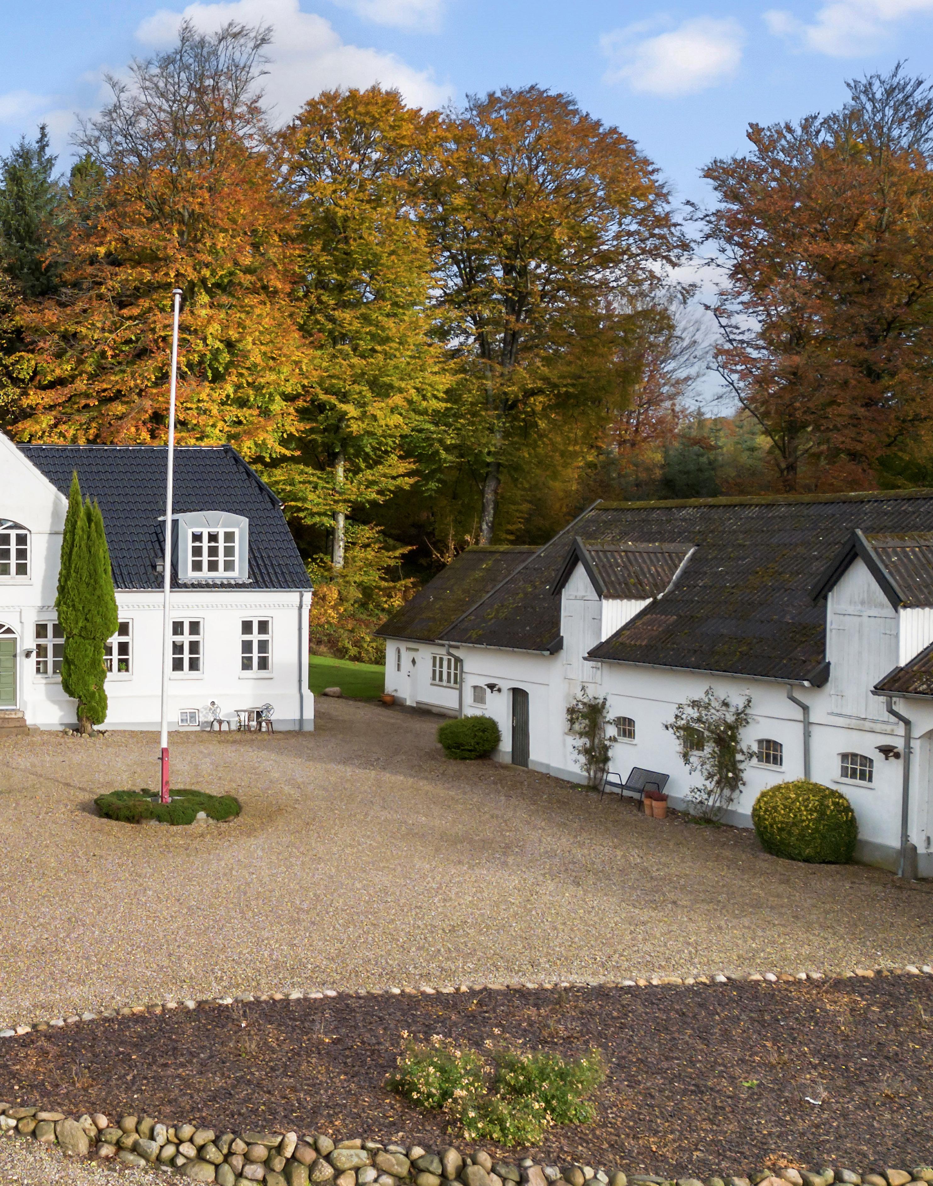 Hovedhuset fremstår med en klassisk symmetrisk arkitektur og hvidpudsede facader, der står smukt mod det frodige bagtæppe. Man fornemmer straks den herskabelige karakter – den mørkegrønne hoveddør, den grusbelagte gårdsplads med flagstangen i midten og de høje træer, der flankerer indgangen, giver huset en rodfæstet og næsten tidløs tilstedeværelse. Indenfor fortsætter indtrykkene med højt til loftet, stuk i lofterne, indfattede døre og brede trægulve, som knirker blødt under fødderne. Alt sammen fornyet med respekt for husets historie og detaljer, så atmosfæren føles både ægte og nutidig.