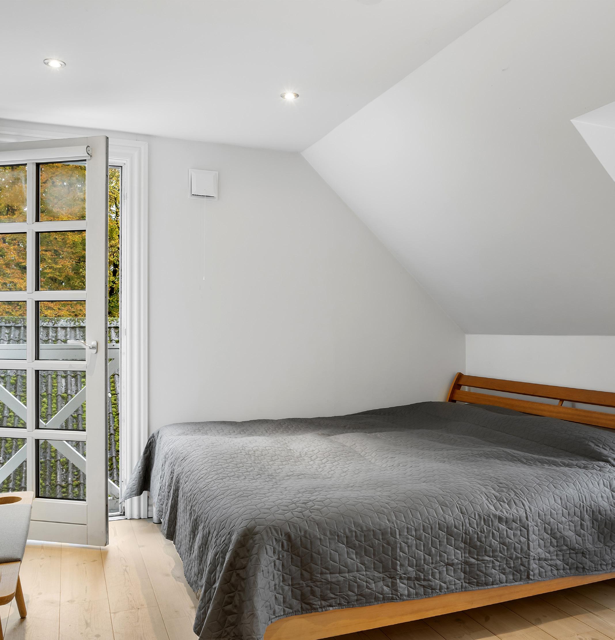 På førstesalen ligger boligens mastersuite, hvor roen nærmest er indbygget i rummets proportioner. Det store soveværelse vender mod gårdspladsen, og gennem den franske altan strømmer frisk luft ind fra markerne og skoven. I forlængelse af soveværelset ligger et rummeligt walk-in. De brede trægulve understreger den naturlige stemning, og sammen med de lyse vægge skabes et enkelt og afbalanceret udtryk. Herfra er der adgang til det tilhørende badeværelse, der er indrettet med smukke grå klinker og et stort badekar, hvorfra man kan nyde udsigten mod trætoppene. Et enkelt vaskemøbel og afdæmpede materialer giver badeværelset en rolig og gennemtænkt atmosfære, som fuldender fornemmelsen af privatliv og velvære.