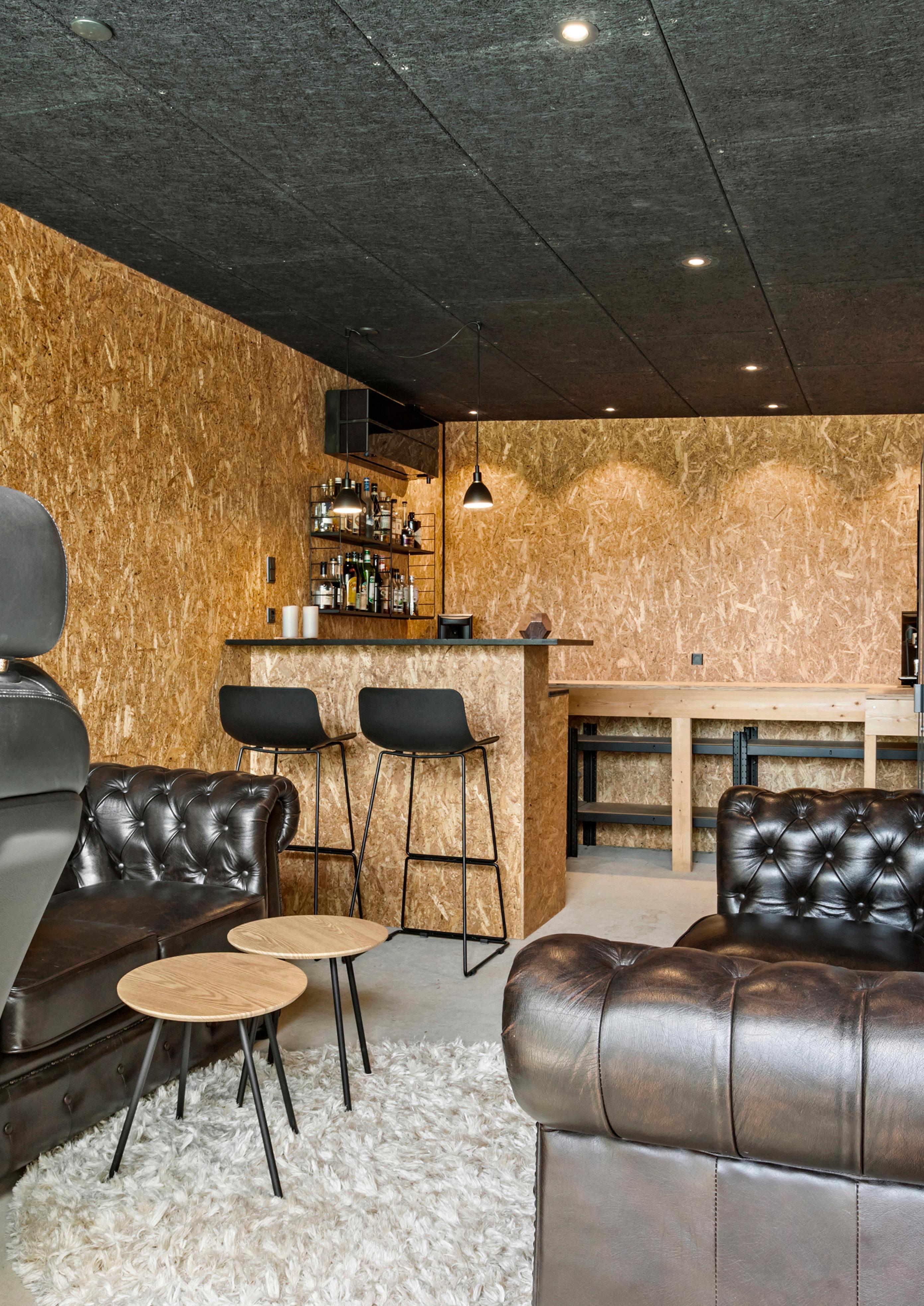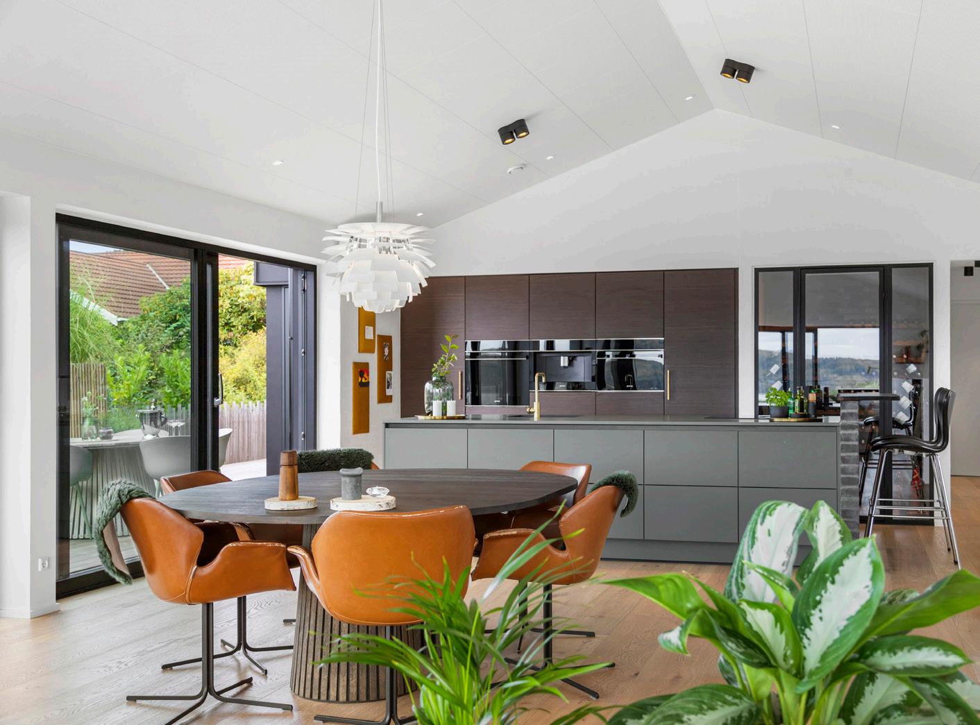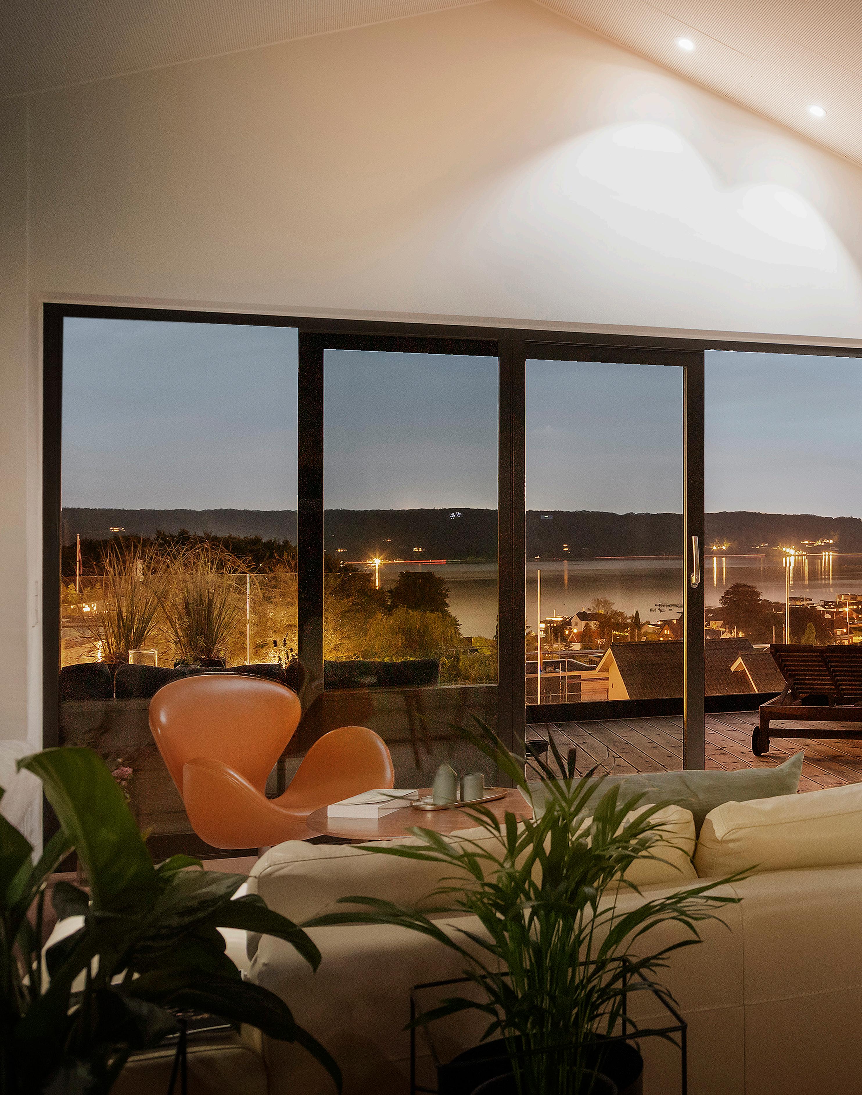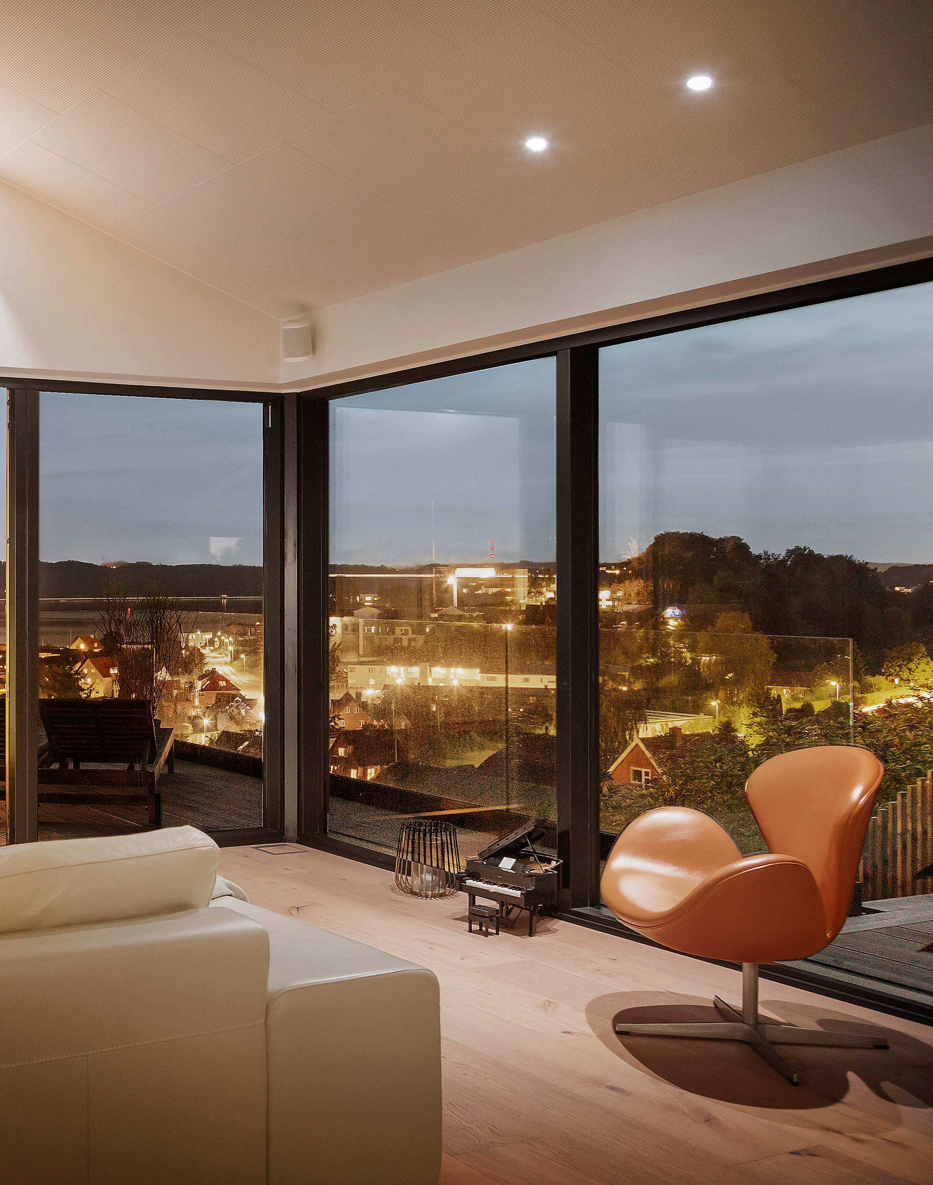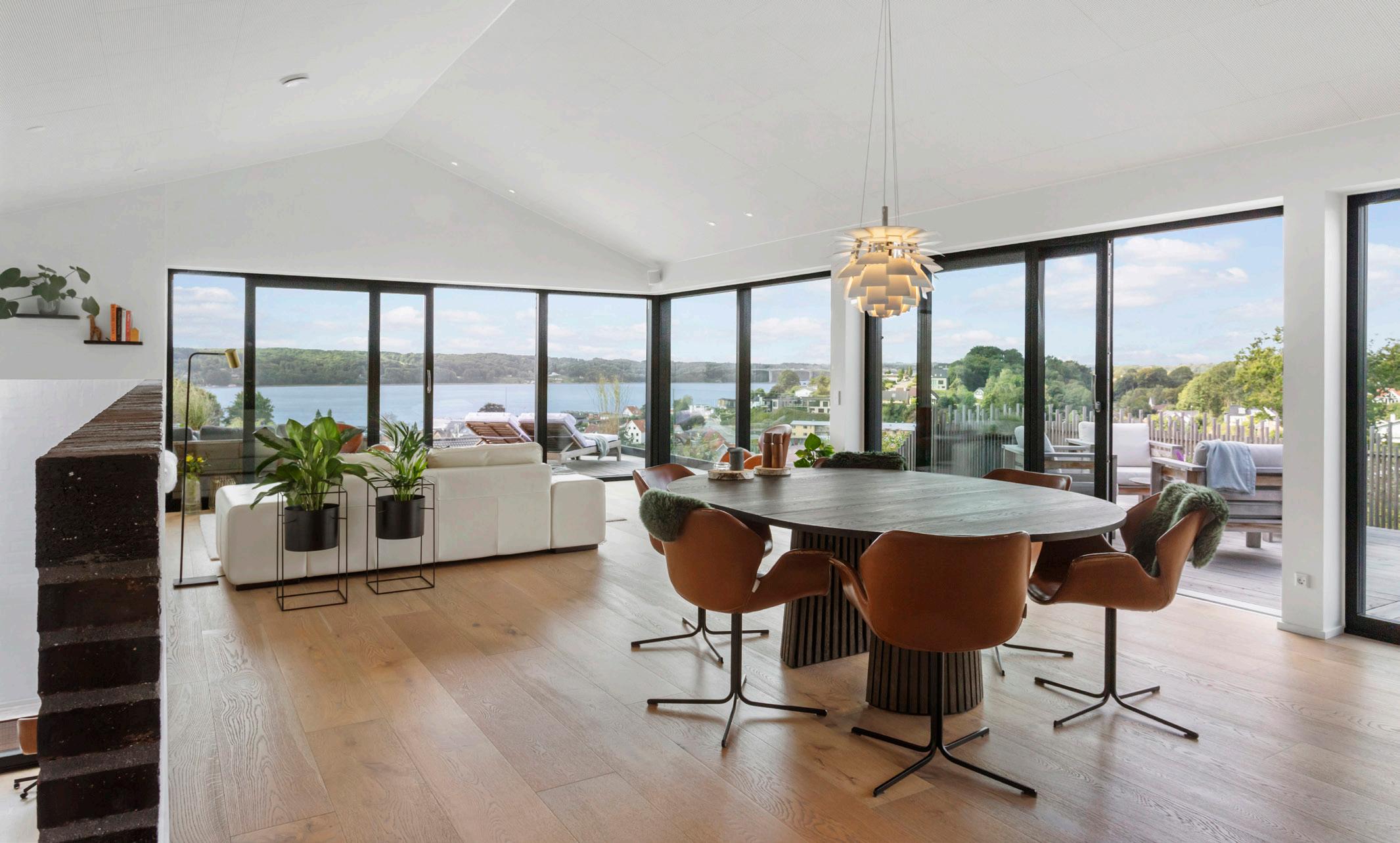 Leverummene udgør husets stueafdeling og spiseplads i ét åbent og indbydende forløb. Loft til kip giver rummet luft og lys, og akustiklofter får samtaler og musik til at lande blødt uden at blive påtrængende. De brede egetræsplanker under fødderne tilfører varme og kvalitet, mens store skydedøre kan trækkes til side, så terrasserne bliver naturlige opholdsrum på lune dage. Rummet kan indrettes med et stort sofaarrangement og et solidt spisebord, og det fungerer klart som hjemmets naturlige samlingspunkt, hvor udsigten er både unik og betagende. Lyset fra fjorden skifter stemningen gennem dagen og binder de indre rum sammen. Annexet i tilknytning til huset supplerer stueafdelingen med en ekstra flade til leg, film eller hjemmearbejde uden at tage fokus fra boligens helhed.