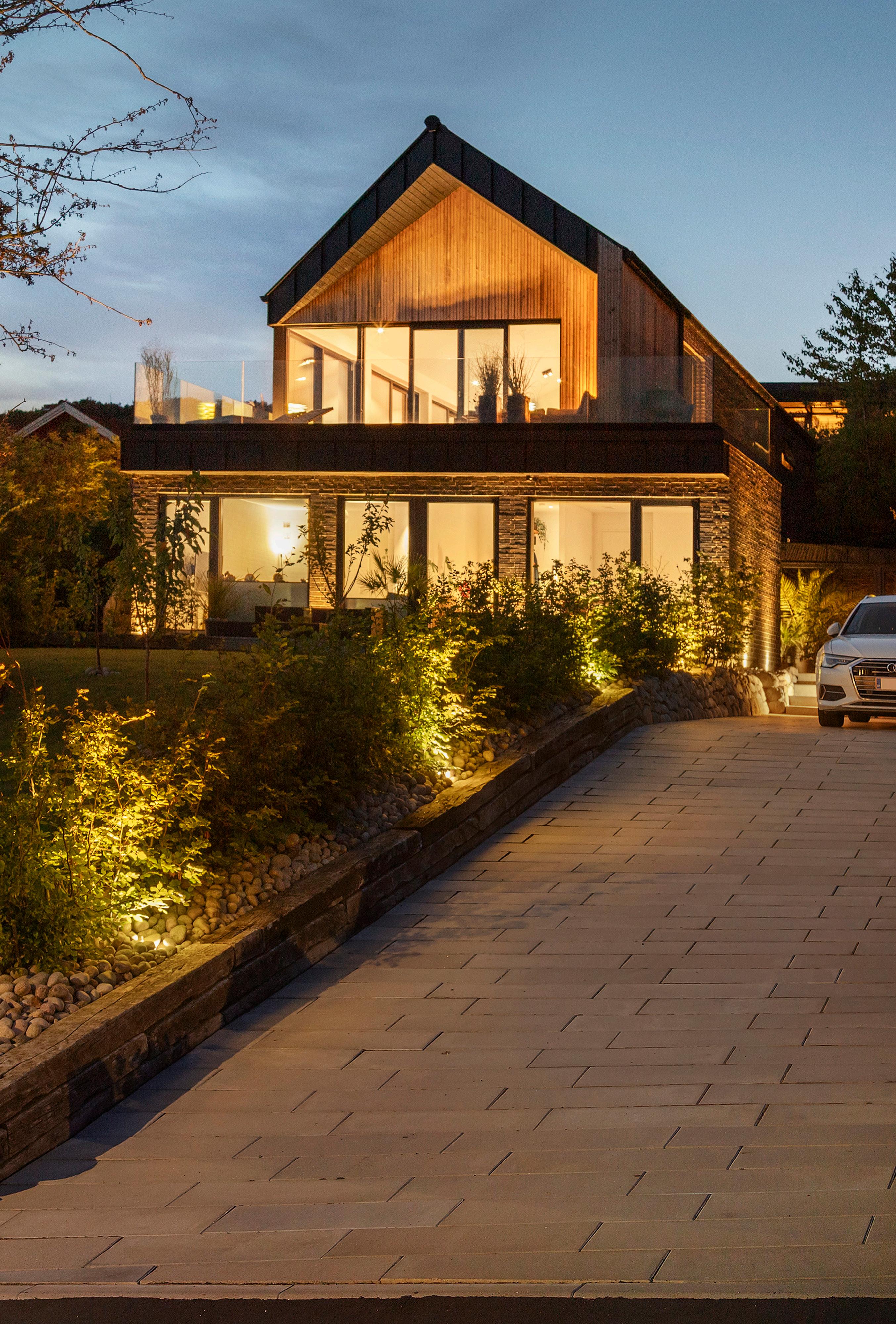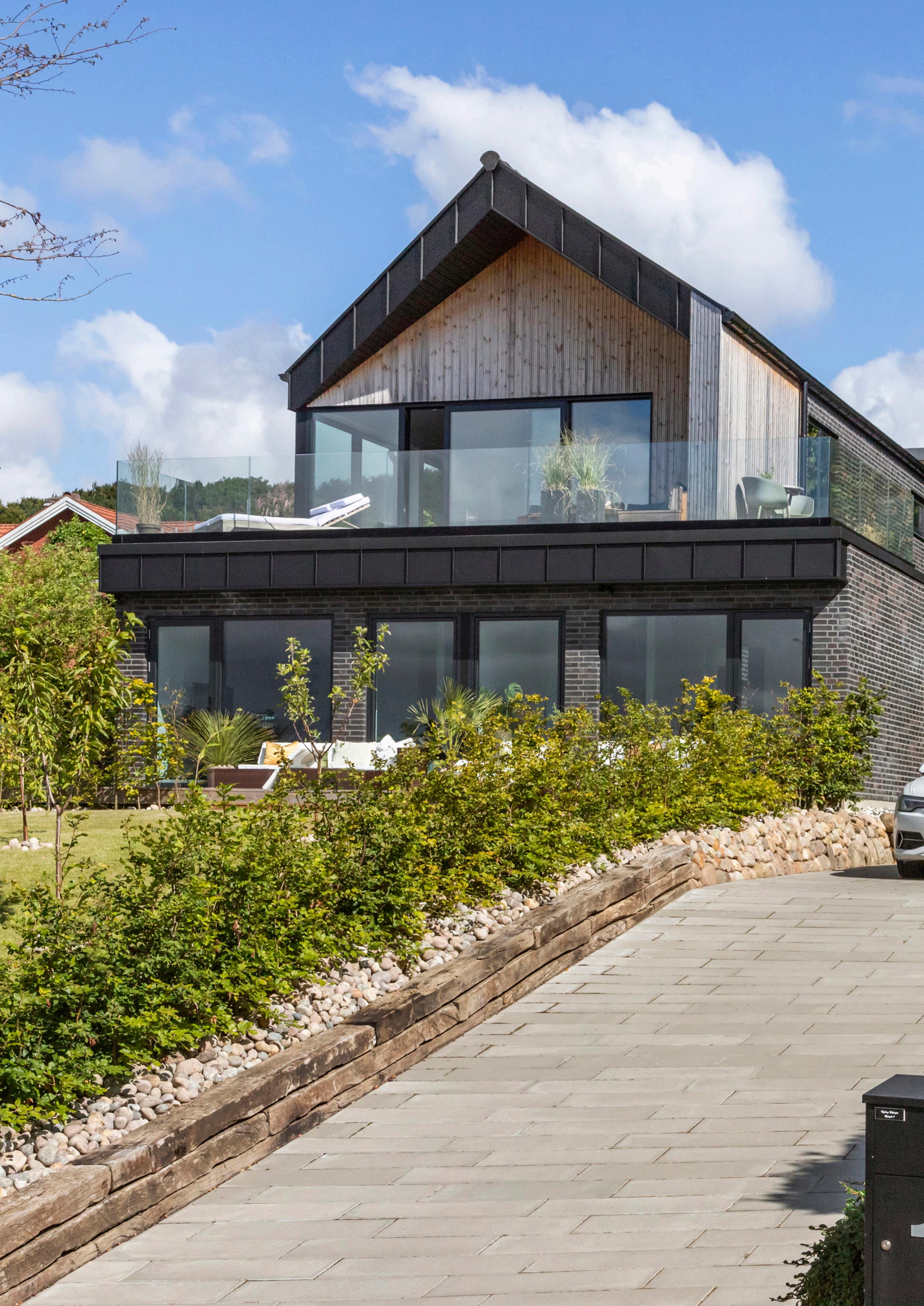 Køkkenets rumlighed og alrummets flow inviterer til samvær. Her er plads til både store sammenkomster og små, stille stunder, og skydedørene gør det nemt at lade ude og inde flyde sammen, når vejret indbyder til det. Terrasserne ligger hele vejen rundt om huset, og morgen-terrassen, lounge-terrassen samt de mange opholdsflader giver mulighed for at følge solen gennem dagen eller finde læ, når vinden tager til. Store plantekasser skaber private rum uden at afskære udsigten, og udearealerne opleves som naturlige forlængelser af de indre rum.