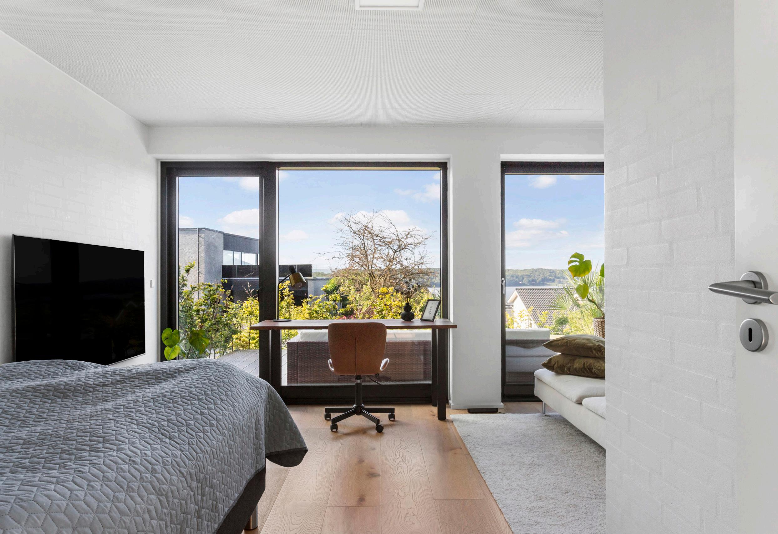 Værelserne ligger hovedsageligt på nederste plan, hvor to rummelige værelser på cirka 20 m² vender ud mod haven. Begge har udsigt til fjorden, egen udgang til terrasse og hvert deres walk-in, hvilket gør dem særligt praktiske og fleksible. De to rum kan desuden nemt omdannes til tre separate værelser, hvis behovet opstår, og det giver mulighed for at tilpasse boligen til skiftende livsfaser. På øverste plan findes endnu et værelse med fjordudsigt, som også egner sig til kontor. I alt rummer boligen fire værelser, men planløsningen giver frihed til at ændre funktionerne. Husets andet badeværelse ligger i underetagen; det er rummeligt og indeholder bad, så det dækker de daglige behov. Materialerne i både værelser og badeværelser følger hjemmets varme, gennemførte udtryk og binder de private rum sammen.