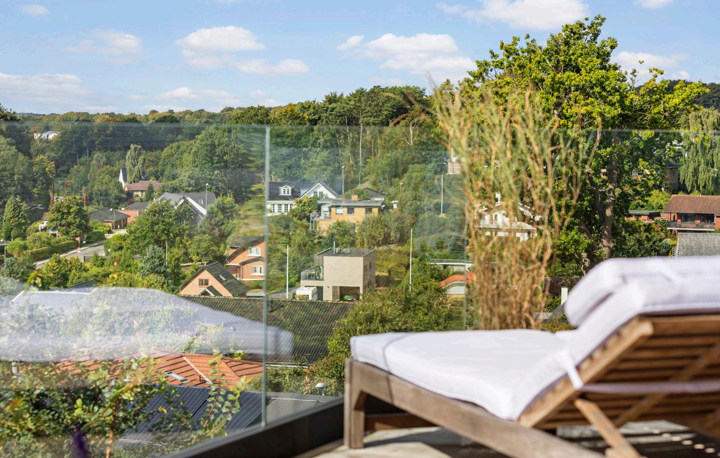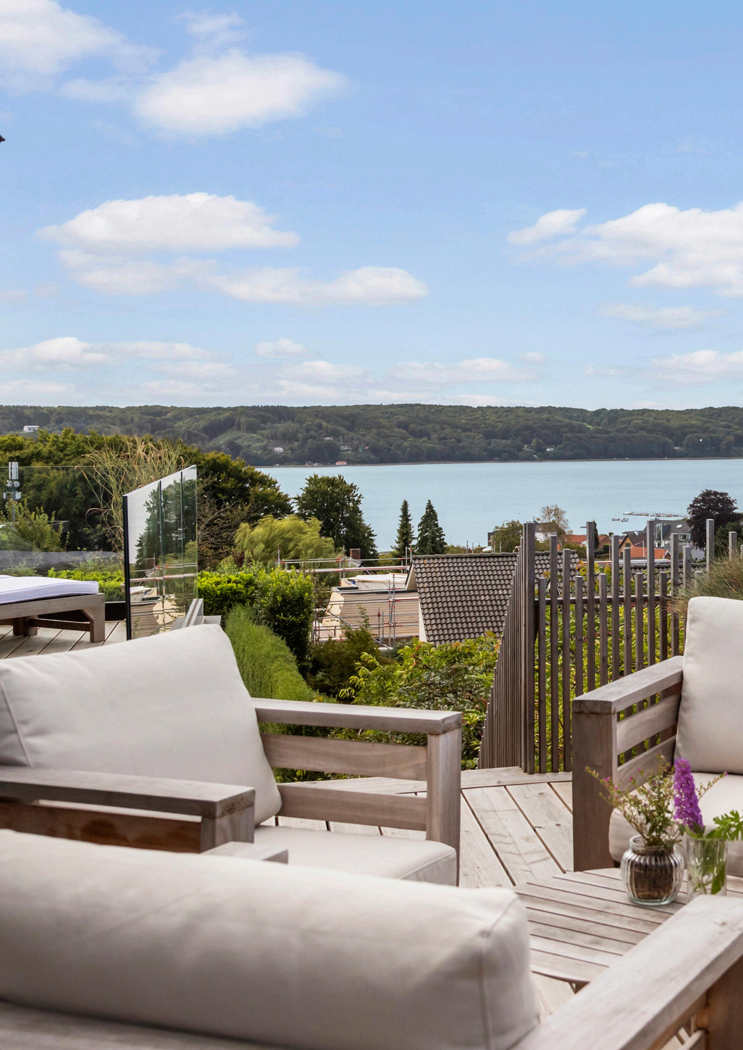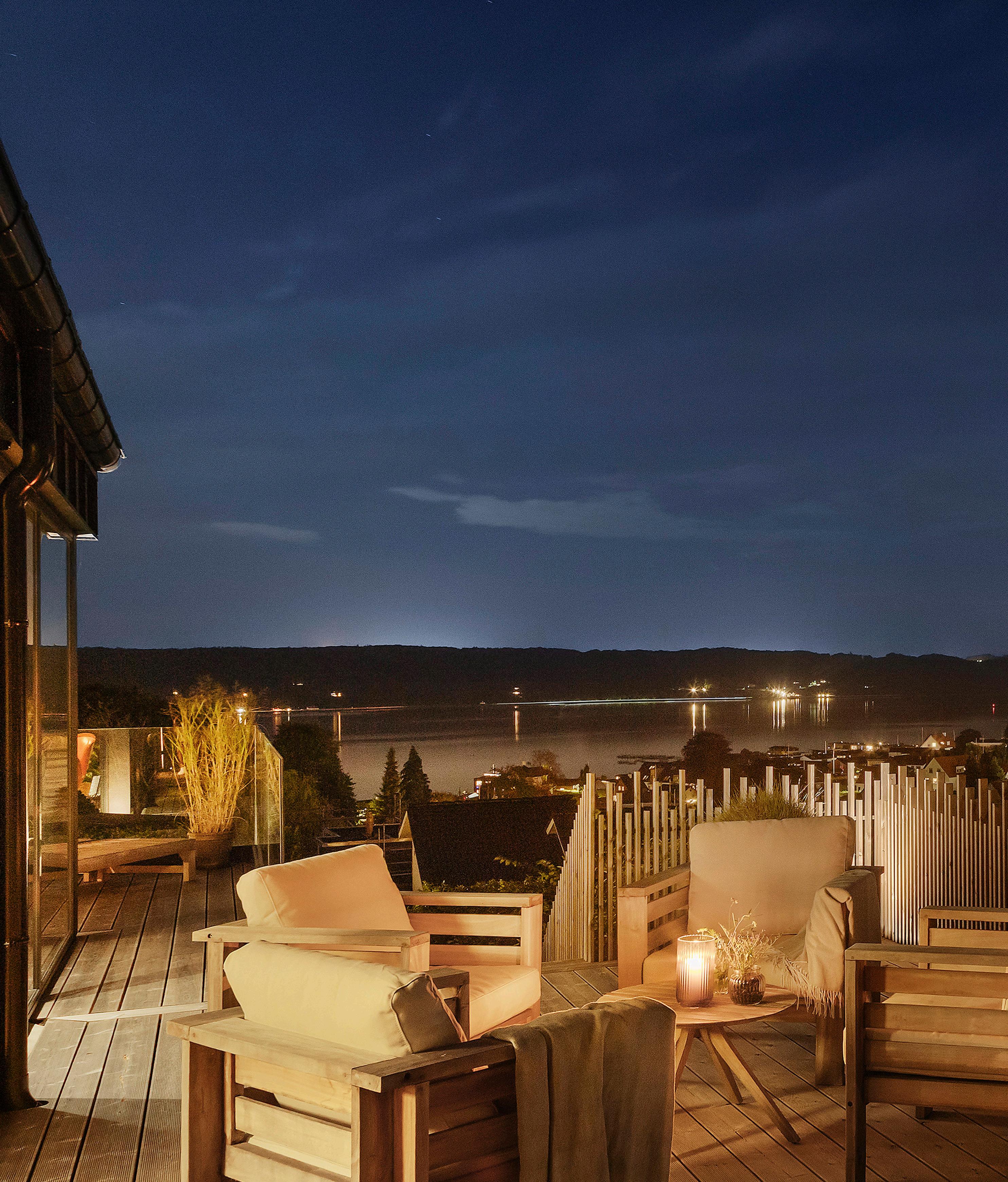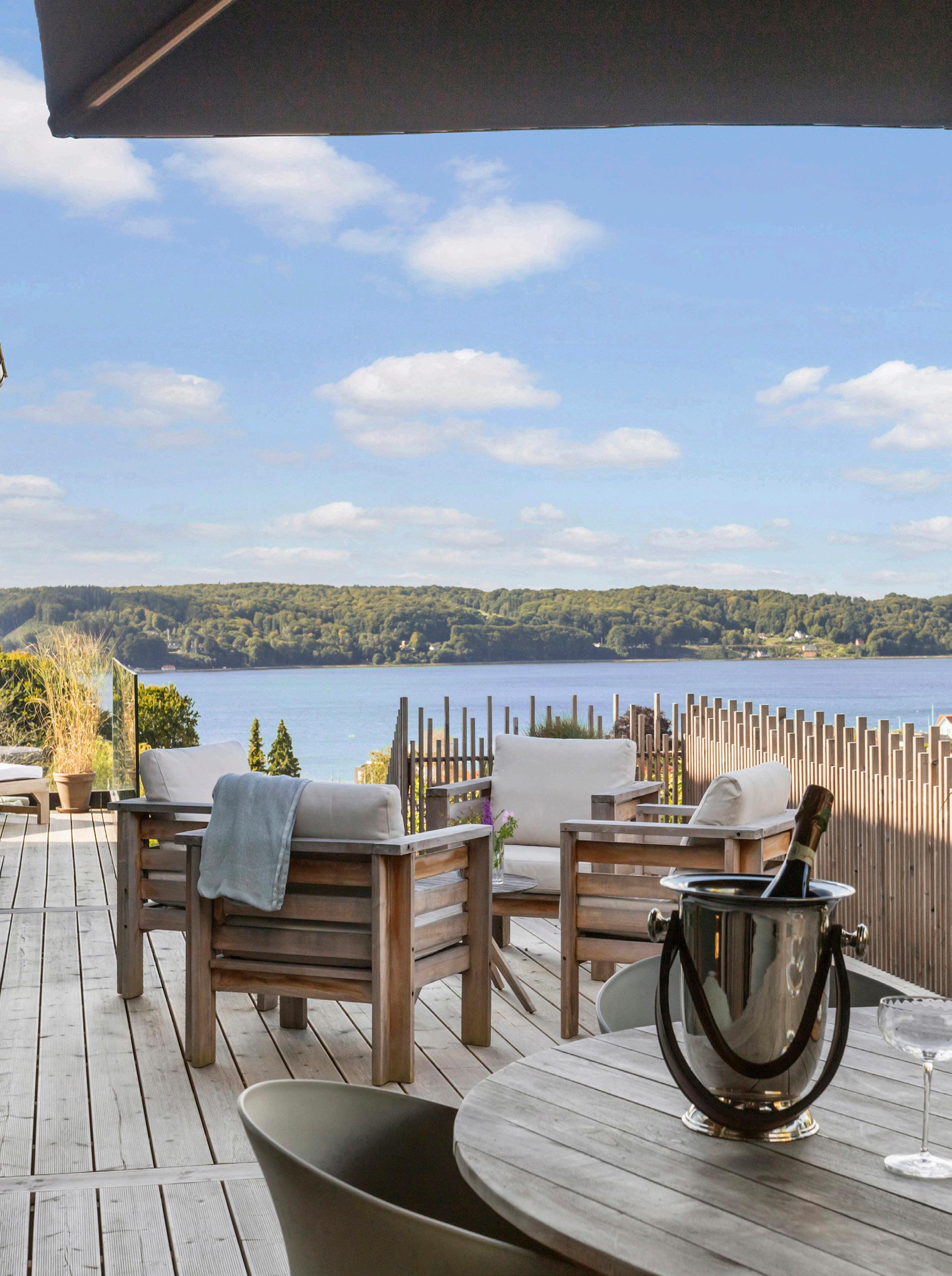 Morgen-terrassen vender let mod øst og er det naturlige sted til dagens første kop kaffe, mens lounge-terrassen indbyder til lange aftener med udsigt.