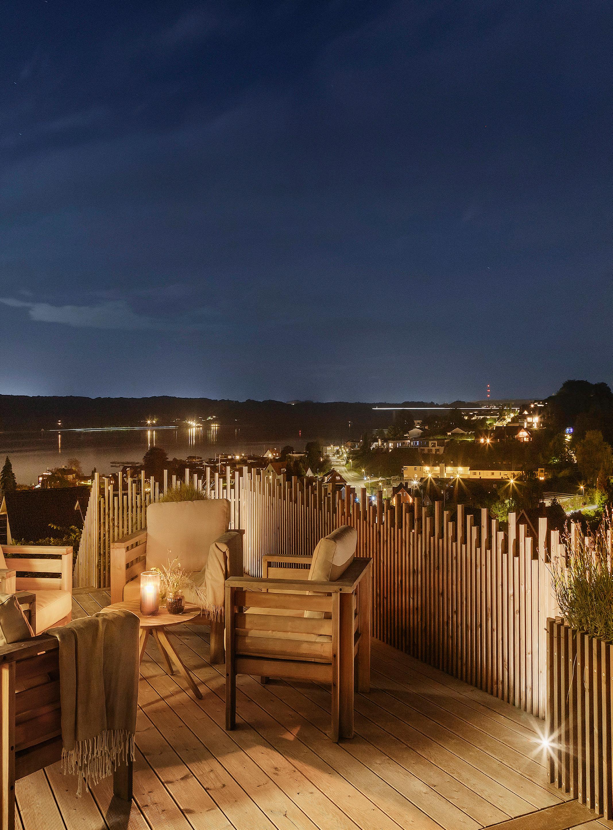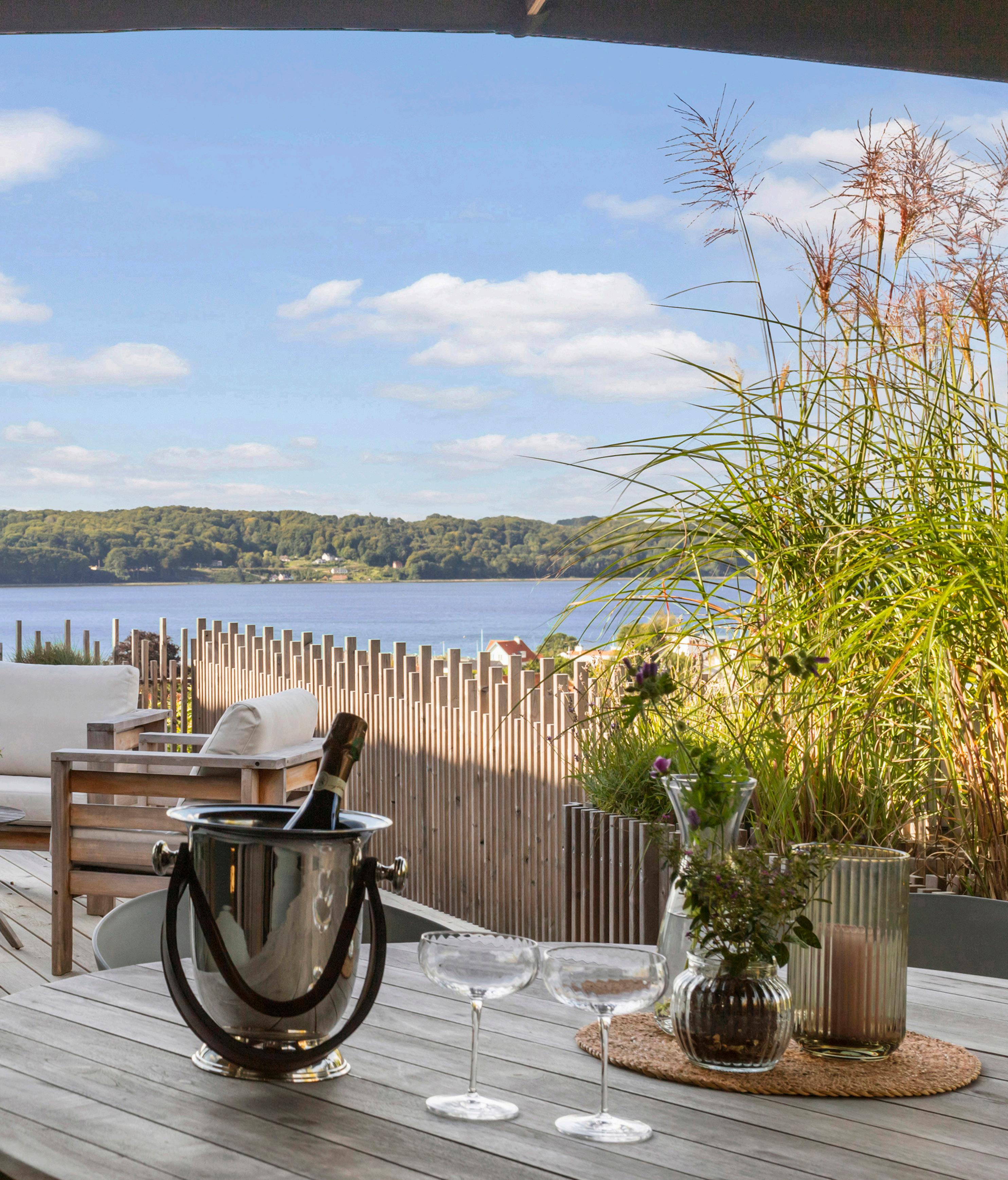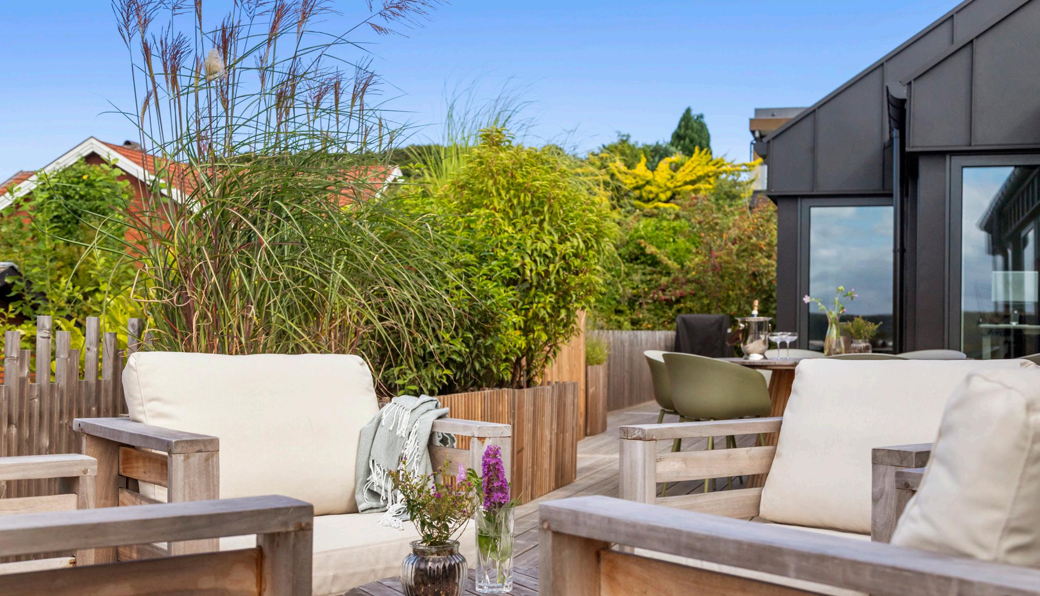 Morgen-terrassen vender let mod øst og er det naturlige sted til dagens første kop kaffe, mens lounge-terrassen indbyder til lange aftener med udsigt.