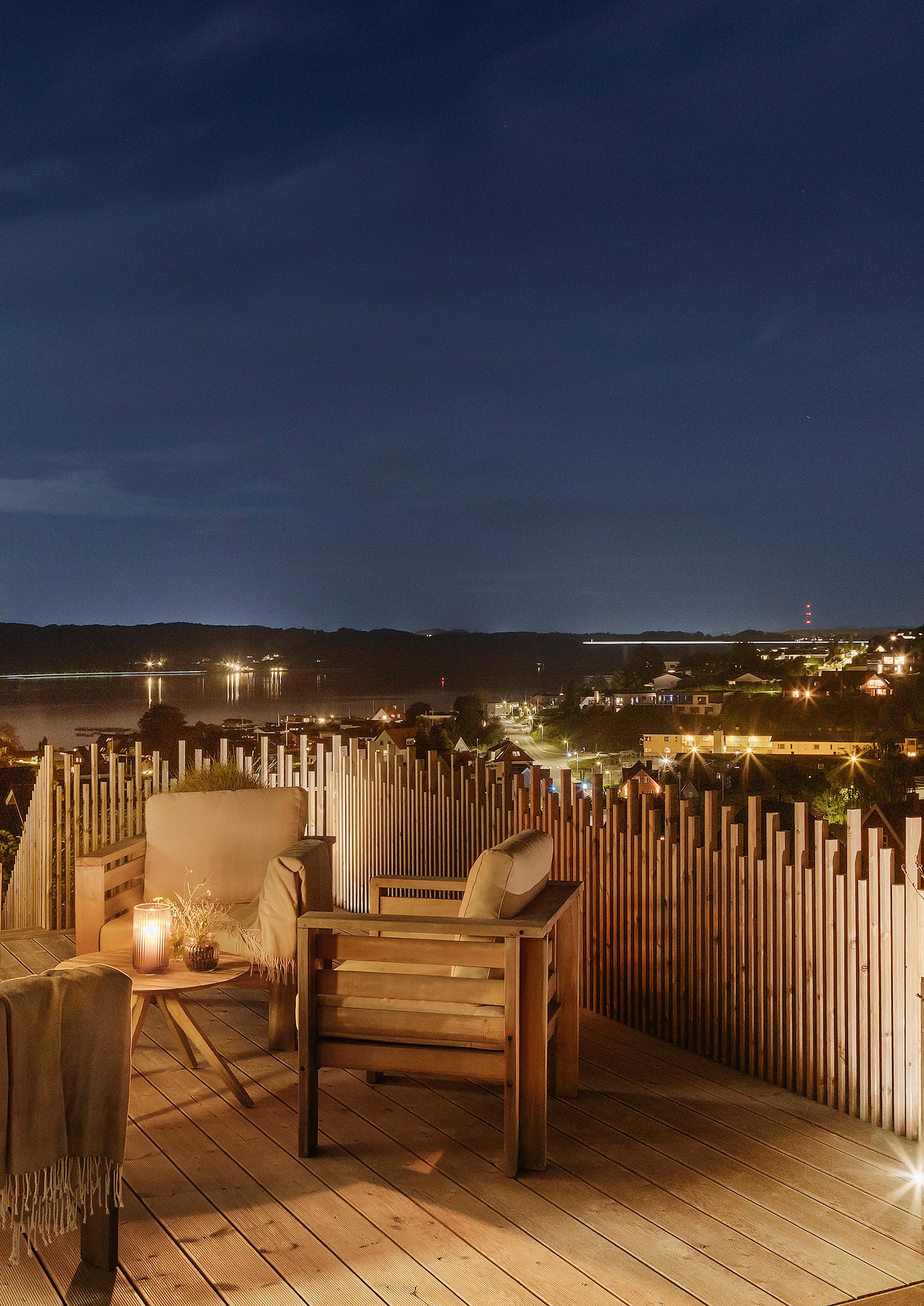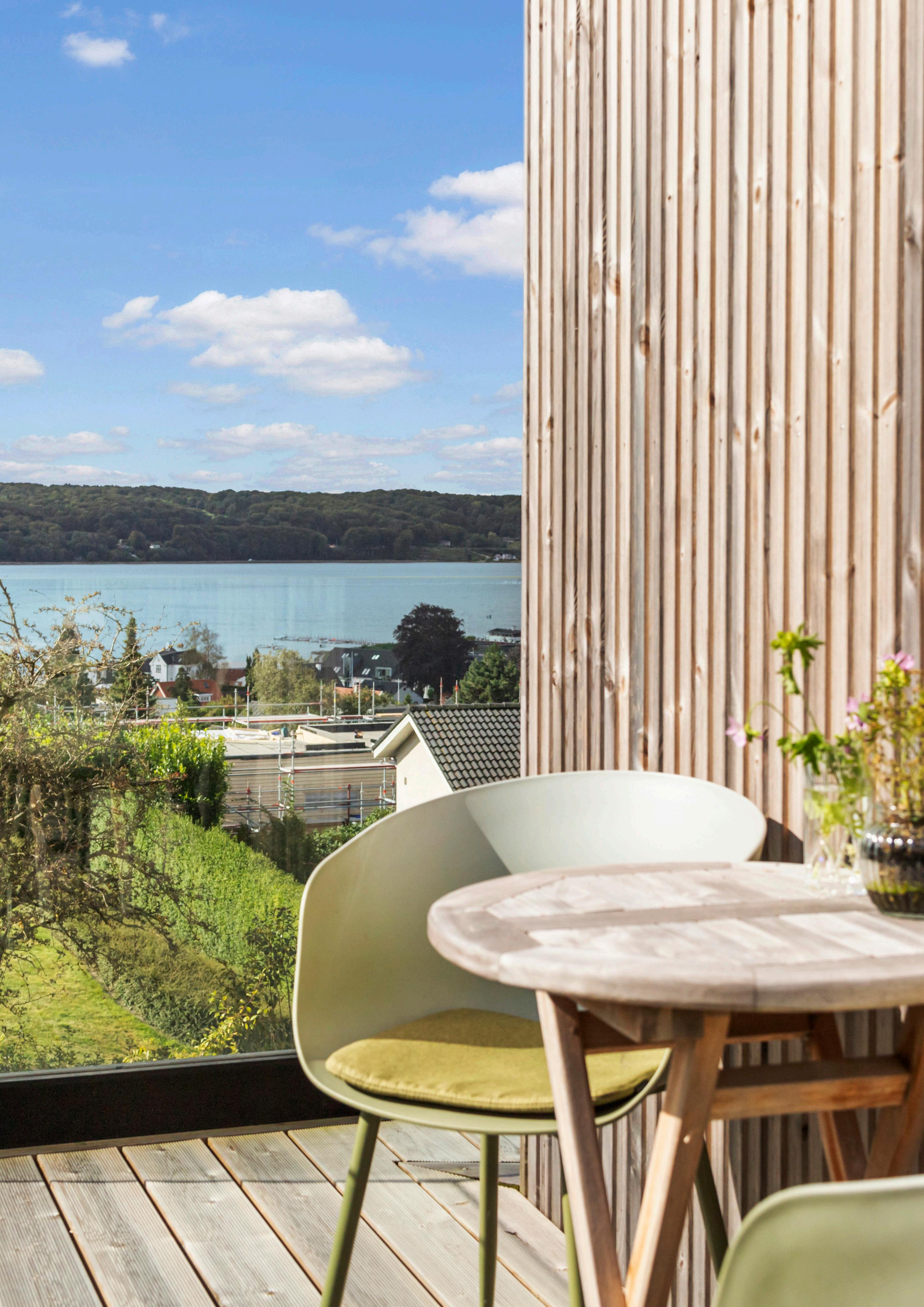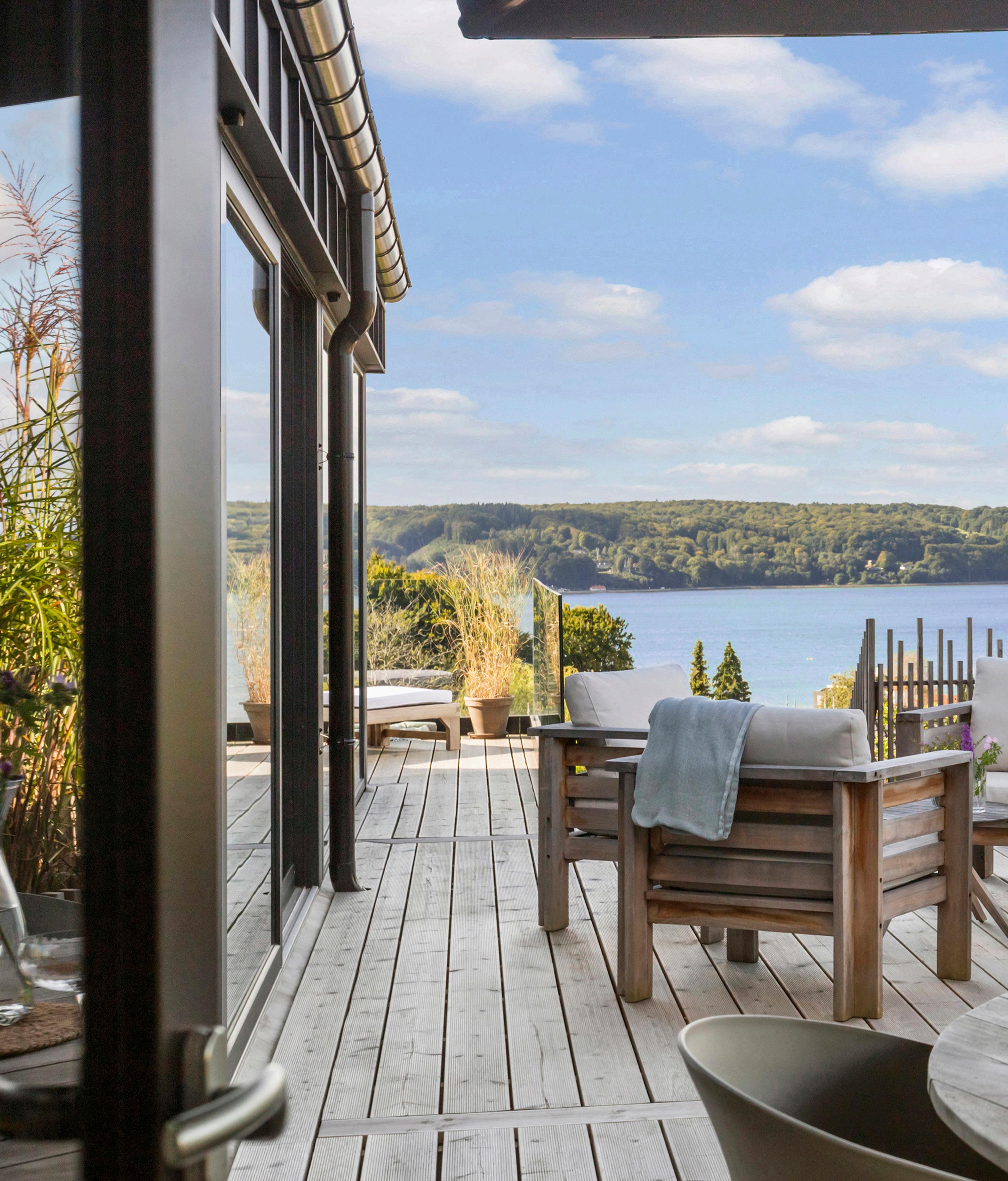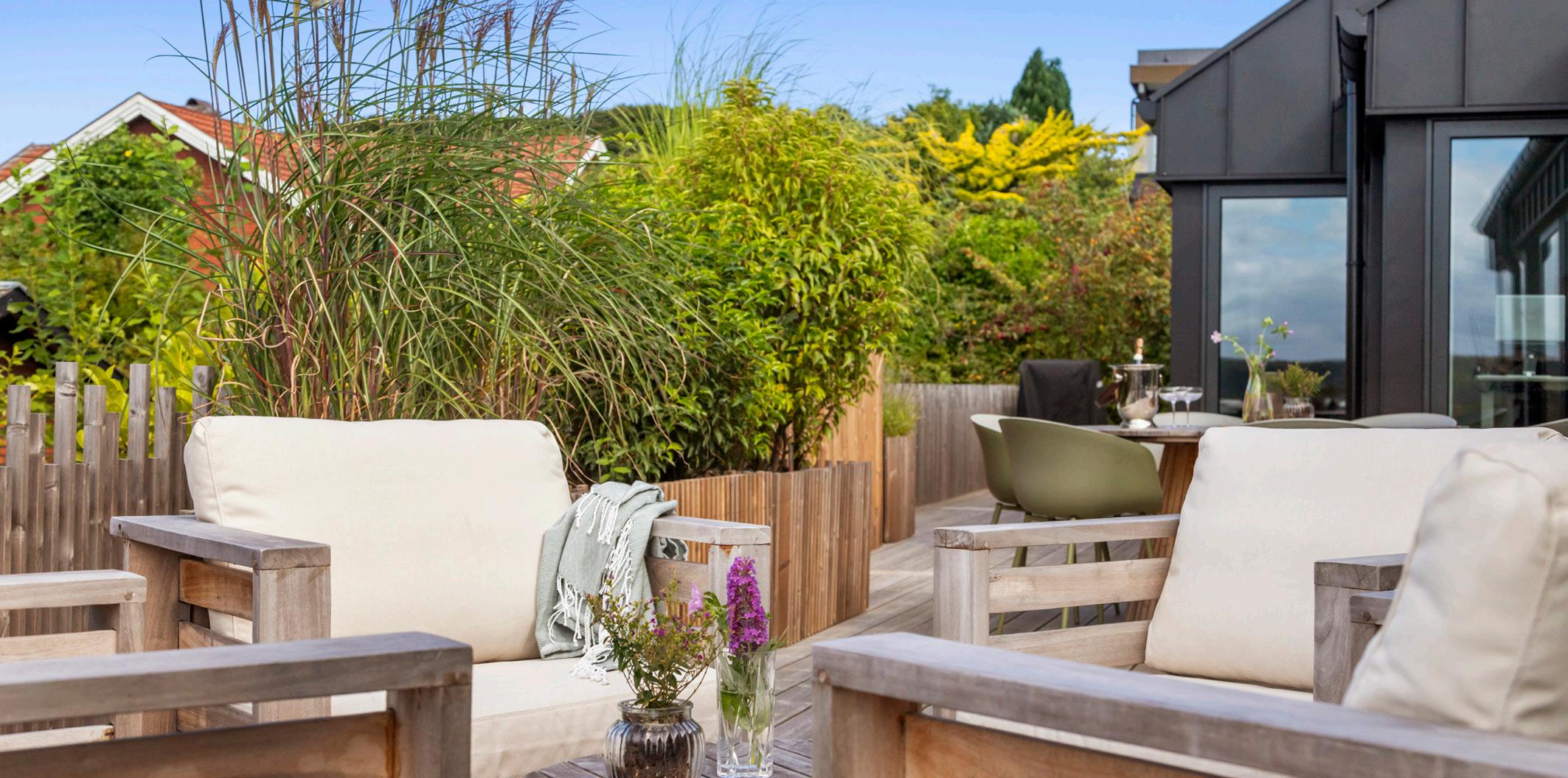Morgen-terrassen vender let mod øst og er det naturlige sted til dagens første kop kaffe, mens lounge-terrassen indbyder til lange aftener med udsigt.