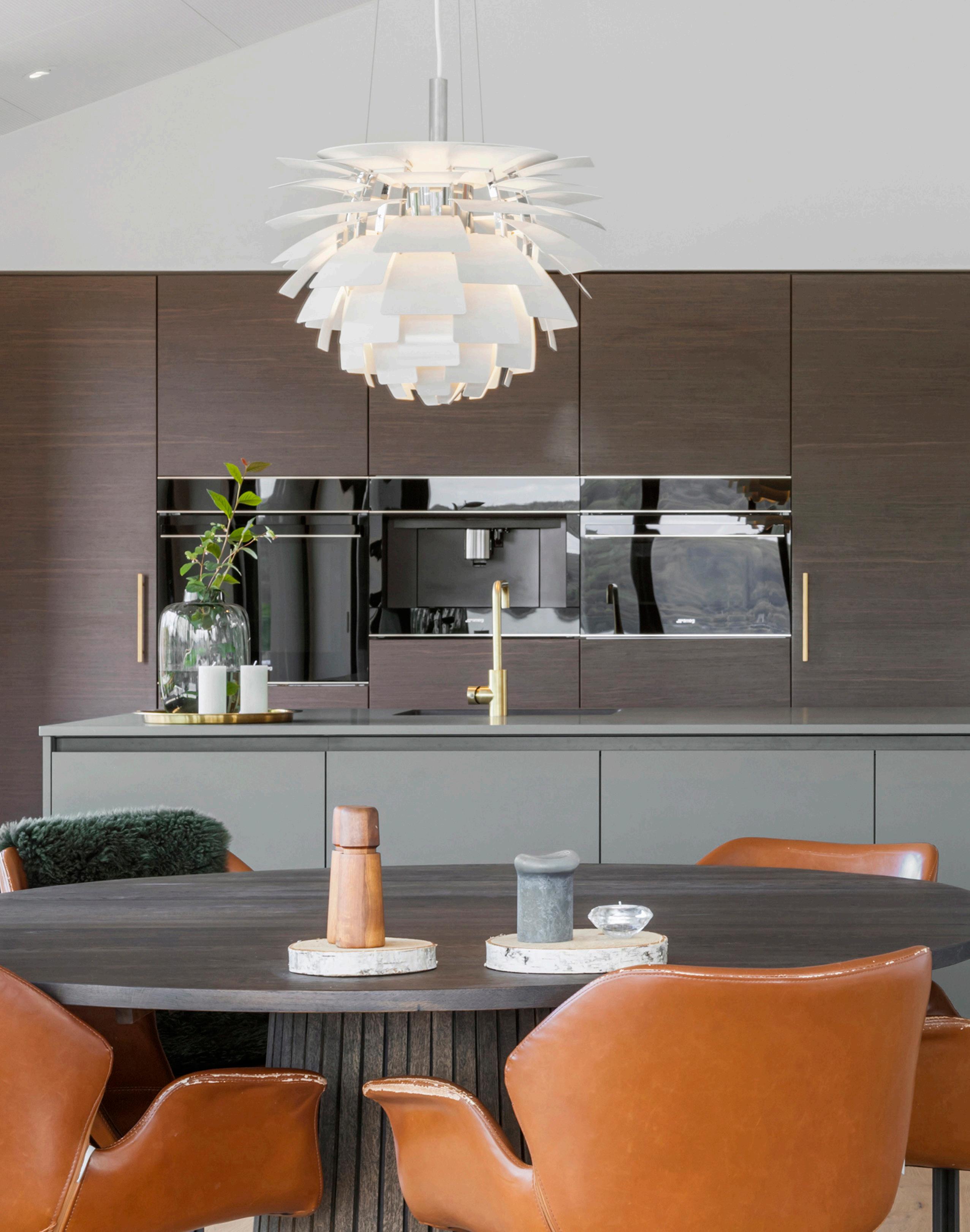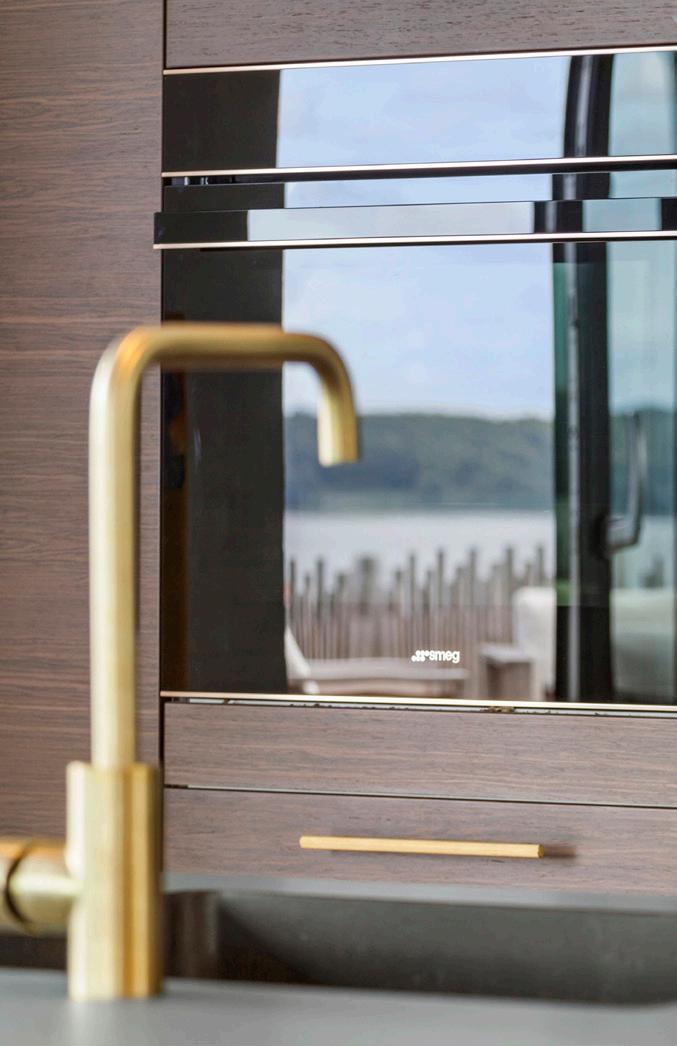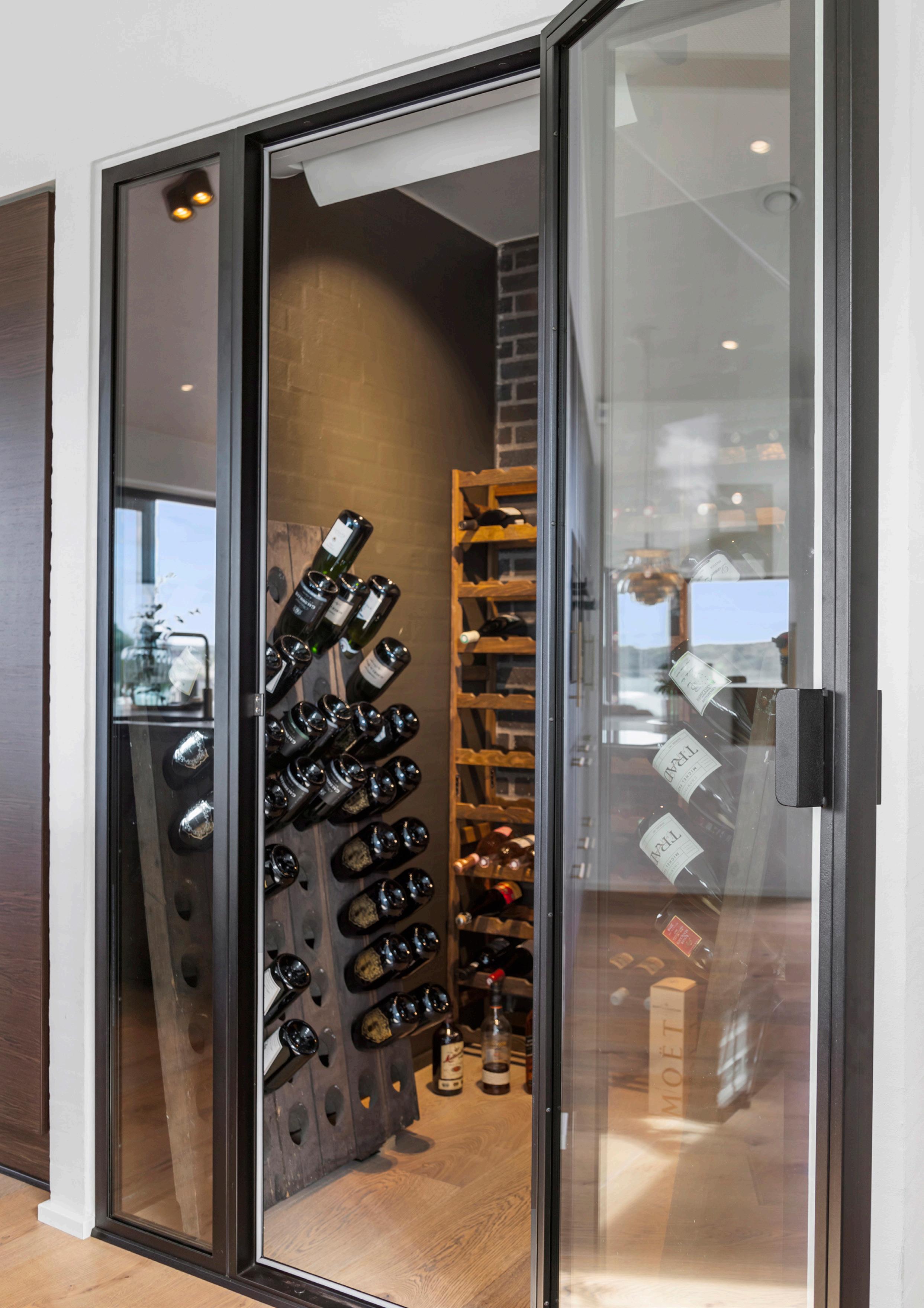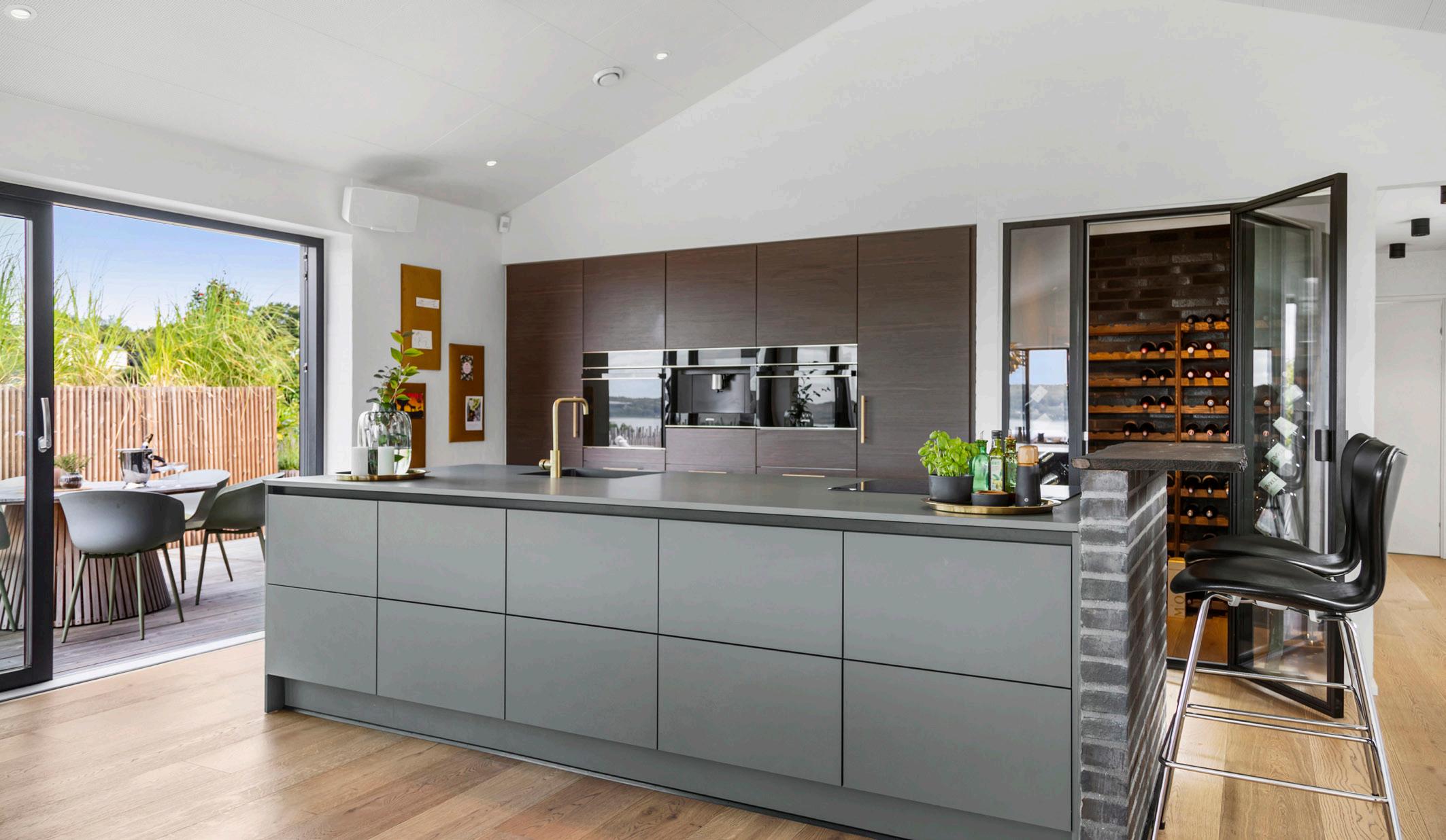 Køkken-alrummet er boligens naturlige hjerte – et åbent rum med loft til kip, hvor lys og udsyn får plads. Her finder du et gennemført HTH-køkken med hårde hvidevarer af høj kvalitet fra bl.a. SMEG og Liebherr samt en elegant kogeplade fra Witt med integreret emhætte. Et flot, kølet walk-in-vinrum ligger i direkte forlængelse af madlavningszonen. Store skydedøre åbner mod terrassen, så ude og inde kan flyde sammen på milde dage, og fra køkkenet er der frit udsyn mod fjorden. Materialevalget og den gennemførte håndværksmæssige finish binder rummet sammen med hjemmets øvrige rum.