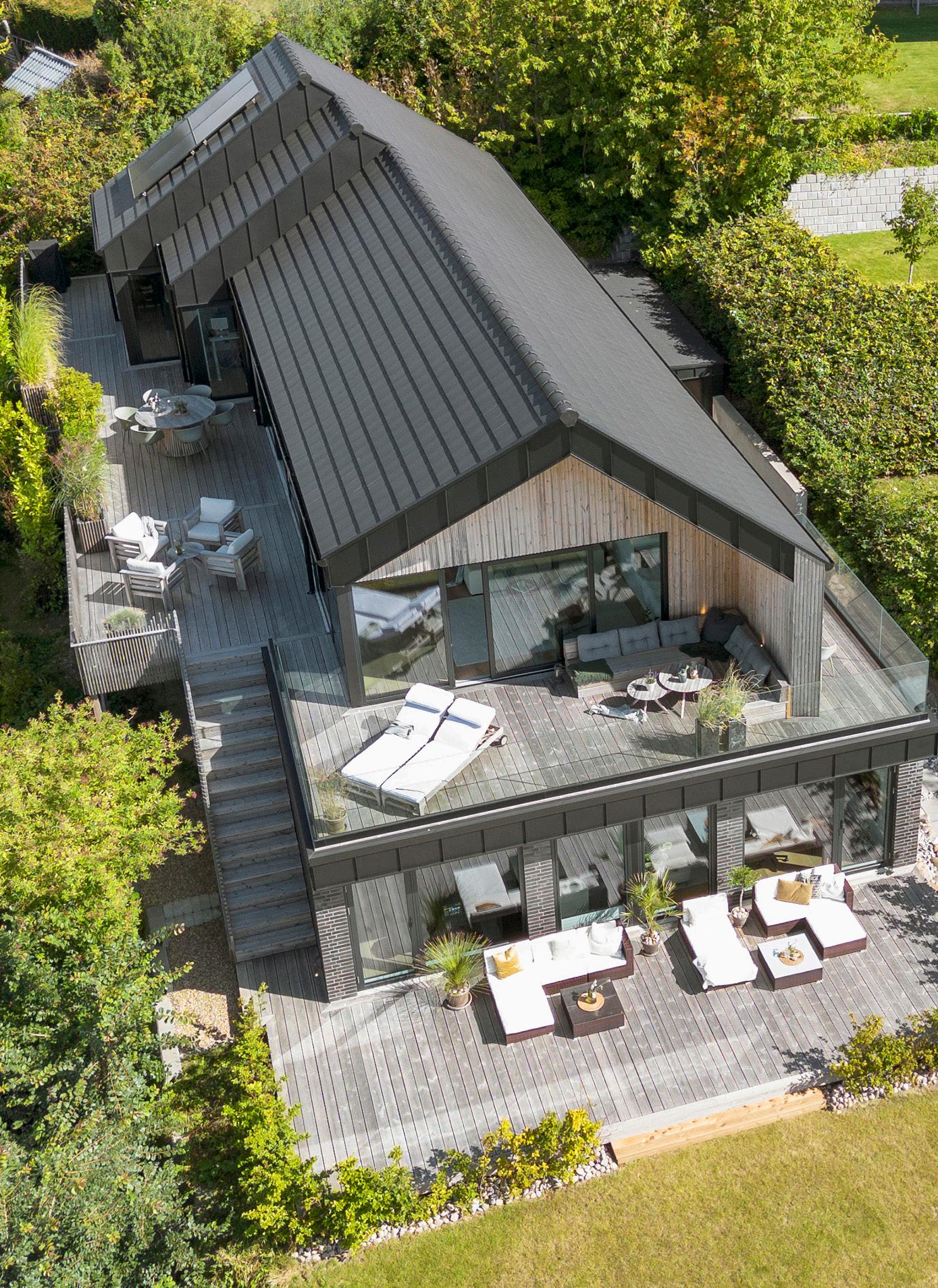 Uderummene ligger som sammenhængende opholdsflader omkring huset med terrasser hele vejen rundt, så der altid er mulighed for at sidde i sol eller læ.