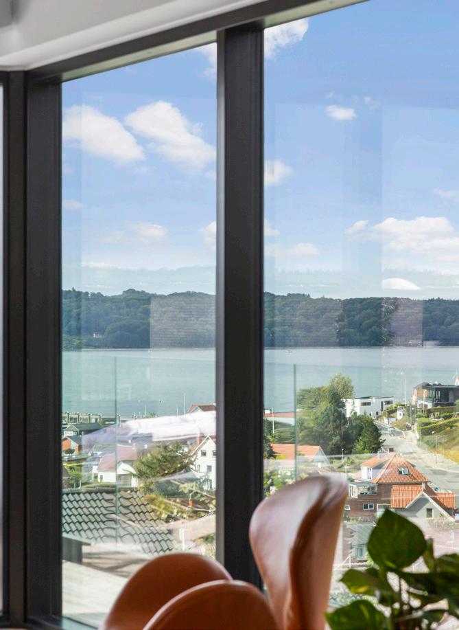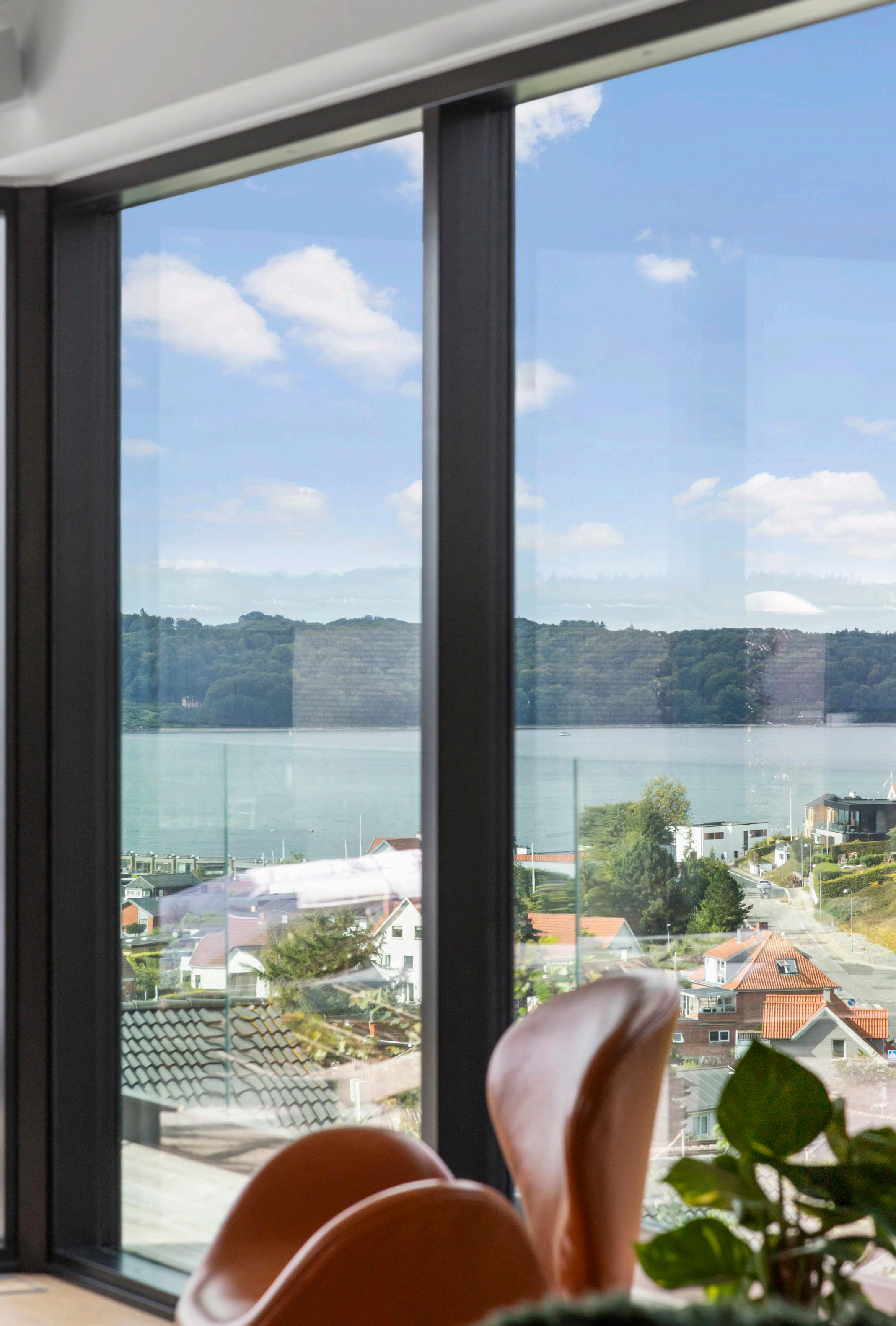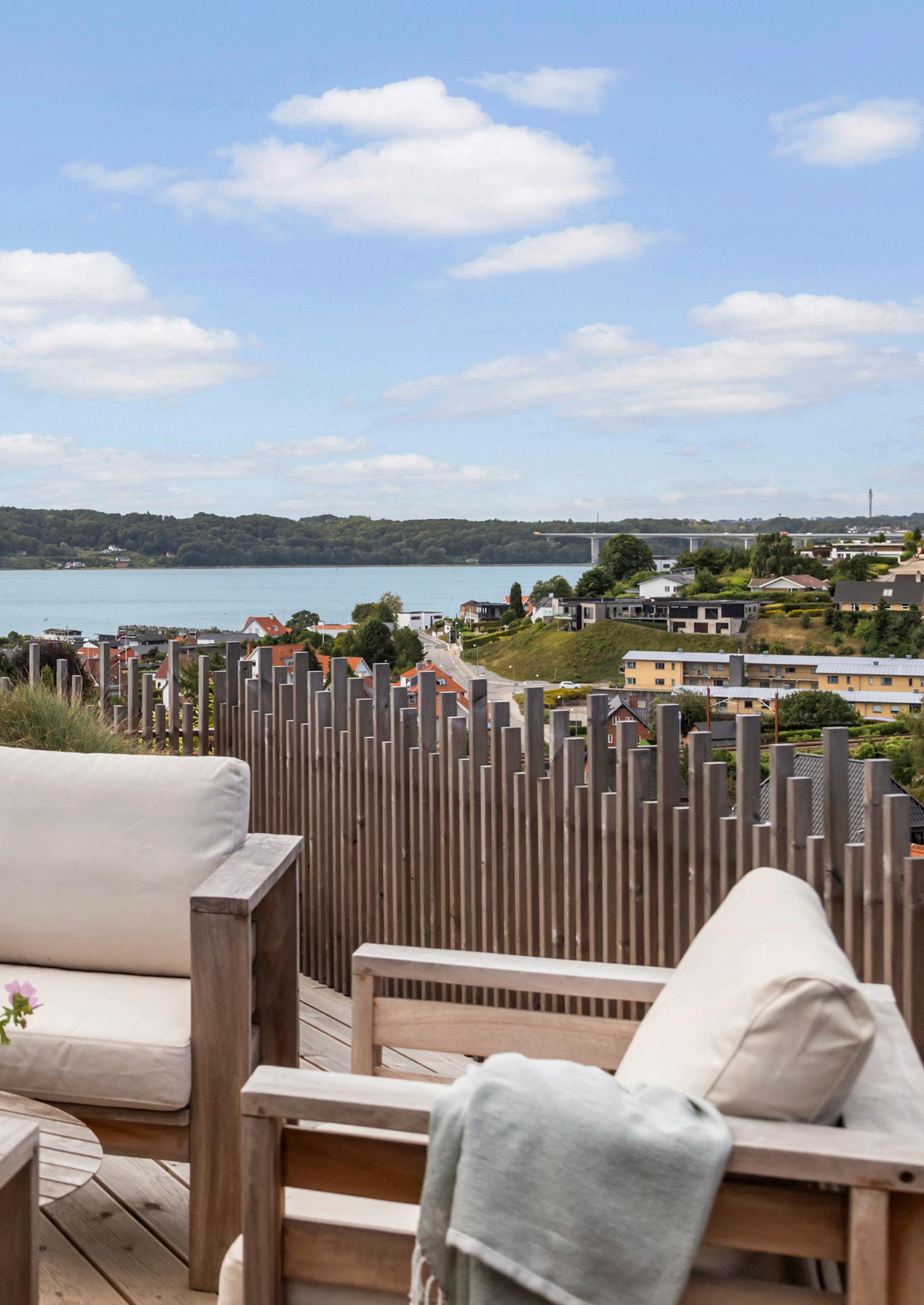 Fra den øverste terrasse er der udsyn over Vejle Fjord og broen, og terrasserne opleves som forlængelser af de indre rum.