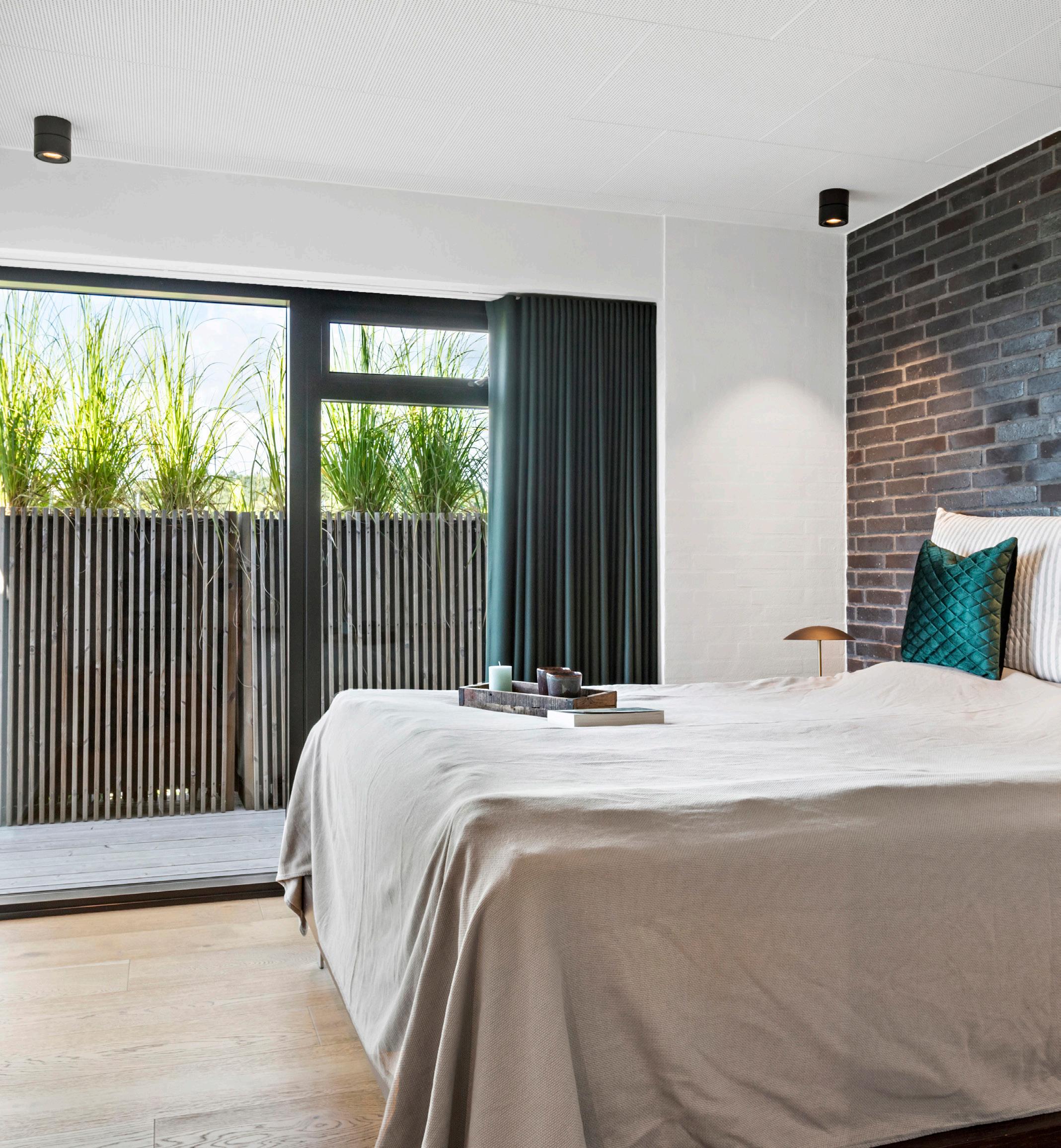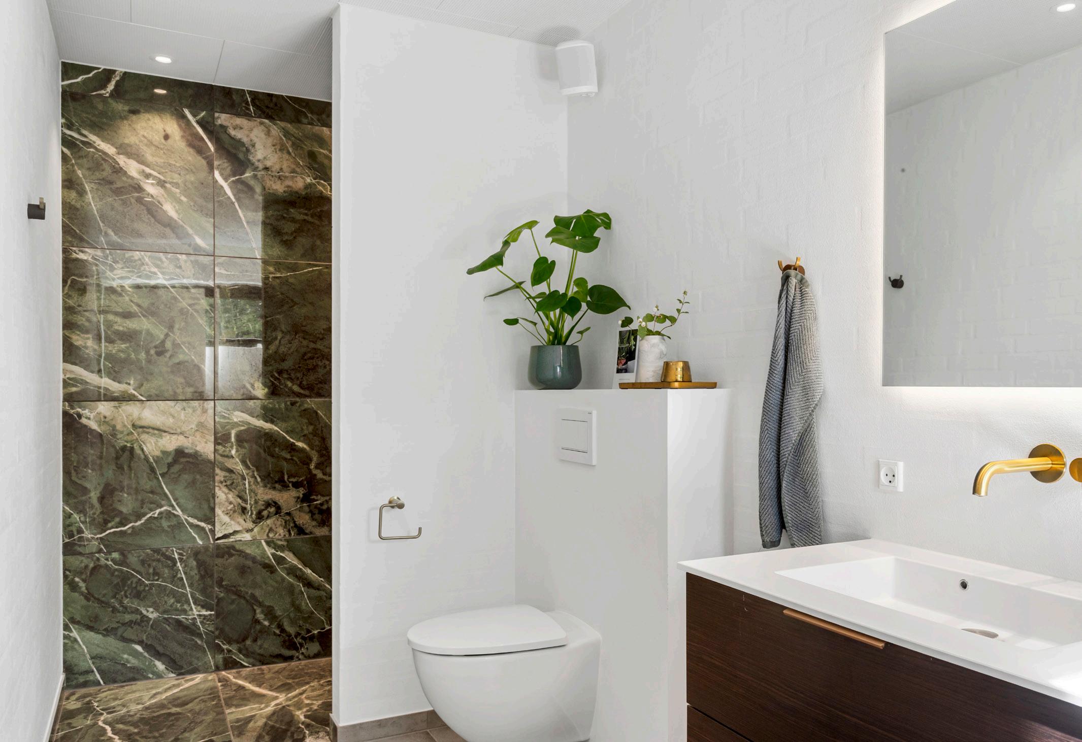 Påøverste plan fungerer mastersuiten som en særskilt forældreafdeling med direkte adgang til privat terrasse og udsigt, så morgenlyset naturligt bliver en del af rummet. Gulvet er lagt i varme egetræsplanker, og gulvvarmen sikrer en behagelig temperatur året rundt. Rummets proportioner er tilpasset en stor seng, og opbevaringsbehovet løses i et velindrettet walk-in-closet, som giver overblik og orden uden at fylde sovearealet. Det tilstødende badeværelse er rummeligt og holdt i varme nuancer med grøn marmor, mørke træelementer og store klinker i varm grå, og dobbelthåndvasken giver god bordplads til morgenrutinerne. Materialevalget viderefører den røde tråd fra resten af hjemmet og skaber en rolig og samlet forældreafdeling, hvor funktion og finish går hånd i hånd.