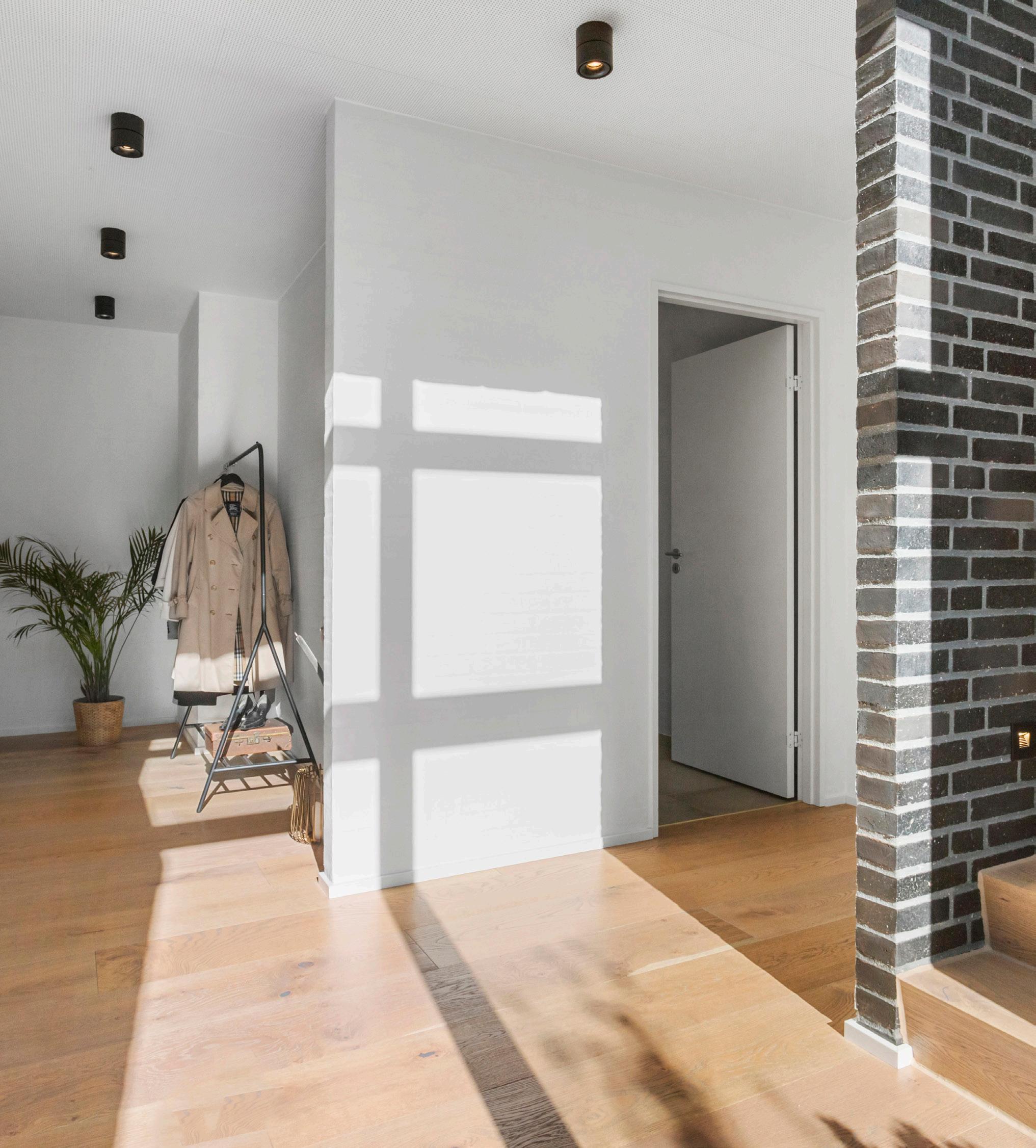 Når du træder ind i boligens hall, mødes du af de gyldne, brede egetræsplanker, der fører blødt videre ind i huset, og af rå, varme gråbrune murstensvægge, der giver rummet tyngde og tekstur. Lyset falder ind og skaber et blidt spil mellem træets årer og murens struktur, og der er tænkt plads til jakker og sko uden, at entréen bliver trang. Fra hallen løfter den håndlavede snedkertrappe sig med varme i trinene og fører op til de åbne opholdsrum, så overgangen mellem ude og inde både føles naturlig og velkomponeret.