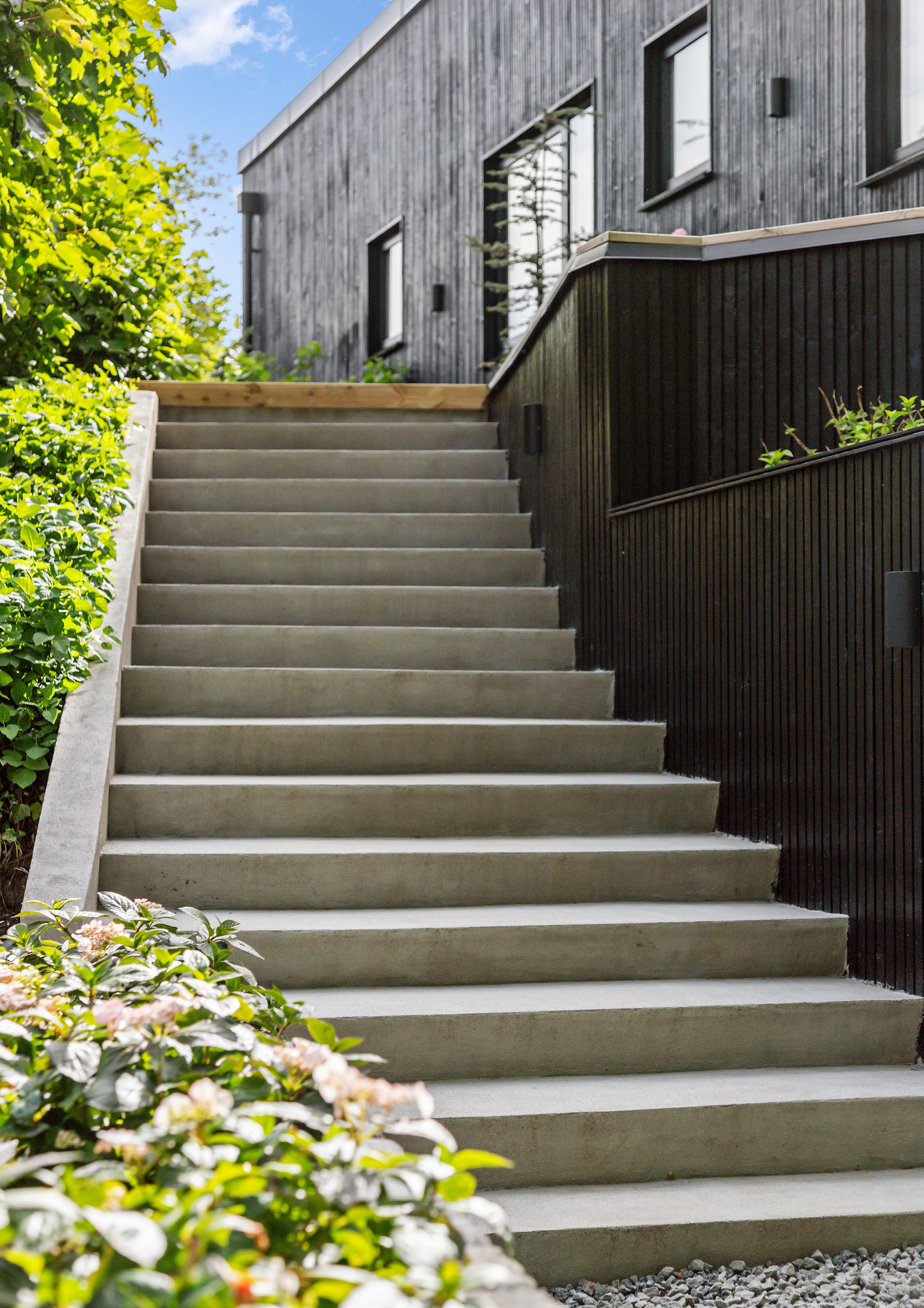 Et ny etableret velkomstområde med wow-effekt – gårdhave, trappe og stilren indkørsel.