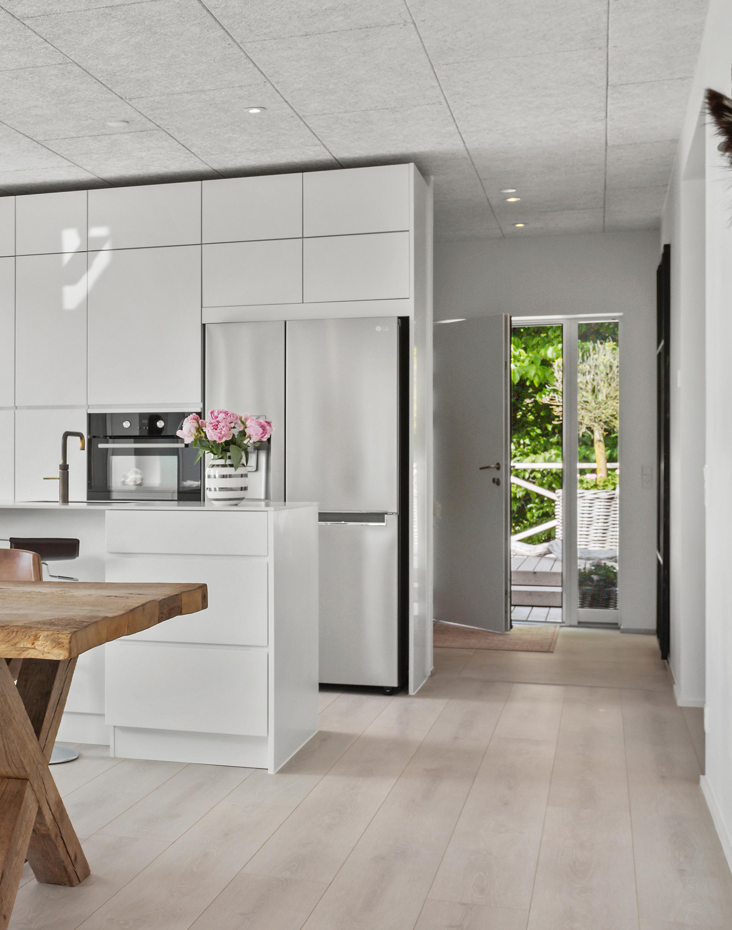 Huset er designet med et skarpt fokus på funktionalitet uden at gå på kompromis med æstetikken. De åbne rum, der strækker sig fra det moderne køkken til det rummelige alrum, giver en følelse af sammenhæng og flow. Køkkenet er udstyret med praktiske elementer som en Quooker-hane i messing og en integreret emhætte i kogepladen, og de parallelle elementer udnytter rummets højde med skabe fra gulv til loft. Køkkenet er ikke kun et praktisk arbejdsområde, men et rum, hvor man kan samles med venner eller familie, mens man tilbereder måltider med udsigt til den grønne skov og fjorden, der ligger lige udenfor.