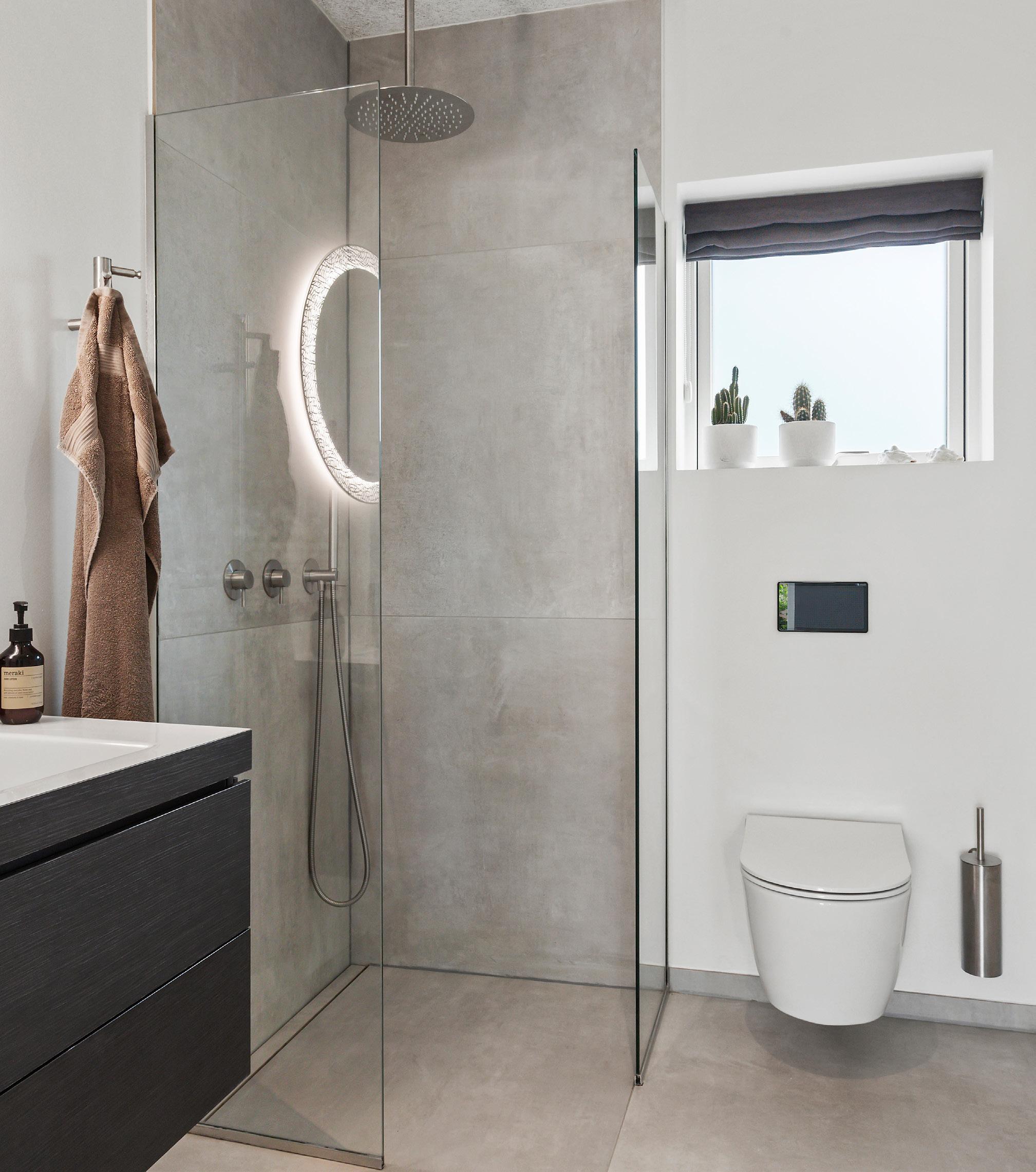 Ved siden af værelserne finder du et funktionelt badeværelse med lyse vægge og grå klinker, der passer godt til den enkle og moderne stil i resten af huset. Badeværelset er praktisk indrettet med alt, hvad du har brug for, og skaber en afslappet stemning. Det er et godt badeværelse til både børn og gæster, med nem adgang fra værelserne.