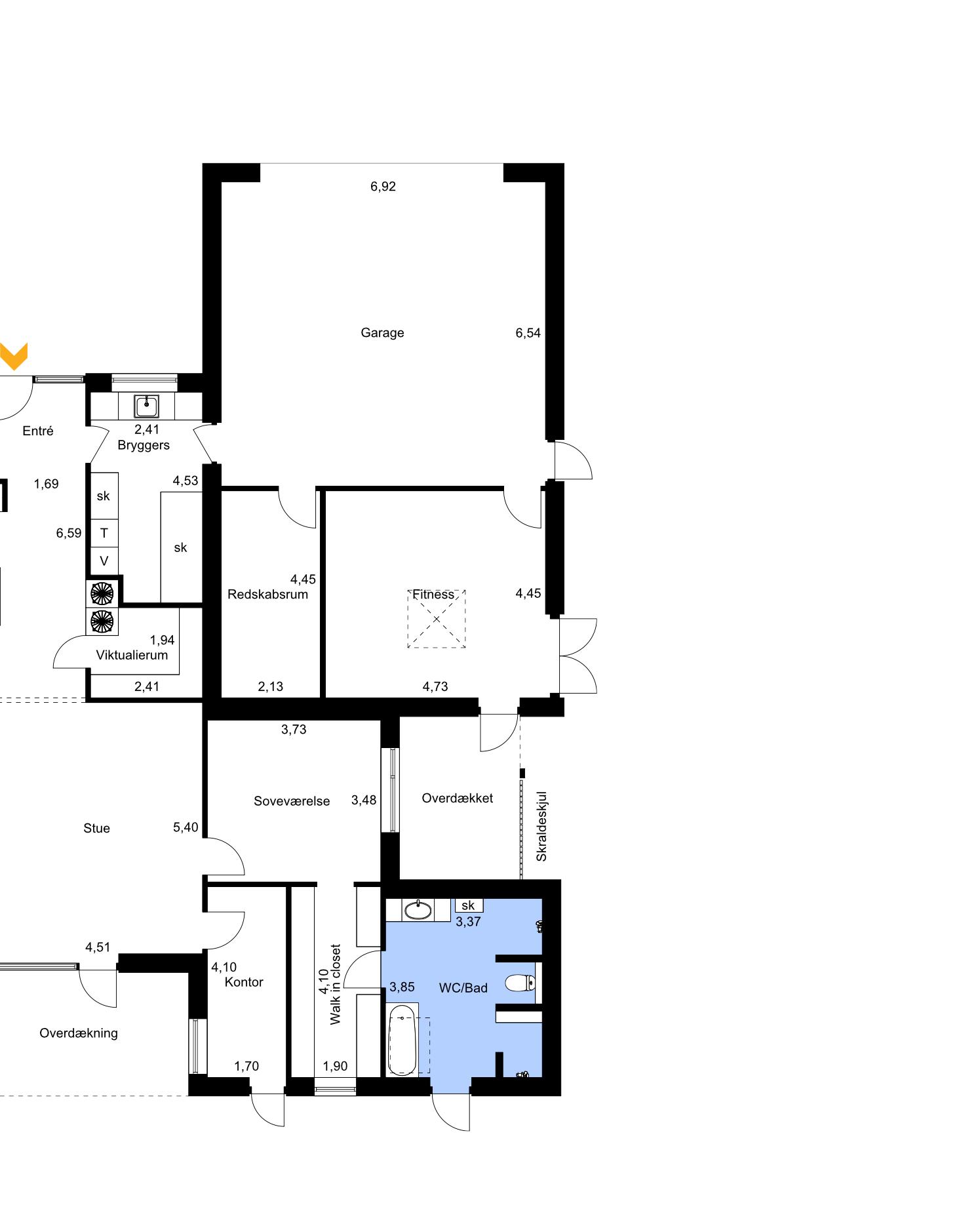 Entréen åbner op til husets forskellige sektioner og skaber en smuk overgang mellem de private og de sociale rum. Det første, du bemærker, er loftshøjden, som spænder fra imponerende 2,8 og helt op til 3,5 meter i køkkenalrummet.