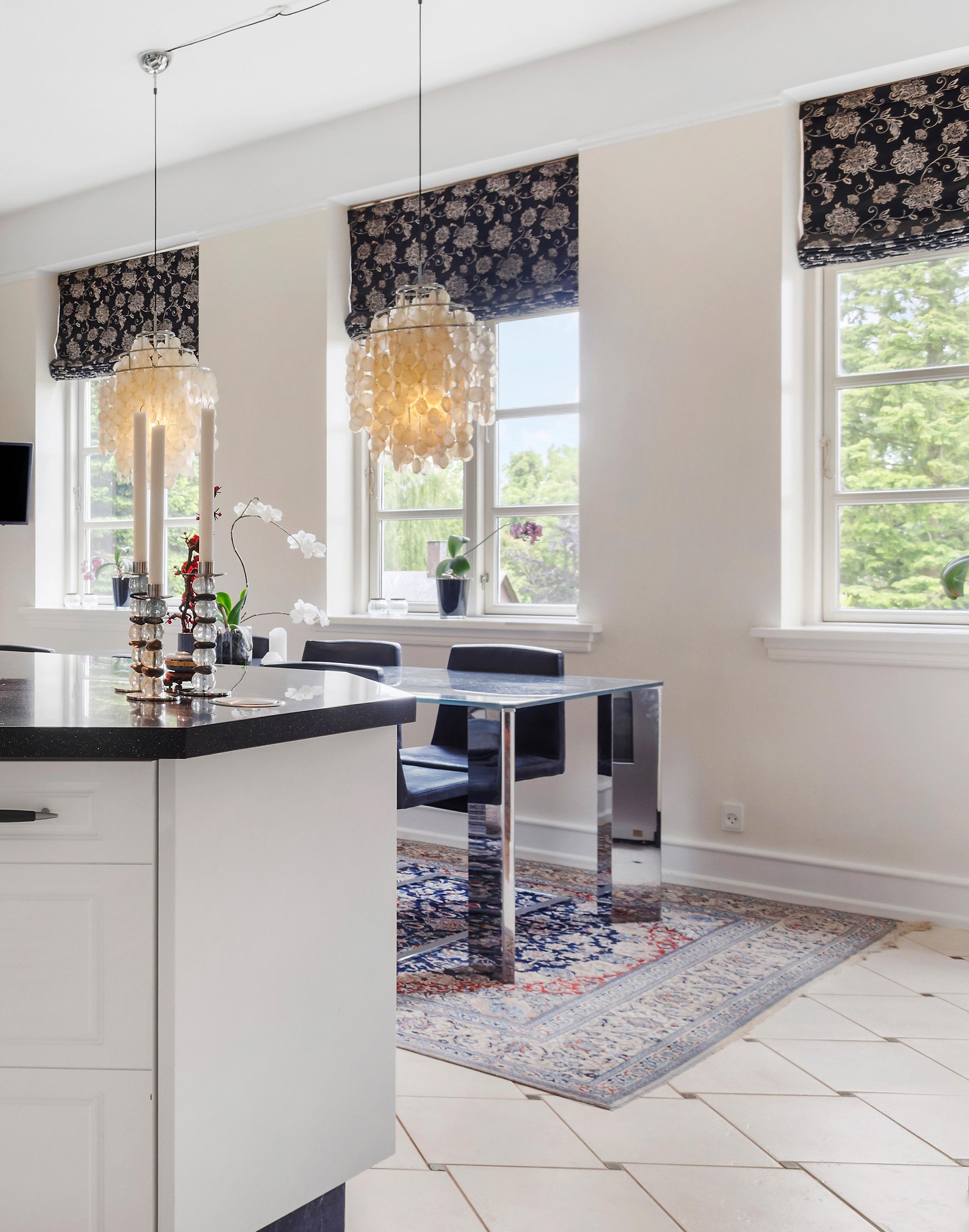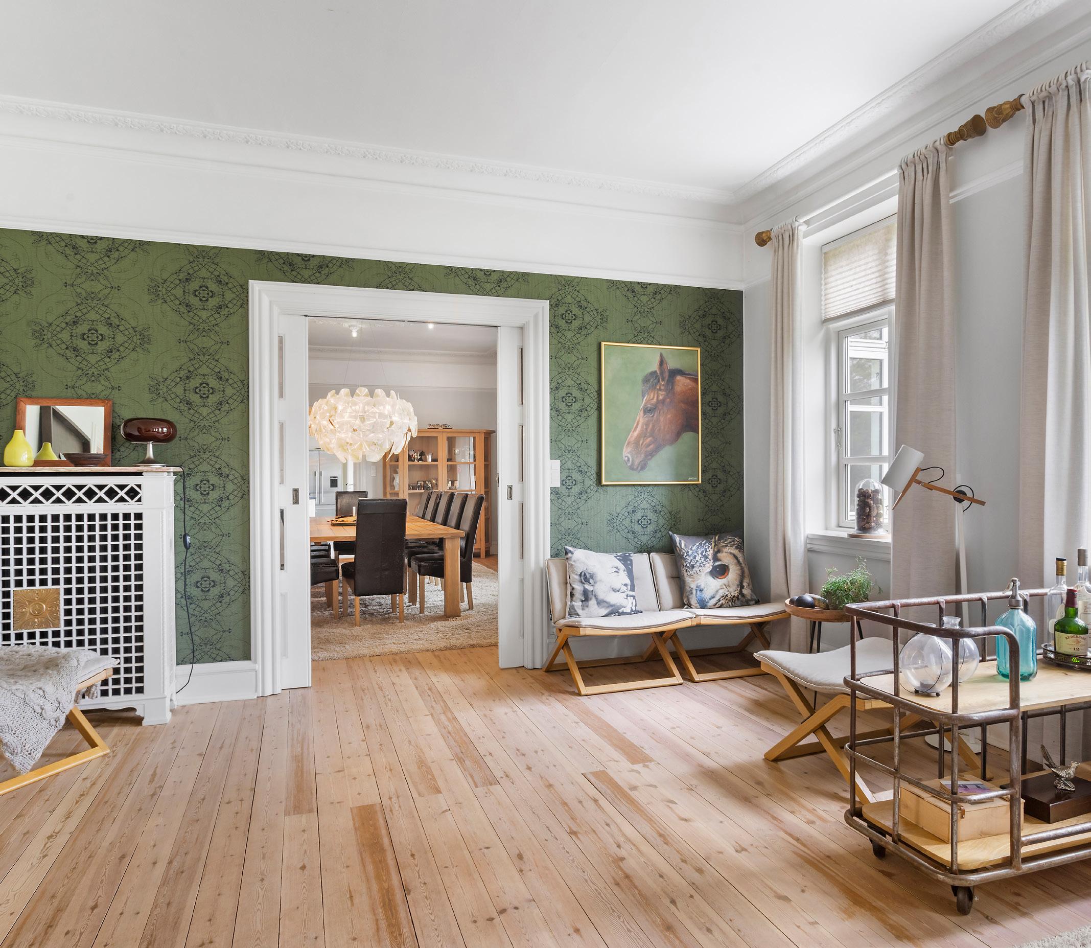 I den bagerste af stuerne tilfører biopejsen en behagelig varme og hygge, mens de høje vinduer lader dagslyset strømme frit ind. Herfra fortsætter man ind i den rummelige spisestue, hvor den smukke stukrosette i loftet understreger den herskabelige stemning. Her er plads til et imponerende langbord, hvor både familie og gæster kan samles til store middage og festlige anledninger.