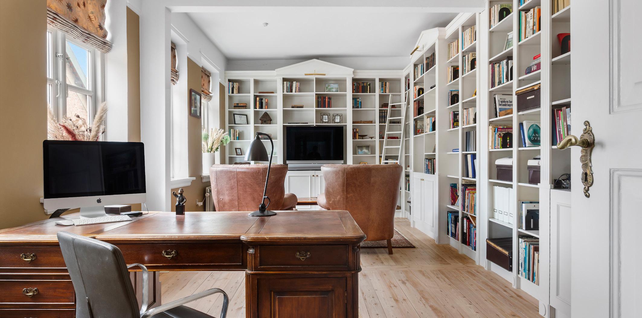 Ud over masterafdelingen rummer førstesalen flere rummelige værelser med hver deres karakter. I den modsatte kvist ligger et værelse med dobbeltdøre, en stor skabsvæg og udgang til en privat altan, hvor man kan nyde morgensolen og udsigten. De to øvrige værelser er placeret i gavlene og har begge en hyggelig stemning med skrå vægge, masser af plads og godt lysindfald. Værelserne har deres eget lyse og moderne badeværelse. I stueetagen ligger desuden et stemningsfuldt bibliotek og kontor med indbyggede reoler, og rummet har karakter af et klassisk herreværelse, der fuldender husets herskabelige udtryk. I forbindelse med hall’en er der et mindre, men charmerende gæstetoilet, hvor det originale terrazzogulv stadig er bevaret og tilføjer en autentisk detalje til helhedsindtrykket.
