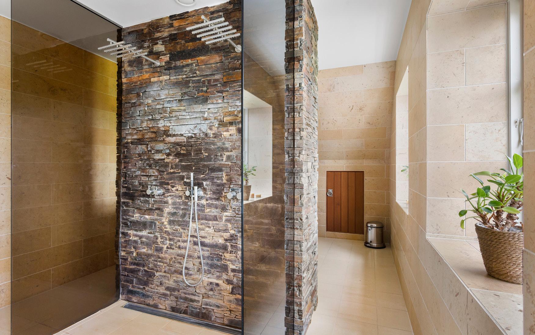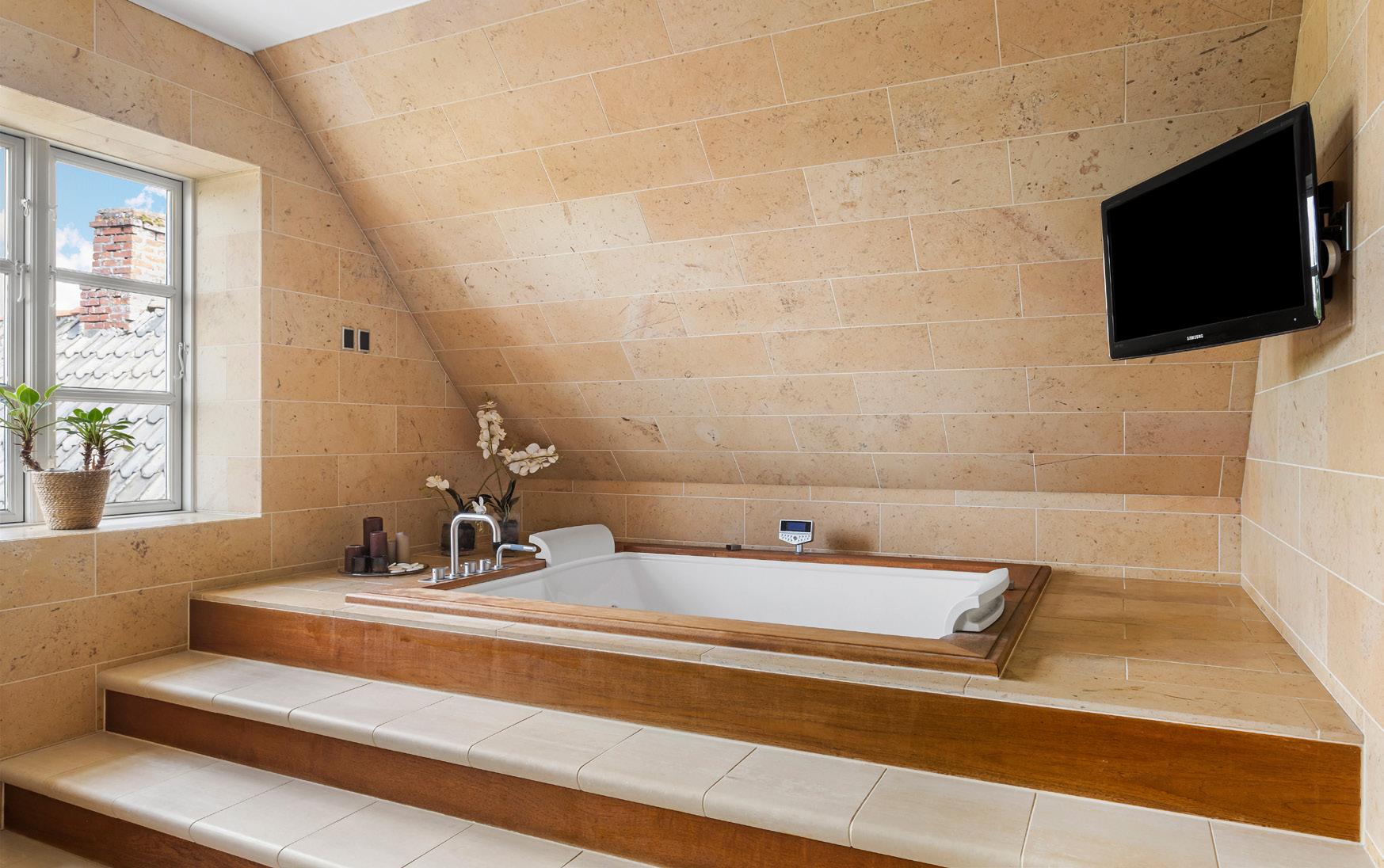 På førstesalen udfolder masterafdelingen sig med generøs plads og en velovervejet indretning. Soveværelset ligger centralt placeret i den ene af husets store kviste med kig til de omkringliggende marker, og fra dette rum er der adgang til garderobeområder på begge sider. Til den ene side er der adgang til et stort walk-in, mens der til den anden side ligger et rummeligt walk-through med skabe langs begge vægge, der elegant leder videre ind til det store badeværelse. Her venter en sand spa-oplevelse med dobbeltbruser, fritstående vaskemøbel bag en halvvæg samt et nedsænket spabad, der ligger hævet på sit eget plateau med trappe. De varme, organiske farver og udsigten til landskabet udenfor fuldender følelsen af afslappet luksus og privatliv.