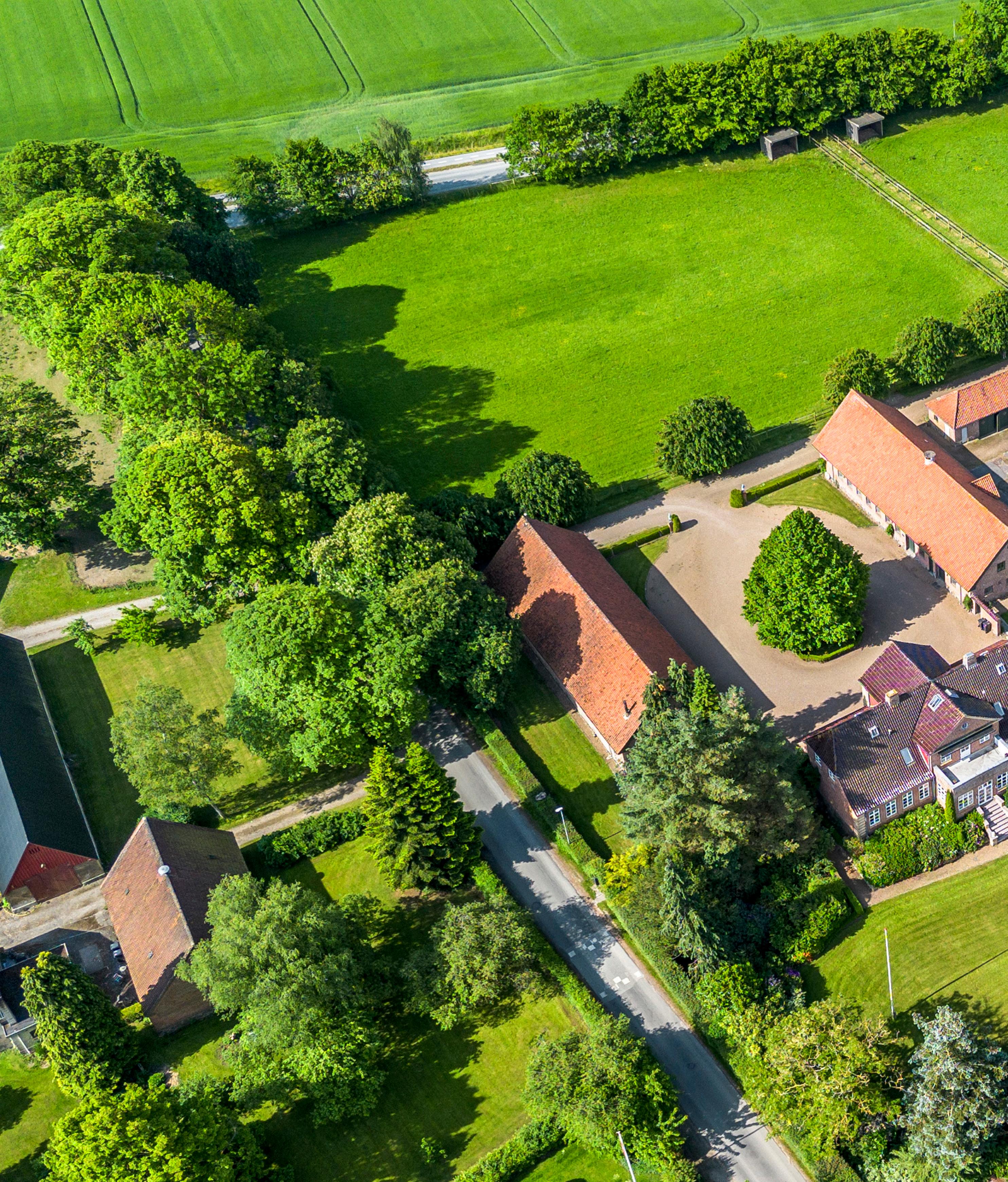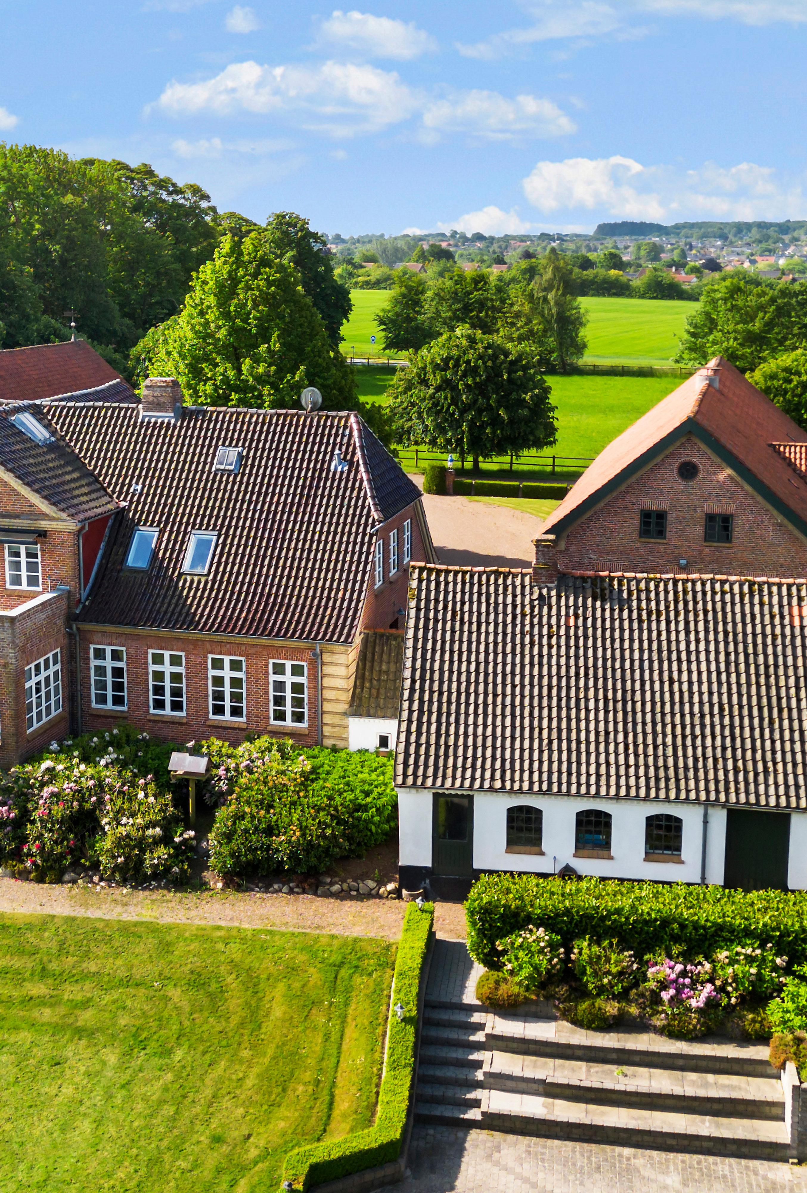 Denne historiske, men opdaterede, herskabsvilla og hesteejendom fra 1930, opført i karakteristisk herregårdsstil, udstråler en særlig form for rodfæstet værdighed med sine rødstensfacader, solide kampestenssokkel, markante frontgavle og hvide sprossevinduer. Hver detalje er præget af omhu og balance – fra det halvvalmede glaserede tegltag og de skarpt tegnede kvaderhjørner til den monumentale hovedtrappe og det gamle lindetræ, som majestætisk rejser sig midt i gårdspladsen og danner centrum for ejendommens velkomst.