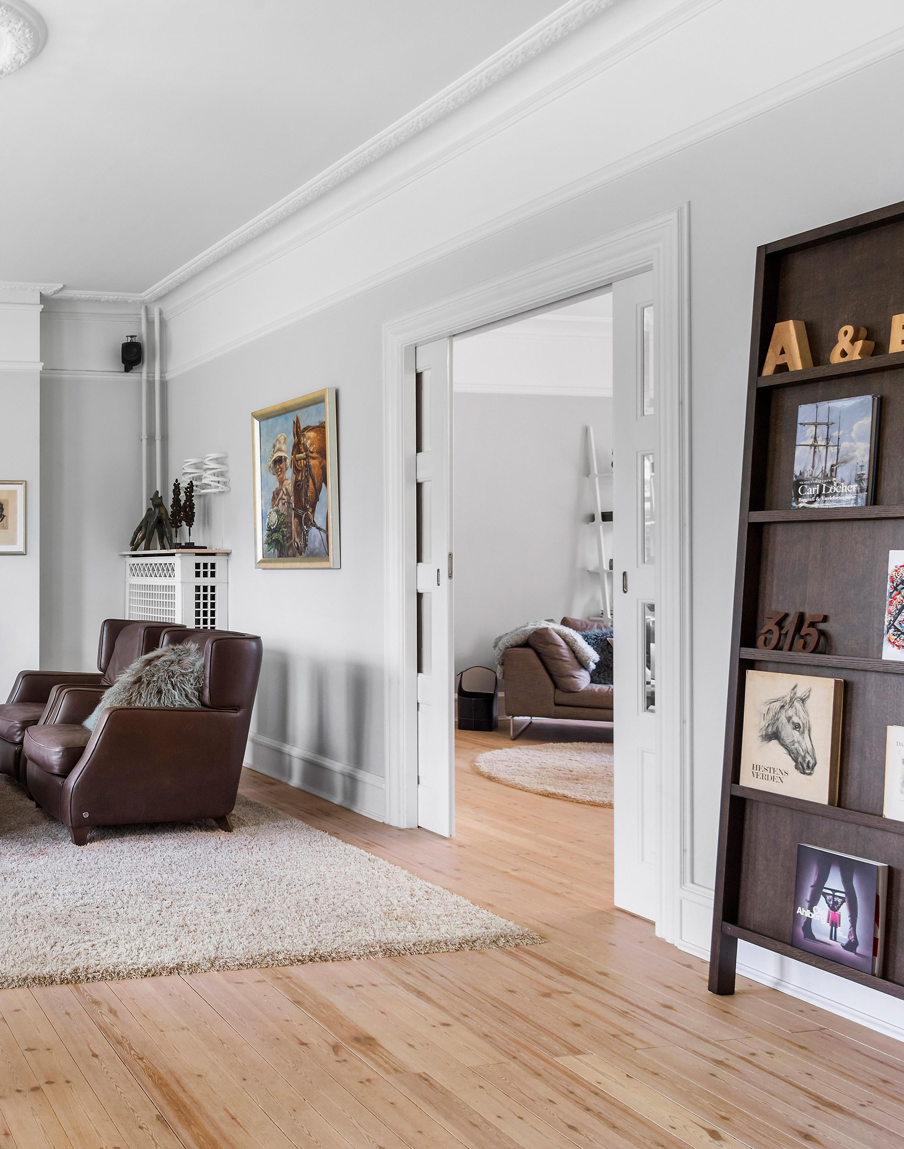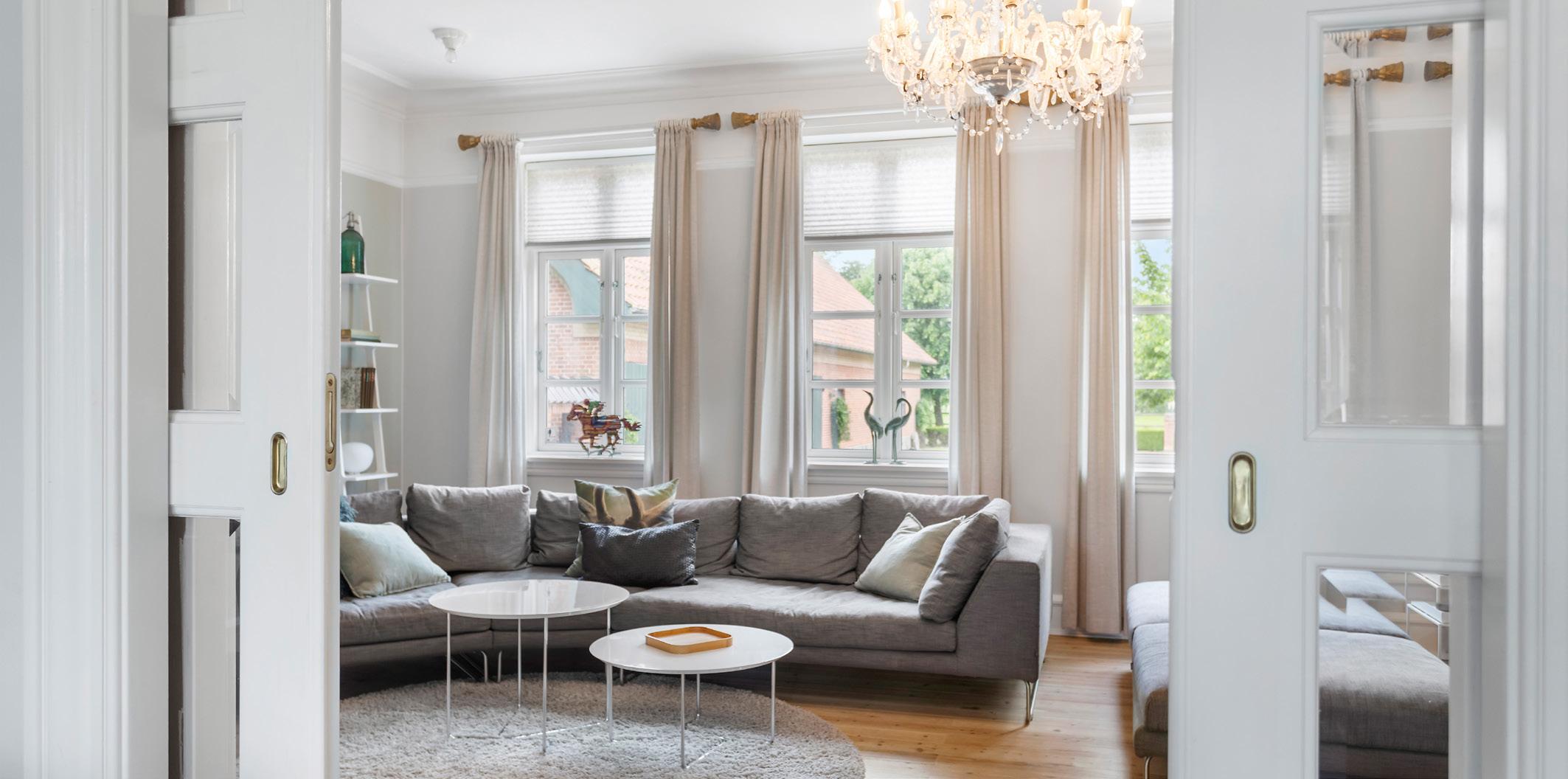 I hjertet af Gauerslundgård udfolder opholdsrummene sig med en rolig elegance, hvor hver funktion har sin naturlige plads. De to stuer en-suite er forbundet af klassiske skydedøre, så rummene både kan åbnes op til ét stort selskabsareal eller adskilles til mere intime opholdsrum.
