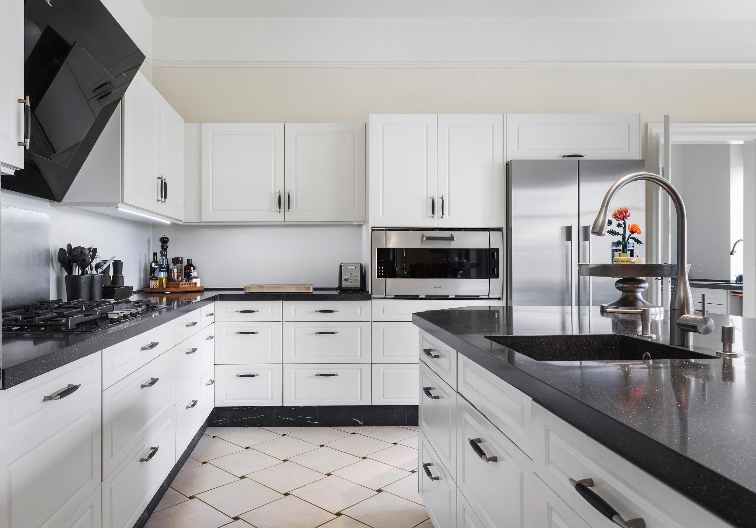 Køkkenet er indrettet som et lyst og praktisk centrum i boligen, hvor funktionalitet og æstetik mødes i en tidløs kombination. De hvide elementer står i fin kontrast til den mørke granitbordplade, og den store køkkenø danner både arbejdsplads og samlingspunkt i hverdagen. Fra køkkenet er der et smukt kig ud over den grønne parkhave, som giver en rolig og lys ramme omkring hverdagens aktiviteter. Alt er gennemtænkt med detaljer som vinkøleskab, ekstra bred ovn og god bordplads, der gør køkkenet velegnet til både daglig madlavning og større middage. Og ønsker man at spise mere uformelt, er der i selve køkkenet også god plads til et relativt stort spisebord, så måltiderne kan nydes med udsigt til haven i mere afslappede rammer.