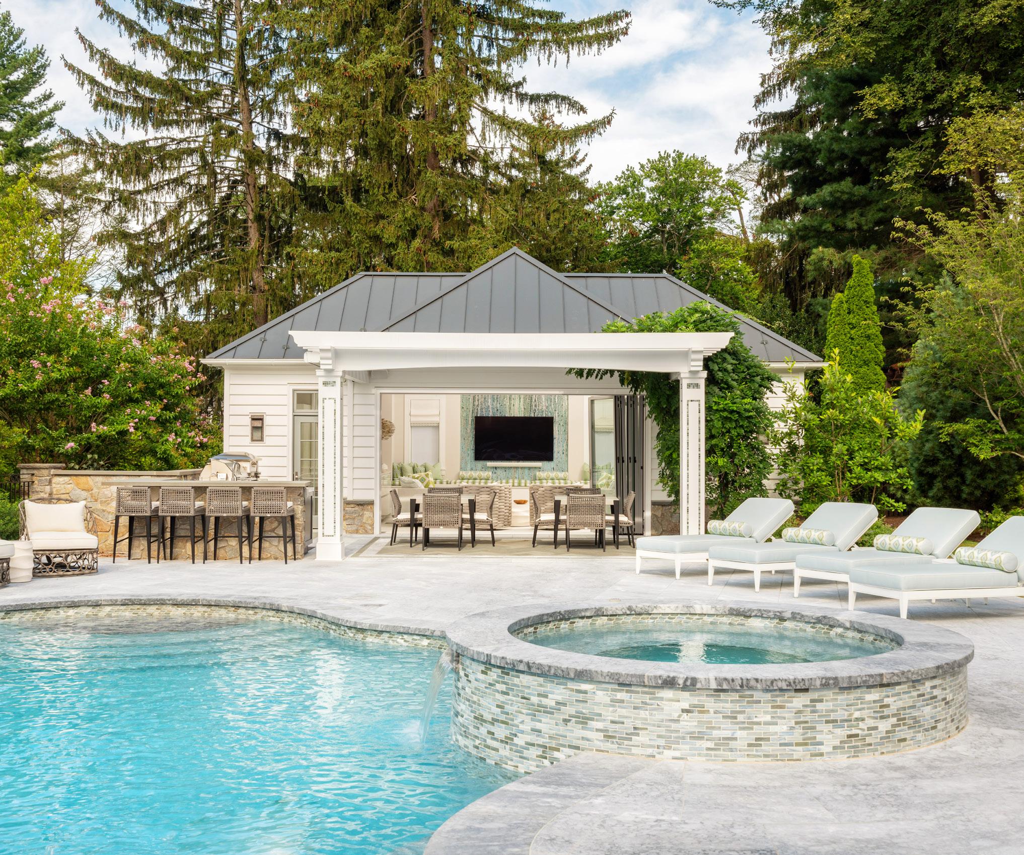 This English Tudor house, built in the early 1900’s, needed refurbishing from top to bottom. An addition with a glass surrounded family room was added; taking its inspiration from an English orangery. We renovated the opposite end of the house, removing a one story addition and green house, creating a secluded study. We added a two story addition housing a family entrance, new rear stair and an elevator. New large openings infilled with steel windows and doors from the living room and dining room. Finally, we designed a pool and pool house with new terraces.