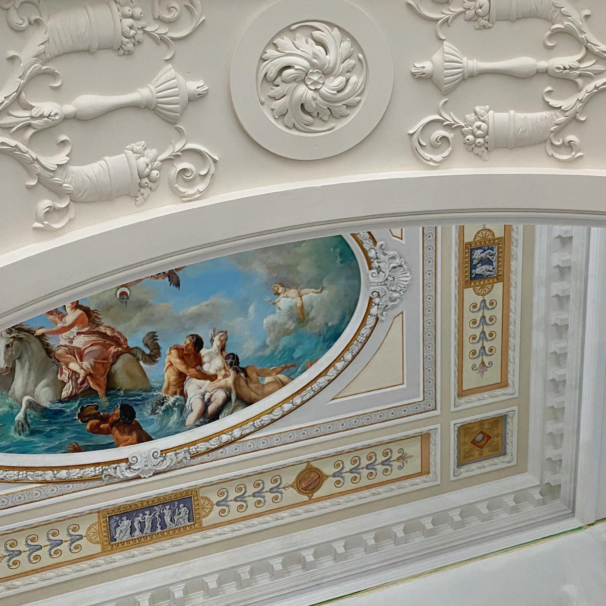 These glamorous rooms are meant to be lived in, so fragile fabrics and antique furnishings were placed strategically to extend their lifespan. Period lighting fixtures and 19th Century antiques mingle with original millwork, and a scenic mural based on country house precedents supports the breathtaking 400 square foot leaded glass skylight. We designed numerous custom light fixtures based on a single surviving example, produced wallpapers inspired by the originals, and created trompe l’oeil-stained glass compositions reminiscent of the original skylights. In the end, this historic home is now livable, touchable, and thoroughly welcoming.