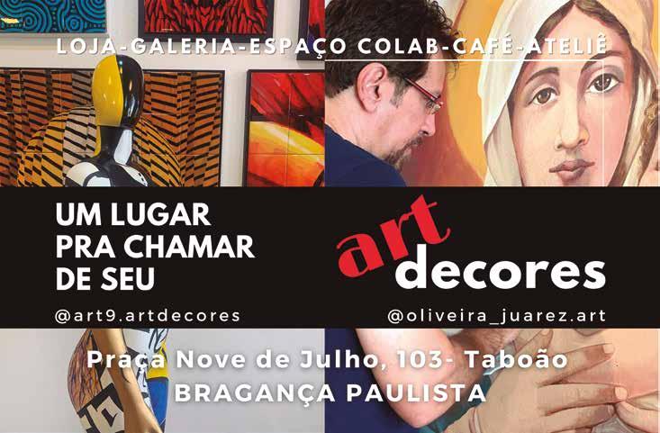 Nova Perfil e Fama - 13 A ART9 FEIRA DE ARTE CONTEMPORÂNEA CHEGOU EM BRAGANÇA PAULISTA PARA FICAR. COM UM TOQUE DE OUSADIA E CORAGEM, O ARTISTA PLÁSTICO, CONSERVADOR E RESTAURADOR JUAREZ OLIVEIRA TROUXE PARA A CIDADE UM EVENTO ÚNICO E INOVADOR, QUE TEM COMO PROPÓSITO MUDAR A PERSPECTIVA E O OLHAR DAS ARTES NO INTERIOR. OS ARTISTAS EXPOSITORES SELECIONADOS COM CURADORIA DA GALERIA ARTDECORES, DE SUA PROPRIEDADE, MOSTRARAM EM EXP OSIÇÃO NO BRAGANÇA GARDEN SHOPPING QUE O INTERIOR NÃO SOMENTE FAZ ARTE, MAS O FAZ COM MUITO TALENTO. NOSSOS ARTISTAS: ALESSANDRO BARROS • DEPROENÇA • ANA ROBERTA • ARMANDO RIBEIRO • ARY BUARQUE • MARCELO GOULART • BIA RAPOSO E ALEXANDRE BERALDO • ALEX TUCCI • EVELYN GONORETZKY • HILTON MERKA • JOANA AGUIAR • RICO W • ORQUESTRA CAMERATA JOVEM DE CAMPINAS • PATRÍCIA NÓBREGA • PAULO VETTORE • SAMUEL MATO • SILVIO ALVAREZ • SIMONE FRANCYS • URUBU ARTS NOSSOS APOIADORES