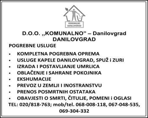 J A V N O O B J A V LJ U J E da je kod ovog Javnog izvršitelja u toku izvršni postupak po predlogu izvršnog povjerioca, protiv izvršnog dužnika Maljević Đorđa iz Bara, Čeluga br. 44, na osnovu vjerodostojne isprave – izvršne isprave – založne izjave UZZ. Br. 286/2014 od 04.04.2014. godine. Javni izvršitelj nije mogao da izvrši uredno dostavljanje pismena u vidu zaključka o prodaji od dana 24.10.2022. godine, kod izvršnog dužnika. S tim u vezi potrebno je da se izvršni dužnik u roku od 8 dana obrati ovom Javnom izvršitelju radi preuzimanja pismena, u suprotnom, dostavljanje se vrši javnim objavljivan jem, a smatra se izvršenim danom posljednjeg objavljivanja. Ovakav način objavljivanja smatra se urednom dostavom i negativne posljedice koje mogu nastati snosiće izvršni dužnici.