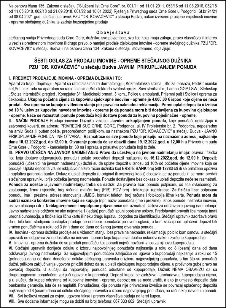 II Šesto javno nadmetanje za prodaju nepokretnosti održaće se dana, 05.12.2022. godine u 12,00 časova, u kancelariji Javnog izvršitelja u Baru, Bul. 24. Novembra bb.