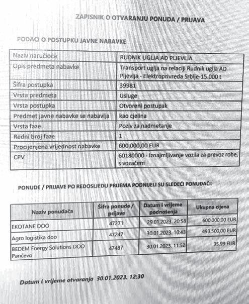 U tu svrhu menadžment Rudnika uglja je raspisao tender kojim se traži kompanija koja bi realizovala usluge prevoza od Pljevalja do Obrenovca.