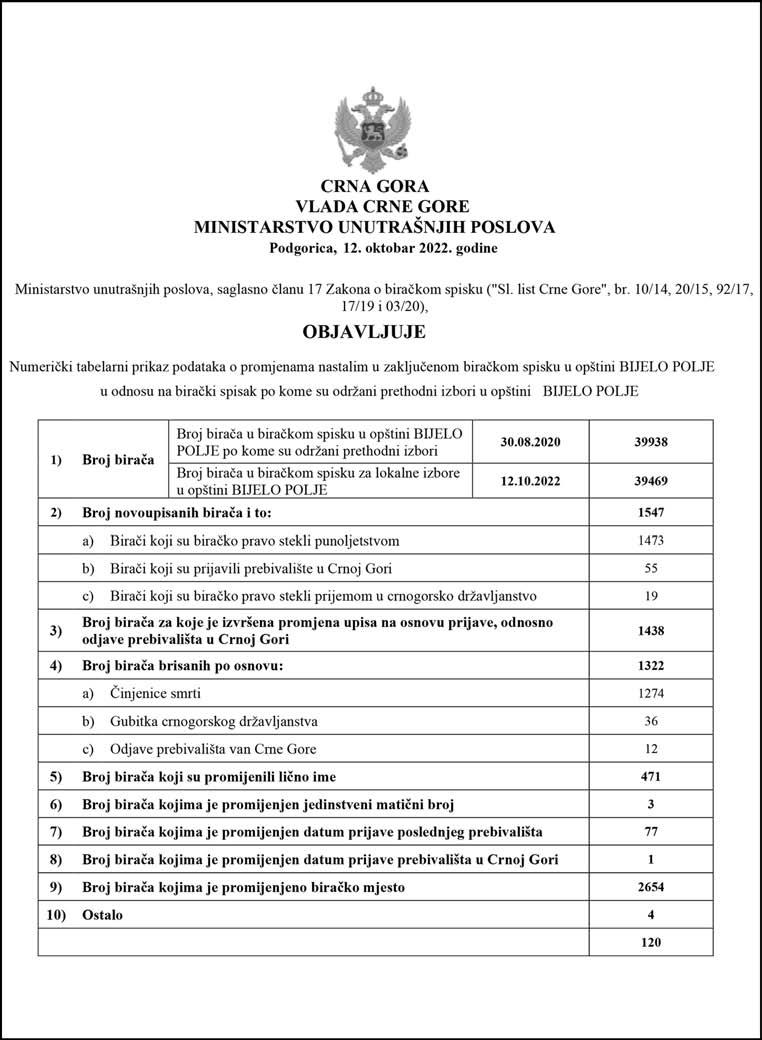 Na lokalnim izborima u Bijelom Polju pravo glasa ima 39.469 građana, za 500 manje u odnosu na 2020. godi nu. Biračko pravo na izborima u Šavniku ima 1.968 građa na, što je razlika u odnosu na parlamentarne izbore kada je 1.618 građana imalo pravo glasa.