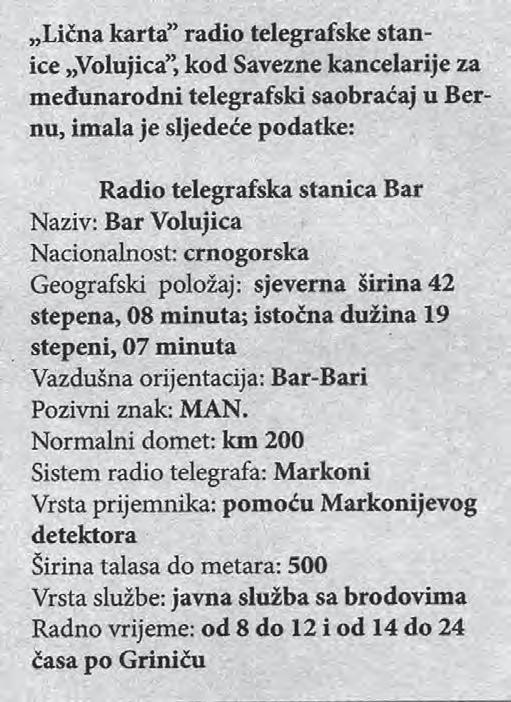 lujica kod Bara – San Kataldo – Bari u Italiji. Svečanom otvaranju prisustvovali su crnogorski kralj Nikola i izumitelj Guljermo Markoni. Stigli su tada telegrami – čestitke iz inostranstva – iz Beča, Petrograda, Rima i Beograda