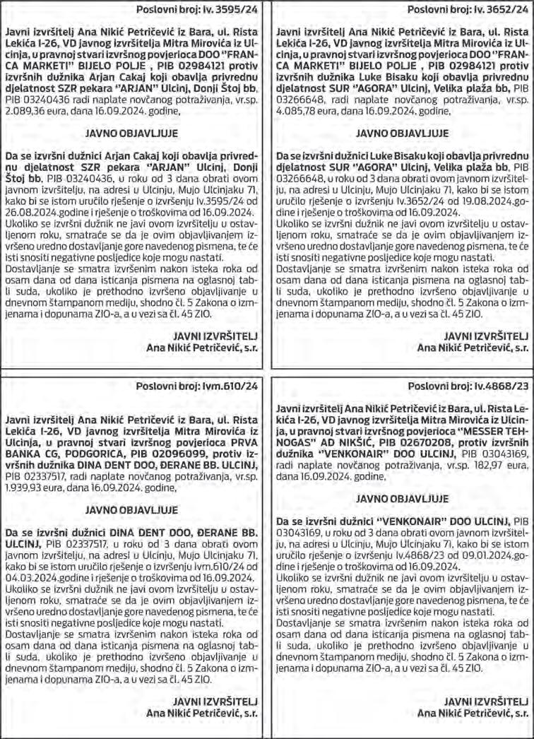 S tim u vezi potrebno da se dužnik u roku od tri dana obrati ovom javnom izvršitelju radi preuzimanja pismena, u suprotnom dostavljanje se vrši isticanjem na oglasnoj tabli Osnovnog suda u Podgorici.