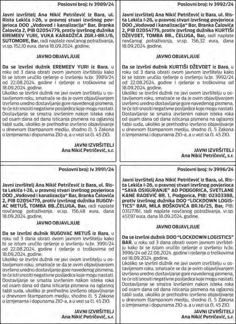 Poslovni broj : Iv.br.1091/24 Javni izvršitelj Ivan Petrović, Ul. Njegoševa 45, (PC Petović), Podgorica, odlučujući u izvršnoj stvari izvršnog povjerioca Vukčević KOP, PIB:02376997, adresa: Bracana Bracanovića 68, protiv izvršnog dužnika Global project doo, ulica Sergeja Jesenjina 7, Podgorica, PIB:03256600, radi naplate novčanog potraživanja izvršnog povjerioca u ukupnom iznosu od 5.606,85 €, u smislu člana 45 ZIO-a dana 18.09.2024.godine, JAVNO OBJAVLJUJE