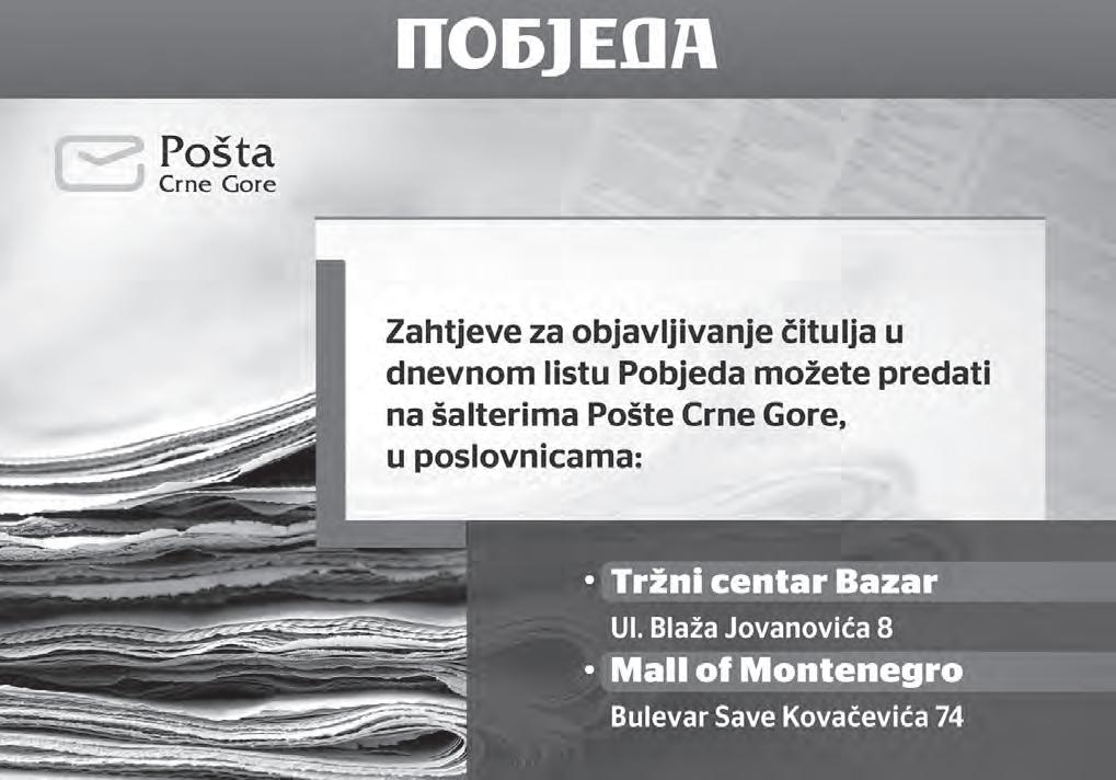 Poneđeljak, 7. oktobar 2024. | Podgorica, Crna Gora | Godina LXXX / Broj 21137 | Prvi broj izašao je 24. oktobra 1944. u Nikšiću | pobjeda.me | Cijena 1 euro NE! RATU U UKRAJINI