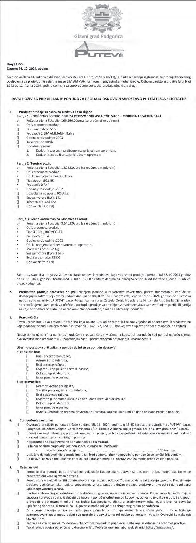 III Pravo učešća na javnom pozivu i uslovi za učešće Pravo učešća imaju sva domaća i strana fizička pravna lica koja dostave sledeće dokaze: Za fizička lica : ime i prezime, adresa stanovanja i ovjerena kopija lične karte Za pravna lica : naziv, sjedište i ovjerenu kopiju o registraciji iz Centralnog registra privrednih subjekata. Pored opštih uslova, zainteresovana lica su dužna da dostave dokaz o uplaćenom depozitu u iznosu od 5 % od ukupne vrijednosti predmeta, to 366,14 eura ( tri stotine šesdeset šest eura i 14/100). Depozit uplatiti na žiro račun ZU Dom zdravlja Tivat broj 530-5130-46 kod NLB banke, sa naznakom – depozit za učešće na javnom nadmetanju. IV Način i rok dostavljanja ponude Ponude dostavljati neposredno ili putem pošte u zatvorenoj koverti sa naznakom „Za učešće na javnom pozivu za prodaju pokretne stvari – RTG aparat “ na adresu ZU Dom zdravlja Tivat, Istarska br. 8, Tivat Rok za podnošenje prijava odnosno ponuda je 15 dana od dana objavljivanja poziva, zaključno sa 08.11.2024. godine do 10 sati. Otvaranje pristiglih ponuda izvršiće Komisija dana 08.11.2024. sa početkom u 12 sati u Sali za sastanke ZU Dom zdravlja Tivat uz prisustvo zainteresovanih ponuđača. Ukoliko bude više zainteresovanih ponuda, javno nadmetanje će se izvršiti nakon otvaranja ponuda. Neblagovremene i nepotpune ponude se neće vrednovati. Razgledanje predmeta prodaje omogućiće se svim zainteresovanim licima svakog radnog dana dok traje javni poziv u periodu od 13h – 14h u prostoriji gdje se nalazi predmet prodaje. V Uslovi javnog nadmetanja Smatraće se da su ispunjeni uslovi za održavanje javnog nadmetanja, ako u naznačeno vrijeme pristupi makar jedan učesnik, a koji ponudi iznos početne cijene za predmet prodaje.