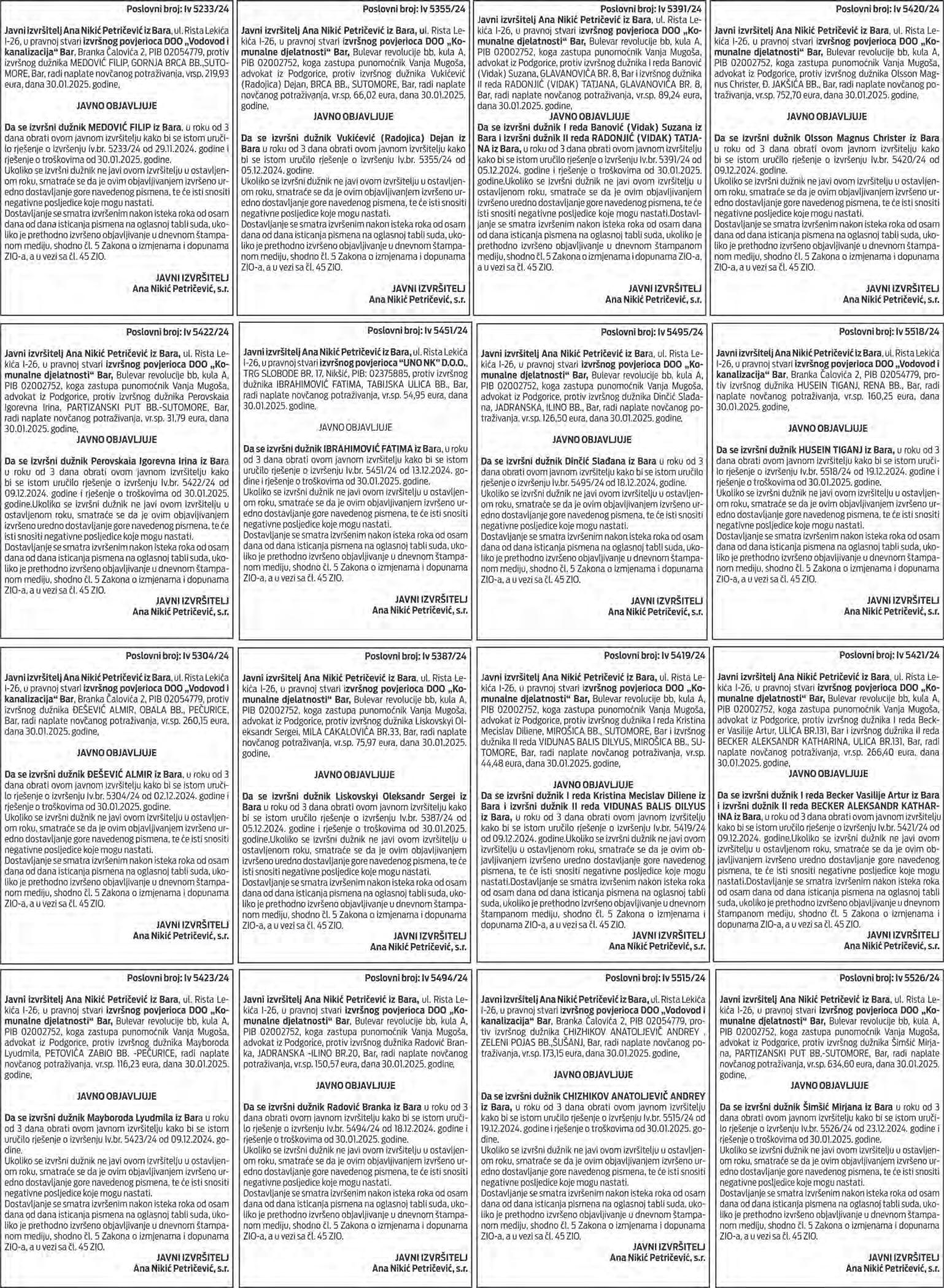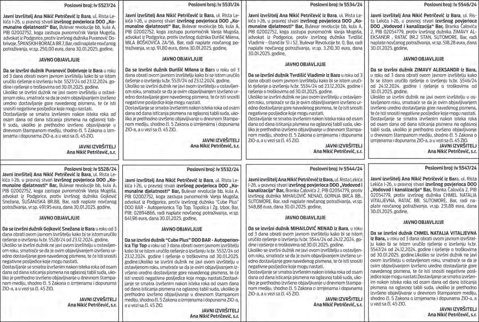 Izvršnom dužniku Mijušković Ranku, Kunak bb, Nikšić, vrši se dostavljanje Rješenja o izvršenju poslovne oznake Iv.br.1274/2024 od 28.11.2024. godine sa predlogom prilozima kojim je isti obavezan da na ime duga osnovom navedene isprave isplati izvršnom povjeriocu iznos od 369,00 eura sa pripadajućom kamatom i troškovima izvršnog postupka rješenja o troškovima poslovne oznake Iv.br.1274/2024 od 28.01.2025. godine. Izvršni dužnik Mijušković Ranko iz Nikšića se može obratiti javnom izvršitelju Maji Ajković na adresu Ul. Novaka Ramova br.3 u Nikšiću to u roku od 5 dana od dana poslednjeg objavljivanja oglasa, radi podizanja Rješenja o izvršenju poslovne oznake Iv.br.1274/2024 od 28.11.2024. godine sa predlogom i prilozima Rješenja o troškovima poslovne oznake Iv.br.1274/2024 od 28.01.2025. godine. Upozorava se izvršni dužnik Mijušković Ranko iz Nikšića, da se ovakav način dostave smatra urednim da će negativne posledice koje mogu nastati ovakvim načinom dostavljanja snositi sama stranka, odnosno izvršni dužnik. Dostavljanje se smatra izvršenim nakon isteka roka od osam dana od dana isticanja pismena na oglasnoj tabli suda, ukoliko je prethodno izvršeno dostavljanje u dnevnom štampanom mediju. Nikšić, 28.01.2025.godine. JAVNI IZVRŠITELJ Maja Ajković