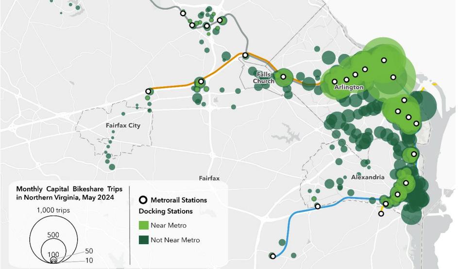 The map above shows Capital Bikeshare trips near Metro stations in Northern Virginia during the month of May 2024.