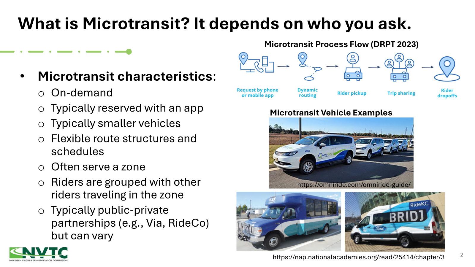 regional collaboration as well as to provide information for those who brief elected officials. Members heard from NVTC's Xavier Harmony, as well as representatives from Arlington and Loudoun Counties and OmniRide. Topics included the history of microtransit in Virginia, OmniRide's experience running microtransit service and plans for Arlington and Loudoun to run pilot programs.